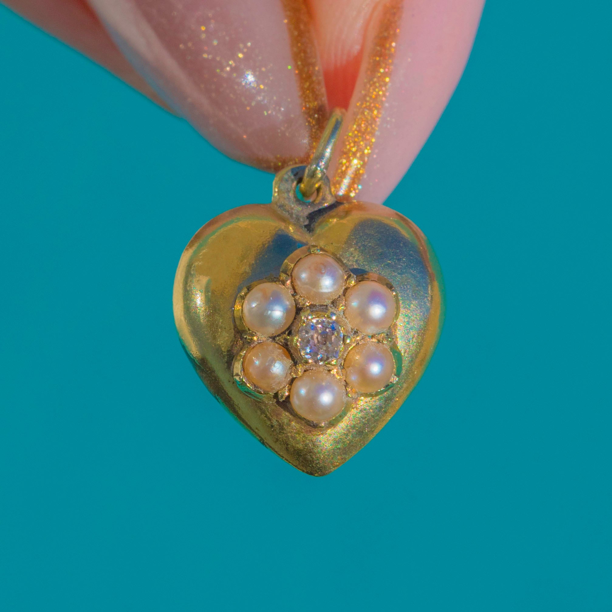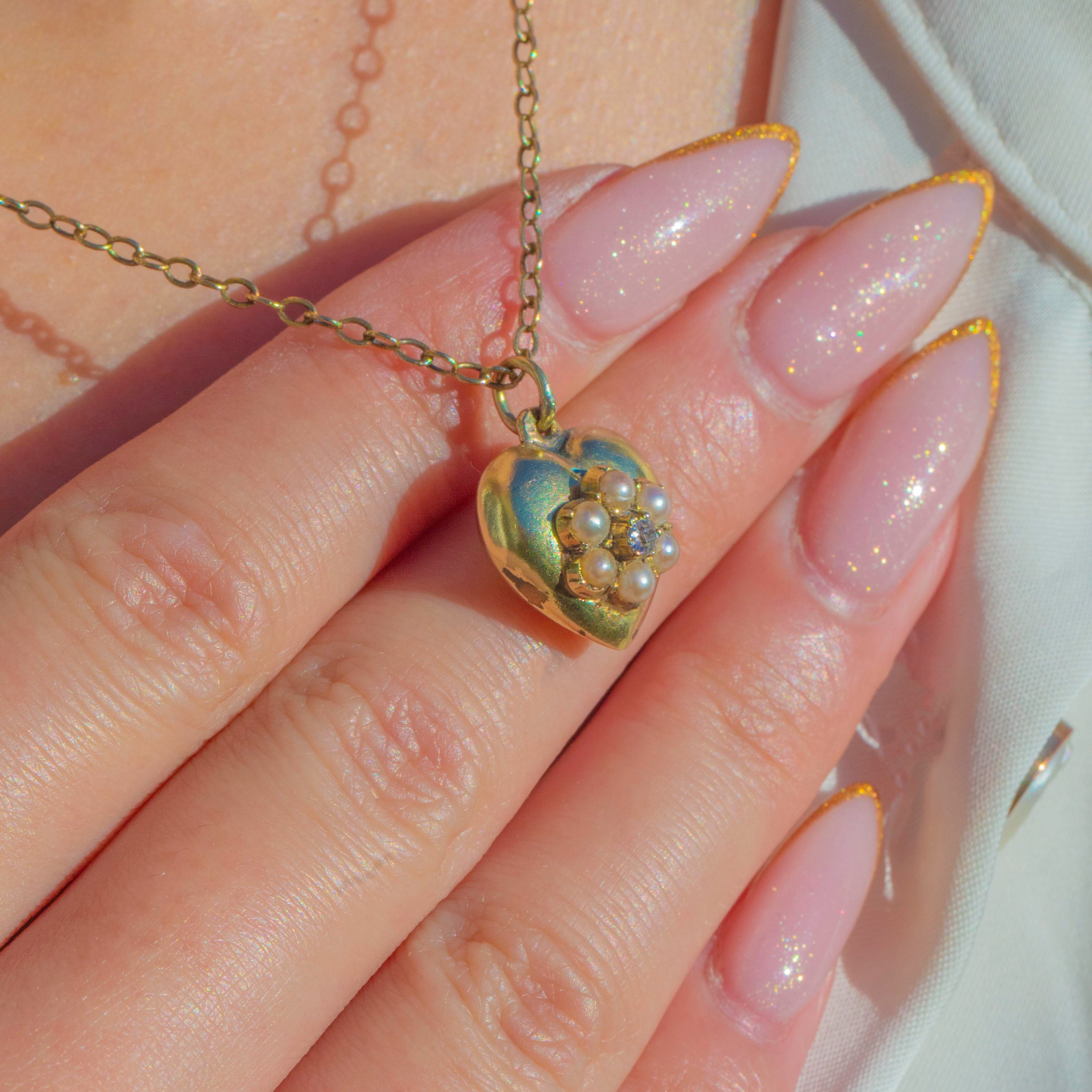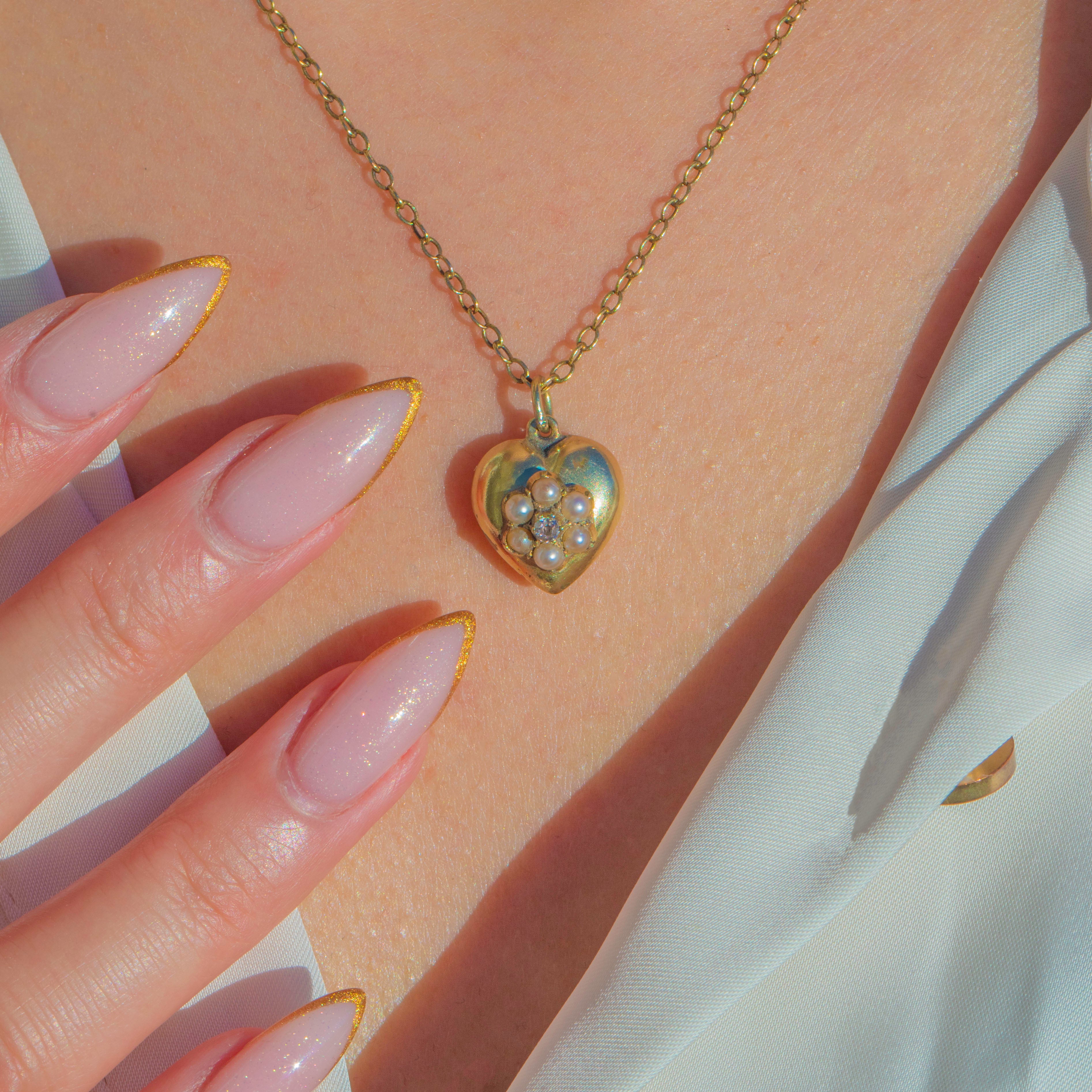 This beautiful late Victorian heart pendant is crafted in rich 15ct Gold and set with a sweet floral cluster of Pearls surrounding a single Diamond at the centre. The Pearls have a soft antique lustre, and the Diamond adds a delicate sparkle that elevates this romantic little treasure.