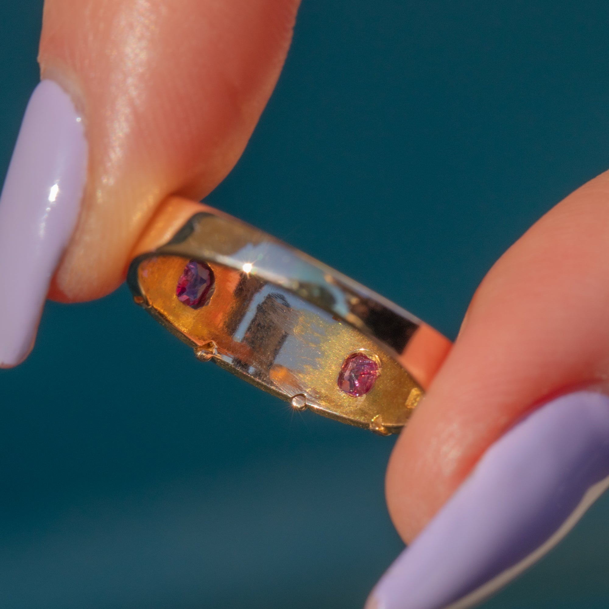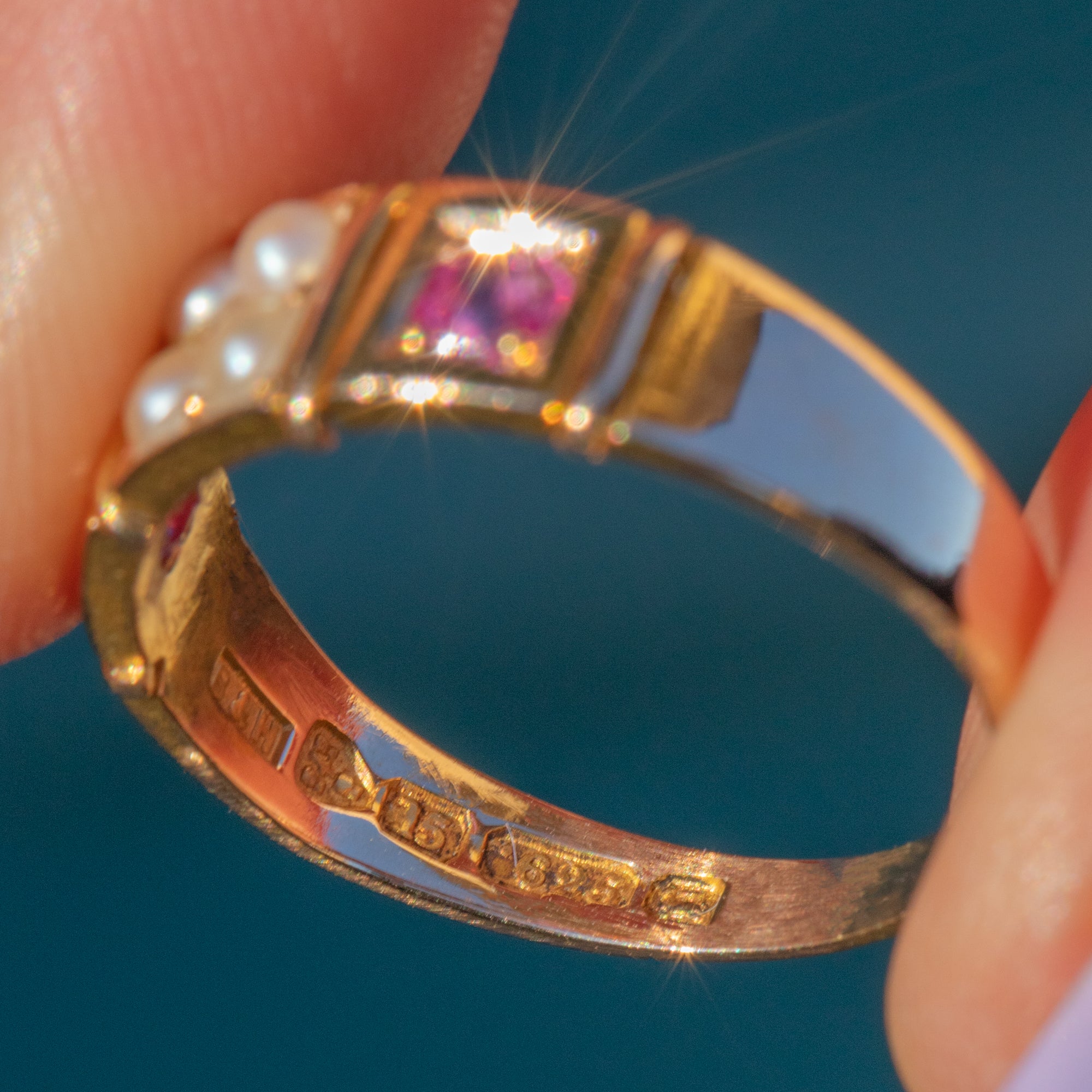 EXCELLENT. This Victorian 15ct Gold pink Sapphire and Pearl gypsy ring is in excellent condition! The gemstones are securely set and free from damage and the Gold is bright with a wonderful sheen. The band has a full set of chunky antique hallmarks inside- what a treat!