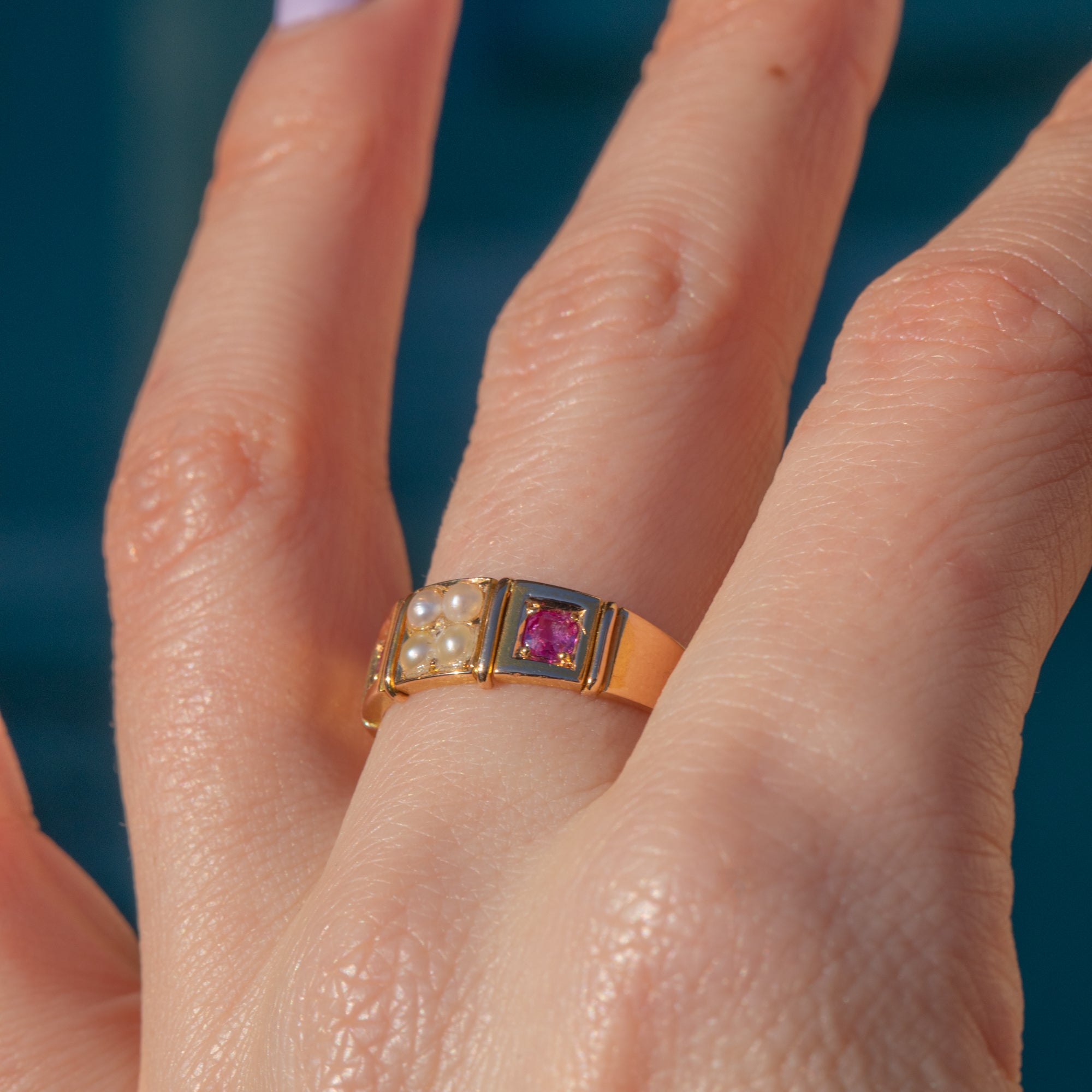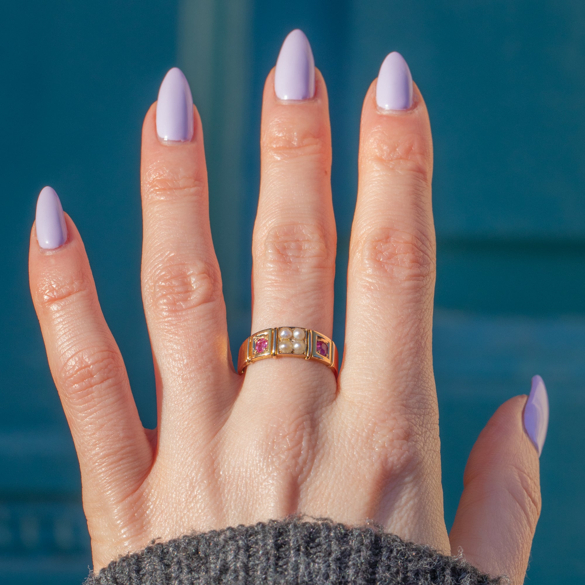 Victorian 15ct Gold Pink Sapphire Pearl Gypsy Ring, c.1880