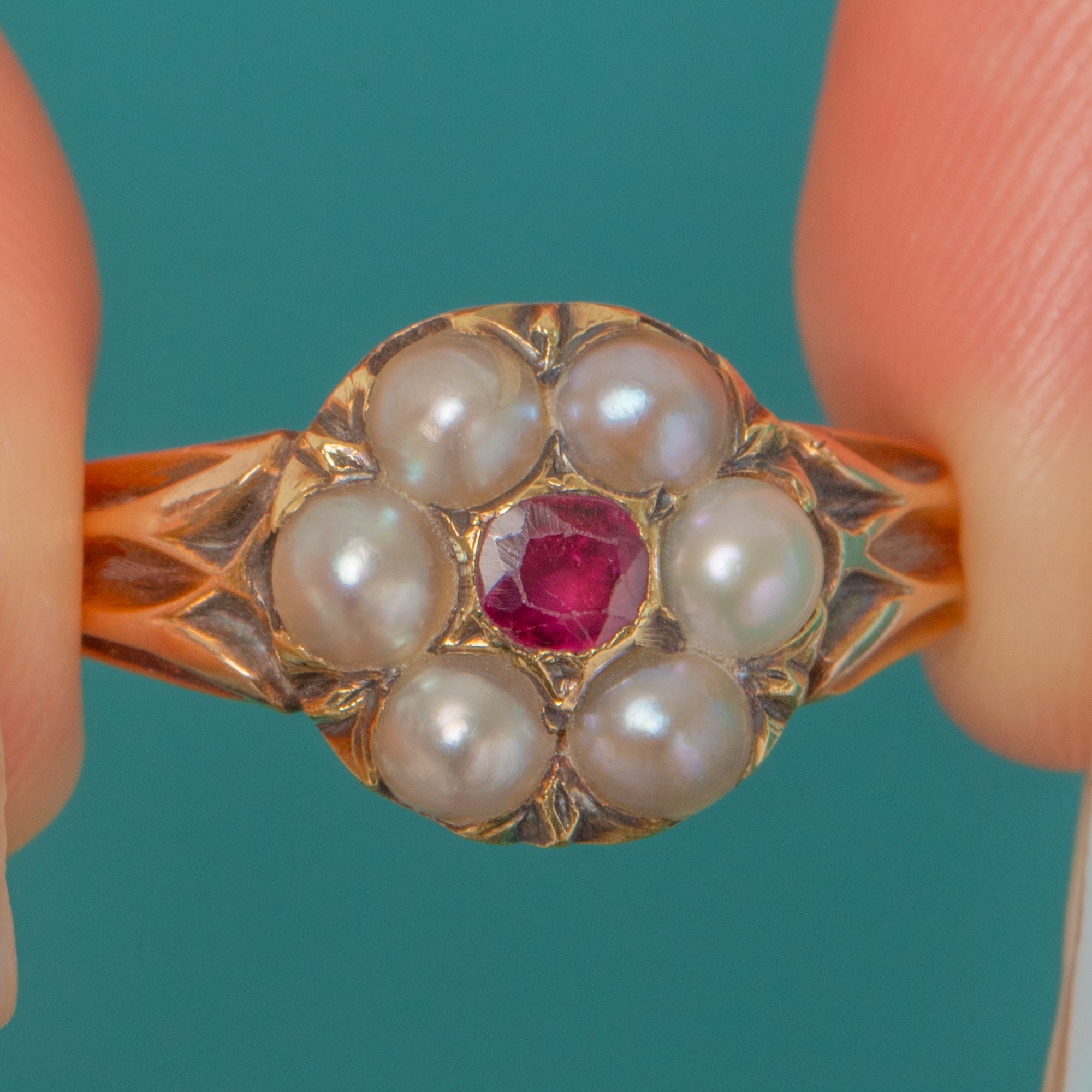 Pretty as a posy, this Victorian 15ct Gold cluster ring centres a lively round Ruby, haloed by six creamy Pearls in a classic daisy formation. The floral head is framed by a scalloped, star-edged setting and flows into elegant split, chased shoulders for a delicate, romantic silhouette.