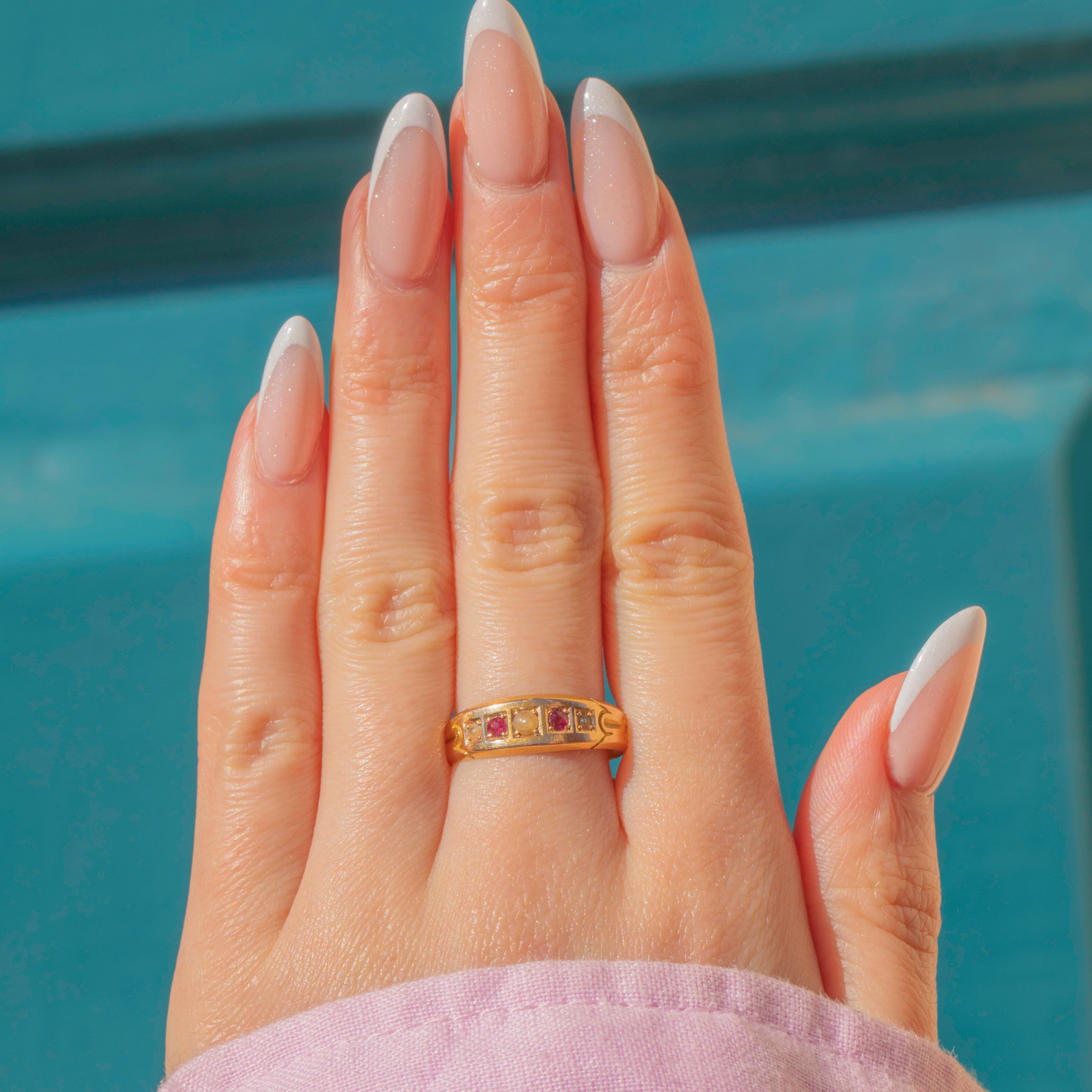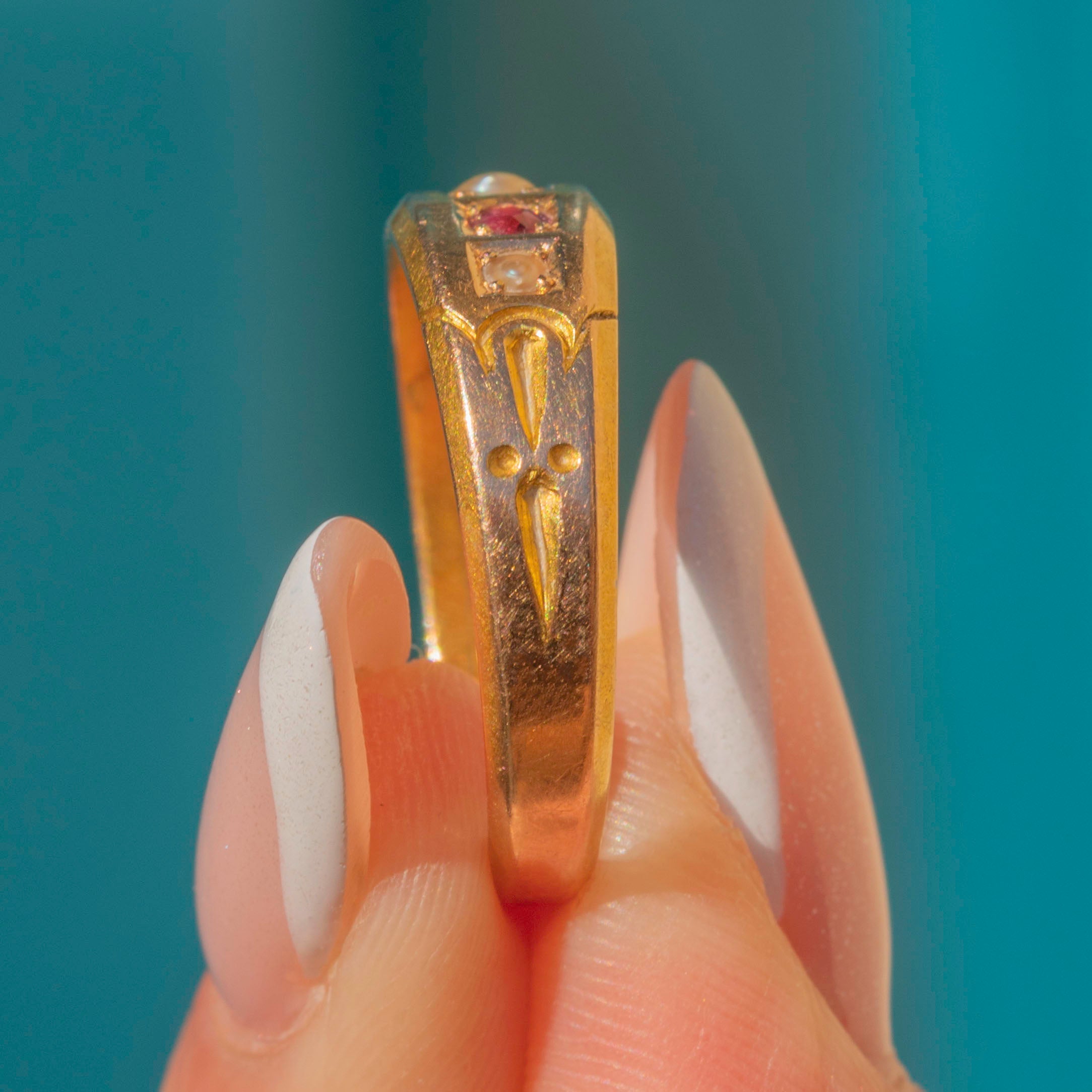 Crafted from saturated 15ct Gold, this five stone gypsy ring features a mix of iridescent Pearls and saturated fuchsia Rubies. Her gemmy ring face is flanked by engraved shoulders, giving this Victorian ring a lovely decorative finish.