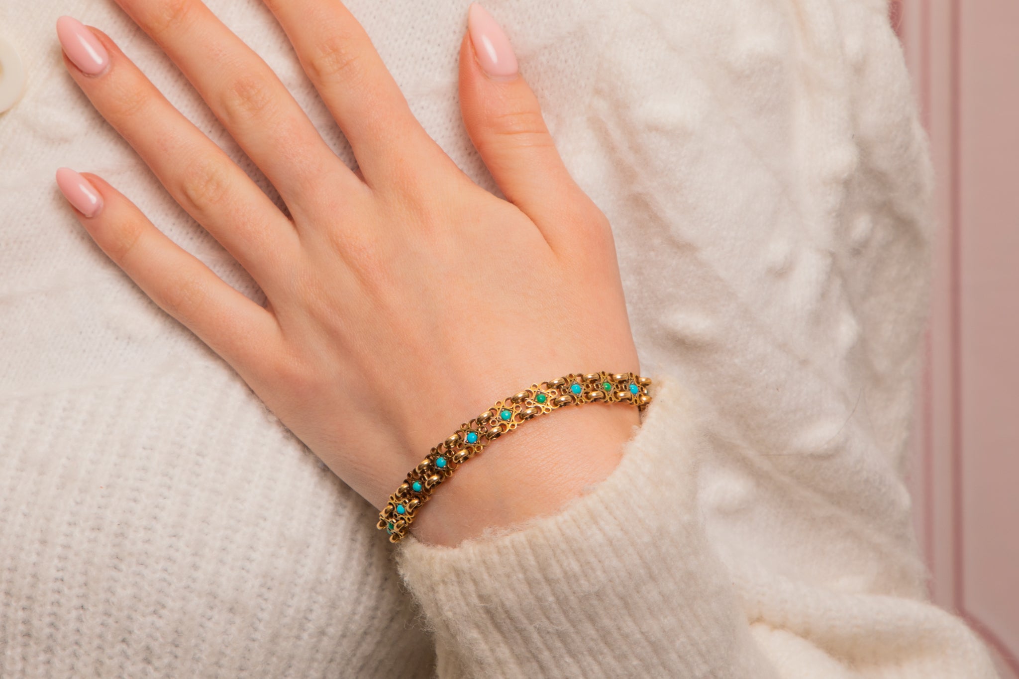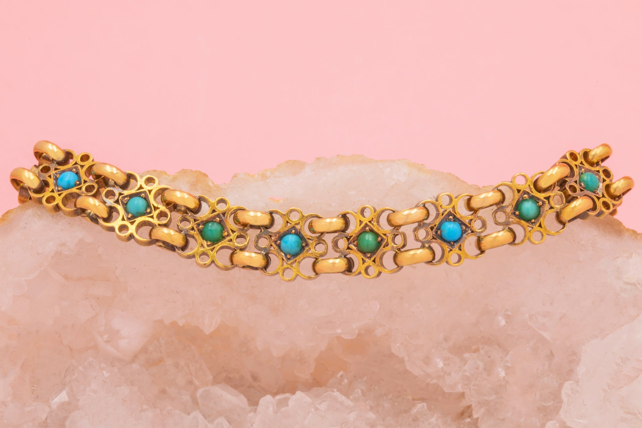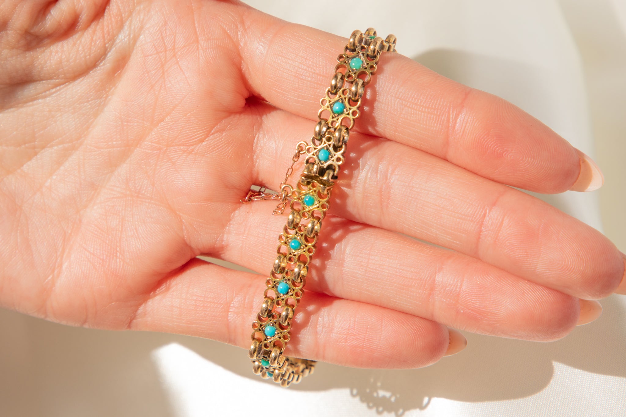 How delightful is this Victorian 15ct Gold Turquoise bracelet! Each geometric link is formed of filigree-inspired wirework crafted from honey-hued 18ct Gold. At the centre of each link sits a Turquoise cabochon flaunting a spectrum of blues between them, they stand out from afar contrasting against the glossy Gold.