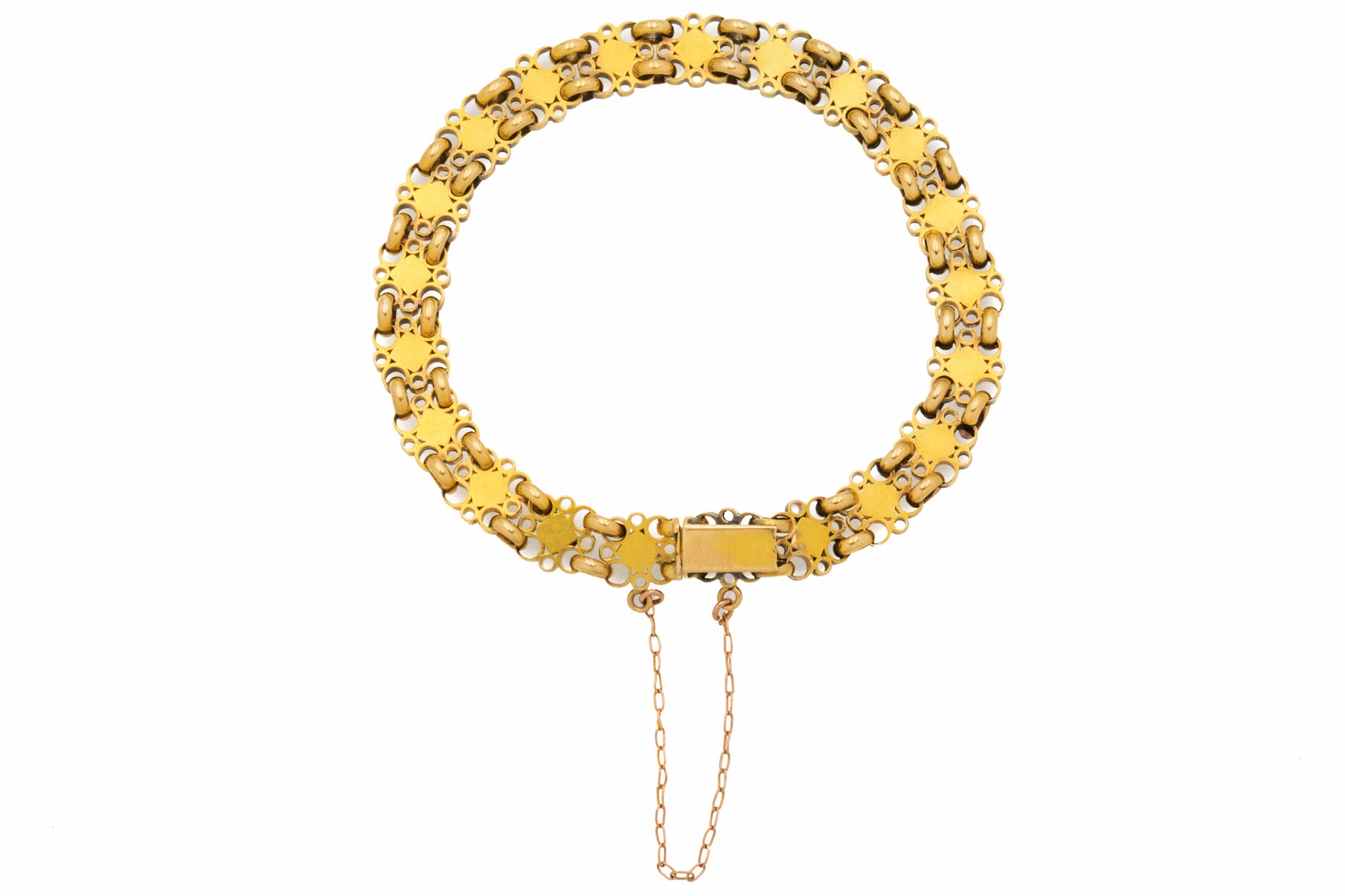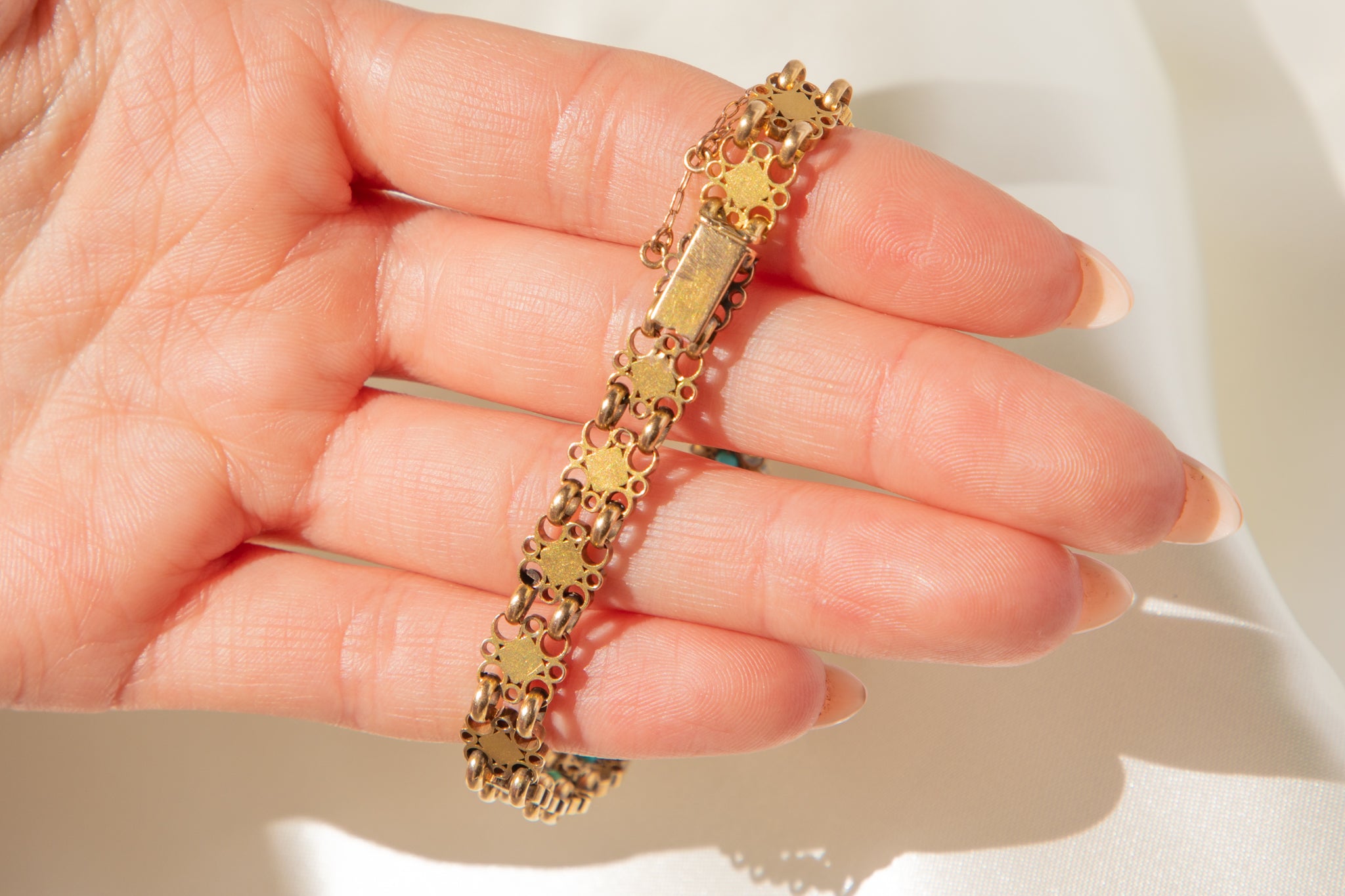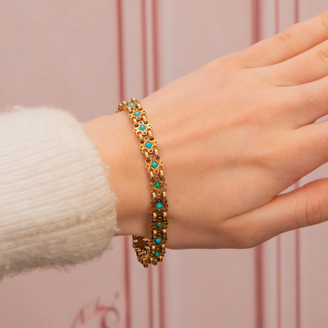 How delightful is this Victorian 15ct Gold Turquoise bracelet! Each geometric link is formed of filigree-inspired wirework crafted from honey-hued 18ct Gold. At the centre of each link sits a Turquoise cabochon flaunting a spectrum of blues between them, they stand out from afar contrasting against the glossy Gold.