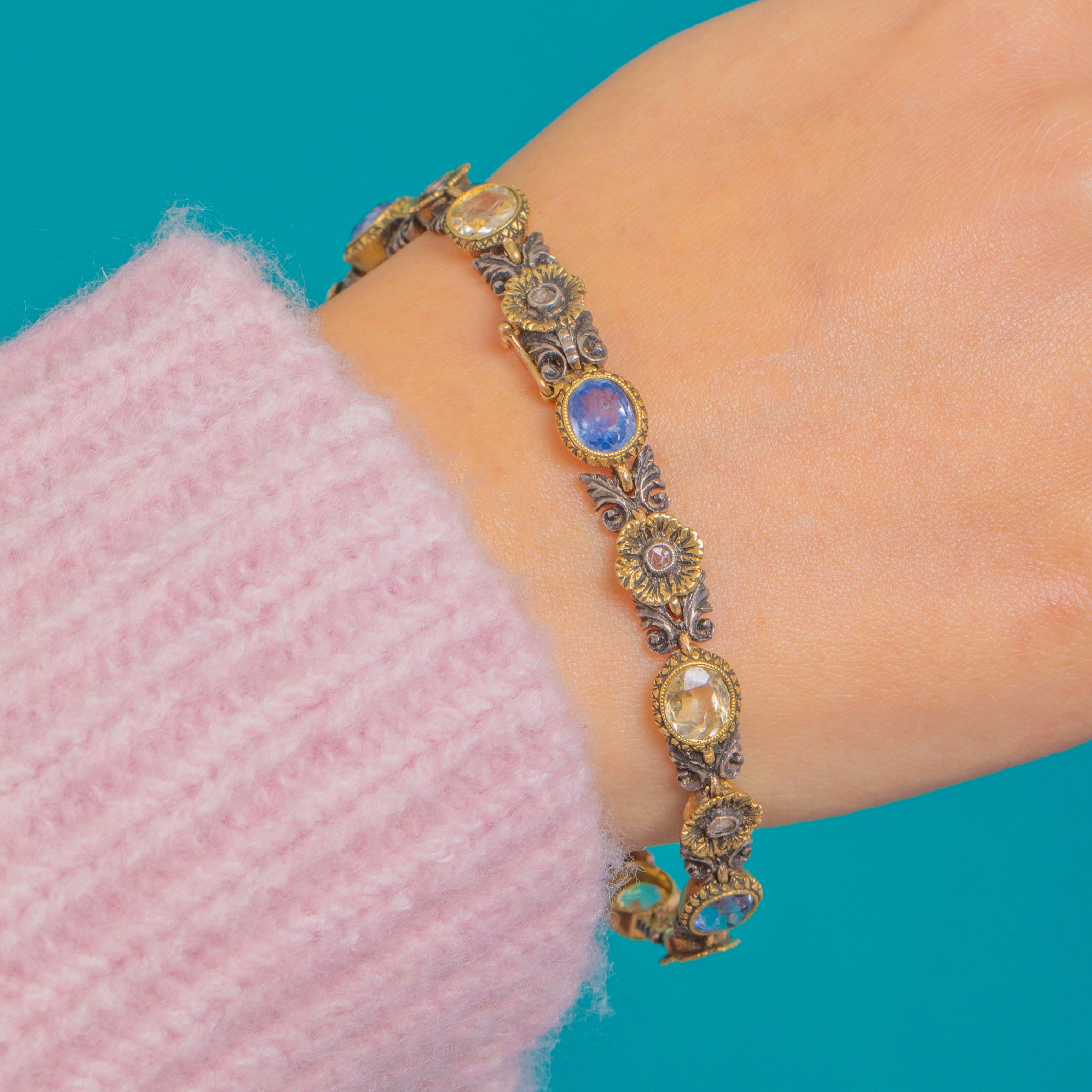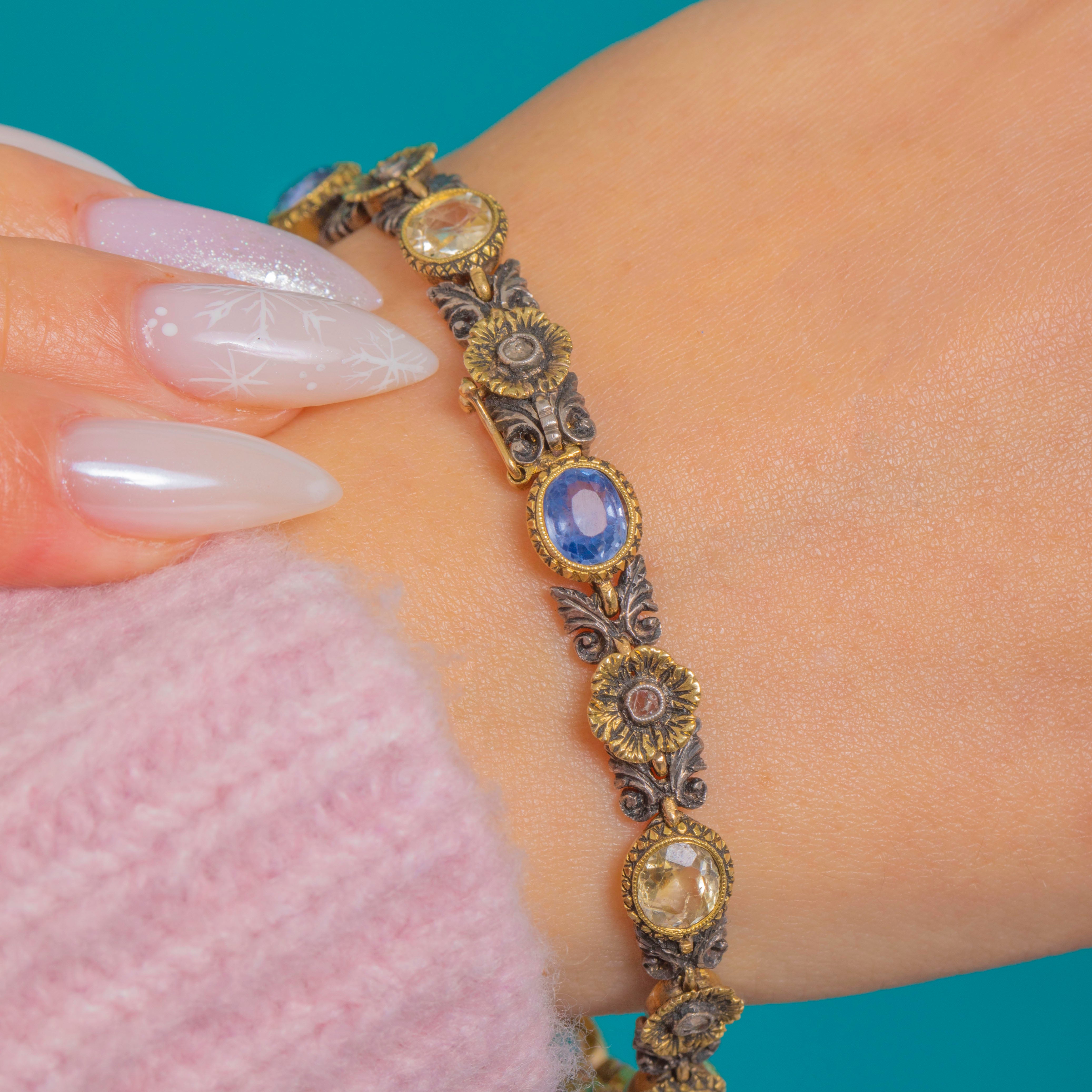 Richly detailed and wonderfully wearable, this Victorian bracelet marries Natural Blue and Yellow Sapphires with delicate rose-cut Diamond accents in ornate foliate and rosette motifs. Crafted in 18ct Gold and Silver, the two-tone palette and textured collet settings lend a refined, romantic character typical of the period.