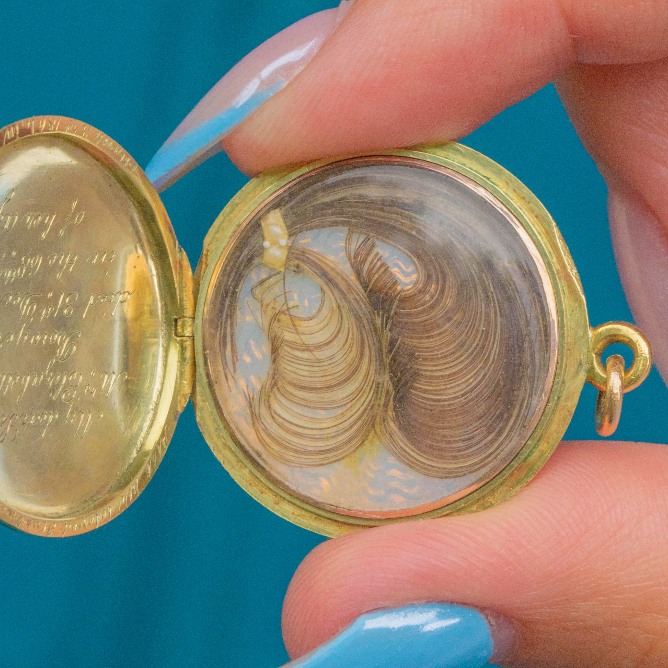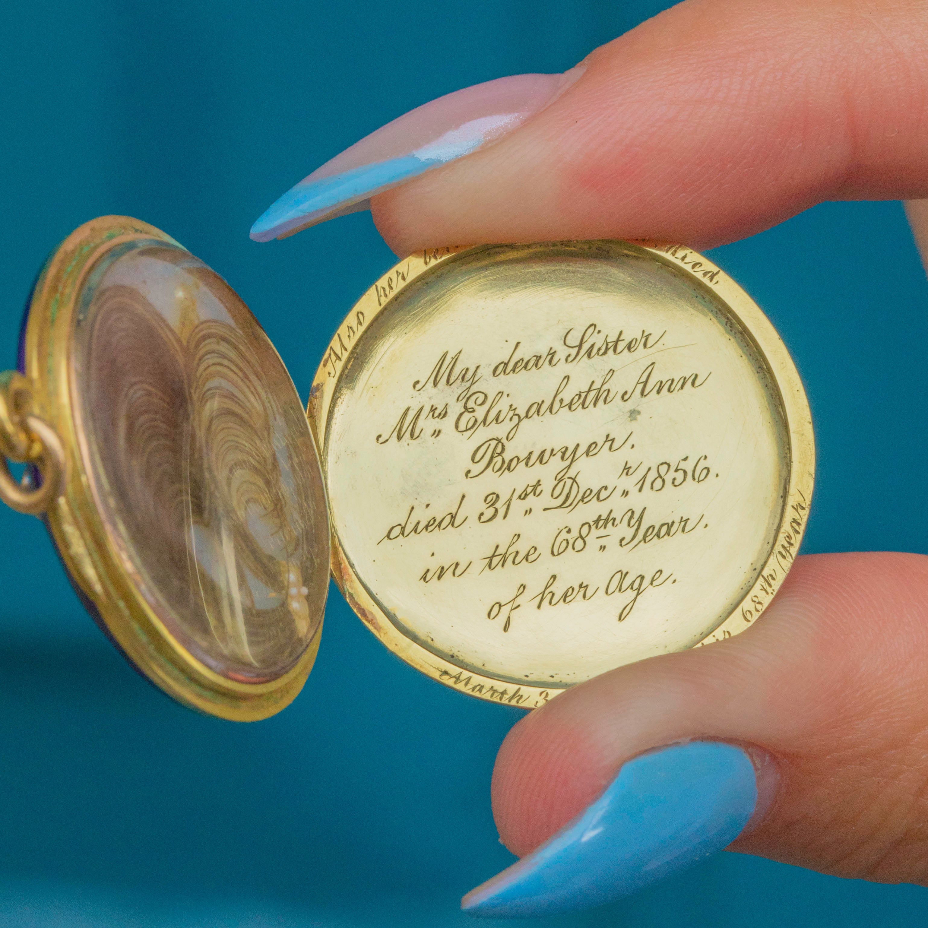 This delicate locket features a Pearl-encrusted flower accented by a Diamond centre. Upon her opening, she boasts a lock of hair on the left side of the locket and a hand-engraved message saying "My dearest Sister, Mrs Elizabeth Ann Bowyer. died 31st Dec 1856, in the 68th year of her age. Her beloved Husband also died March 3"' d 1864, in his 68th year."