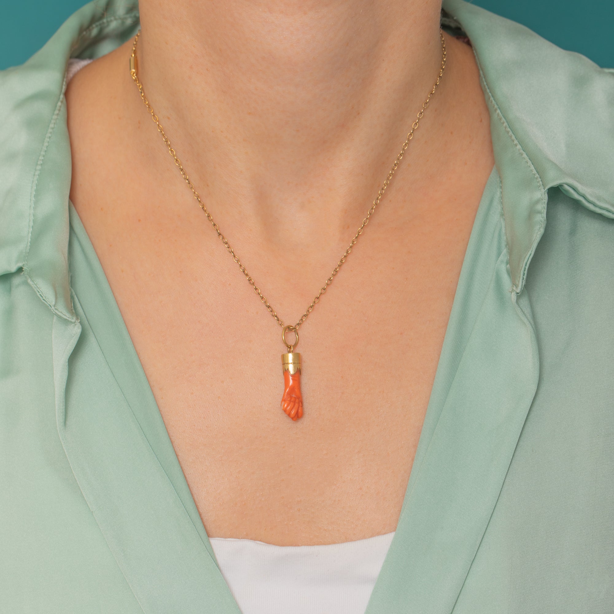 This antique figa charm is a beautifully preserved example of one of history’s most iconic protective talismans. Carved from natural Coral and mounted in glowing 18ct Gold, it carries all the symbolism and character that makes antique figas so collectable today.