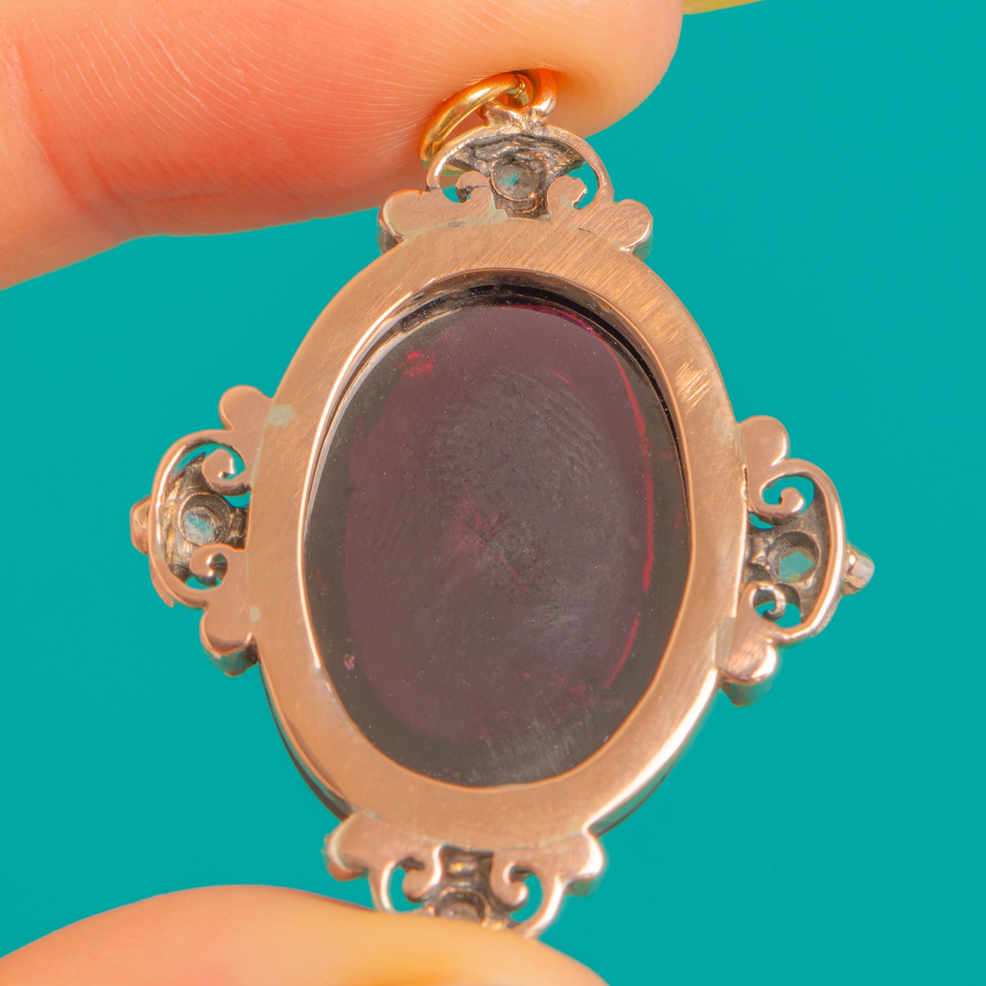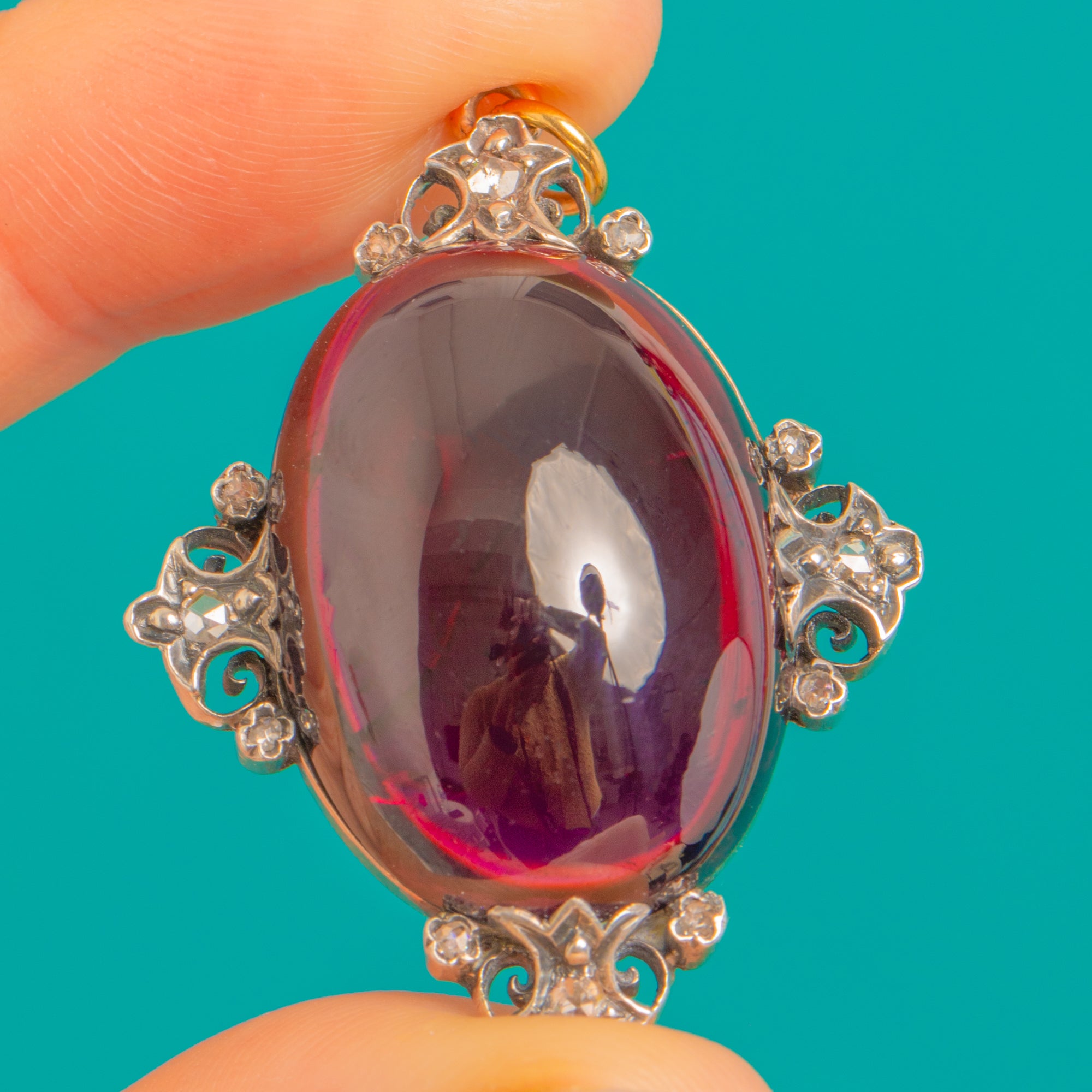 A sumptuous Victorian pendant centred by a highly domed Garnet cabochon of impressive presence, glowing a deep purplish-red. The rich 18ct Gold mount is accented with Sterling Silver settings, each sprinkled with antique rose-cut Diamonds for a delicate, scintillating halo. Ornate foliate and scrollwork terminals frame the stone, lending the piece its romantic, theatrical allure.