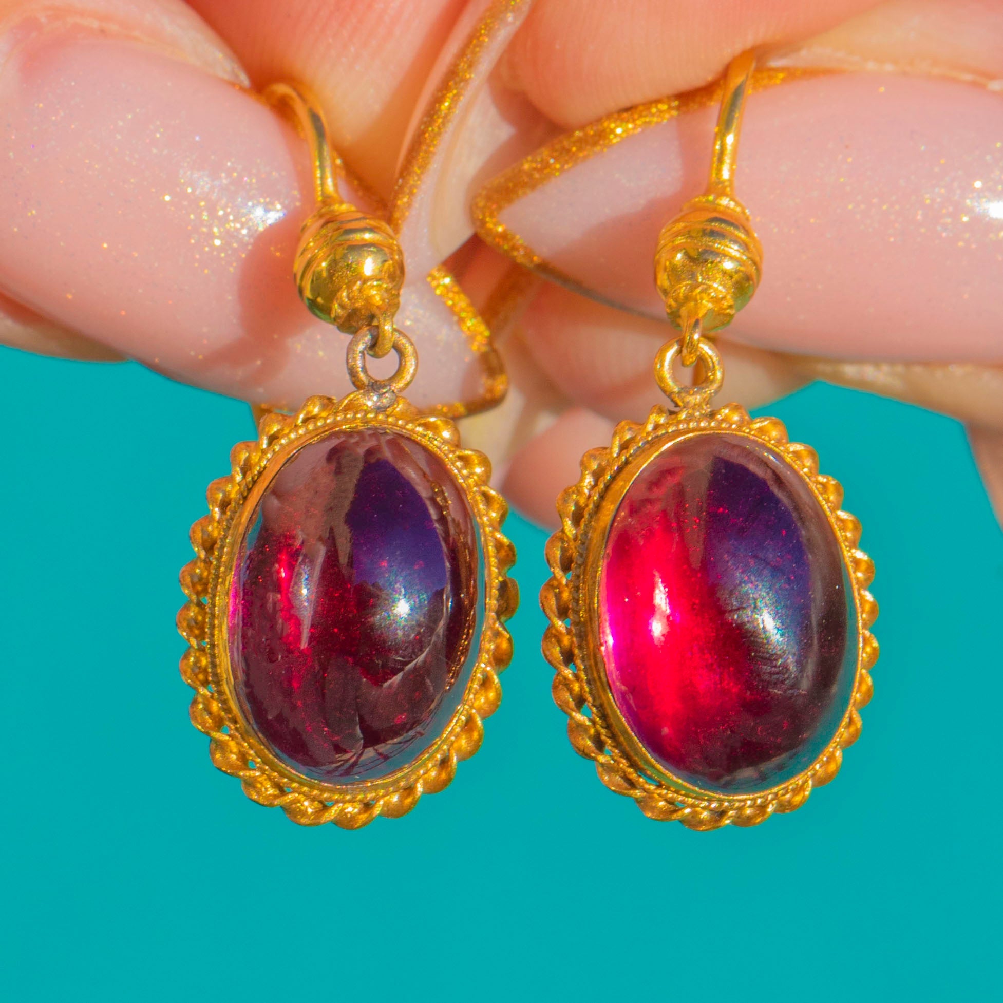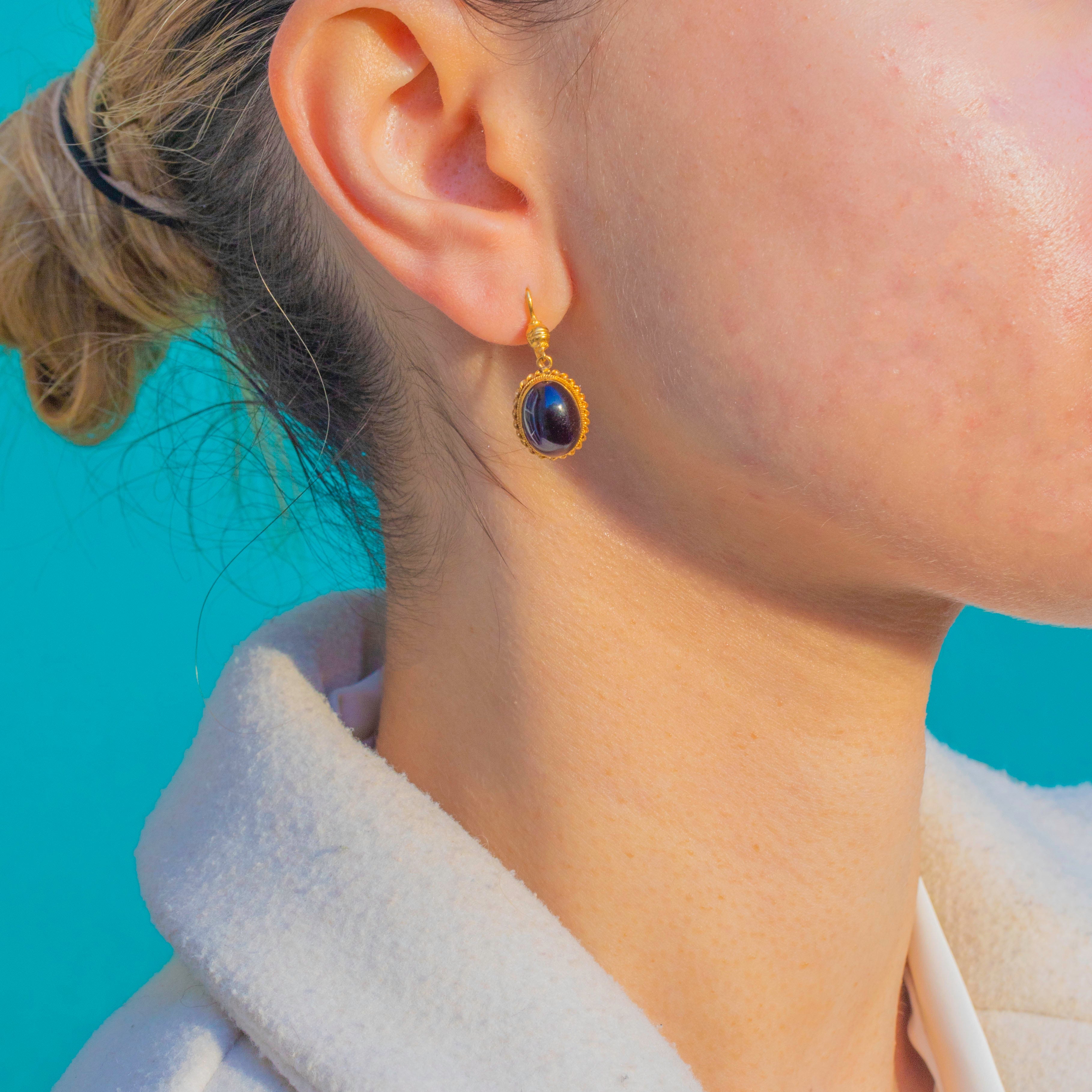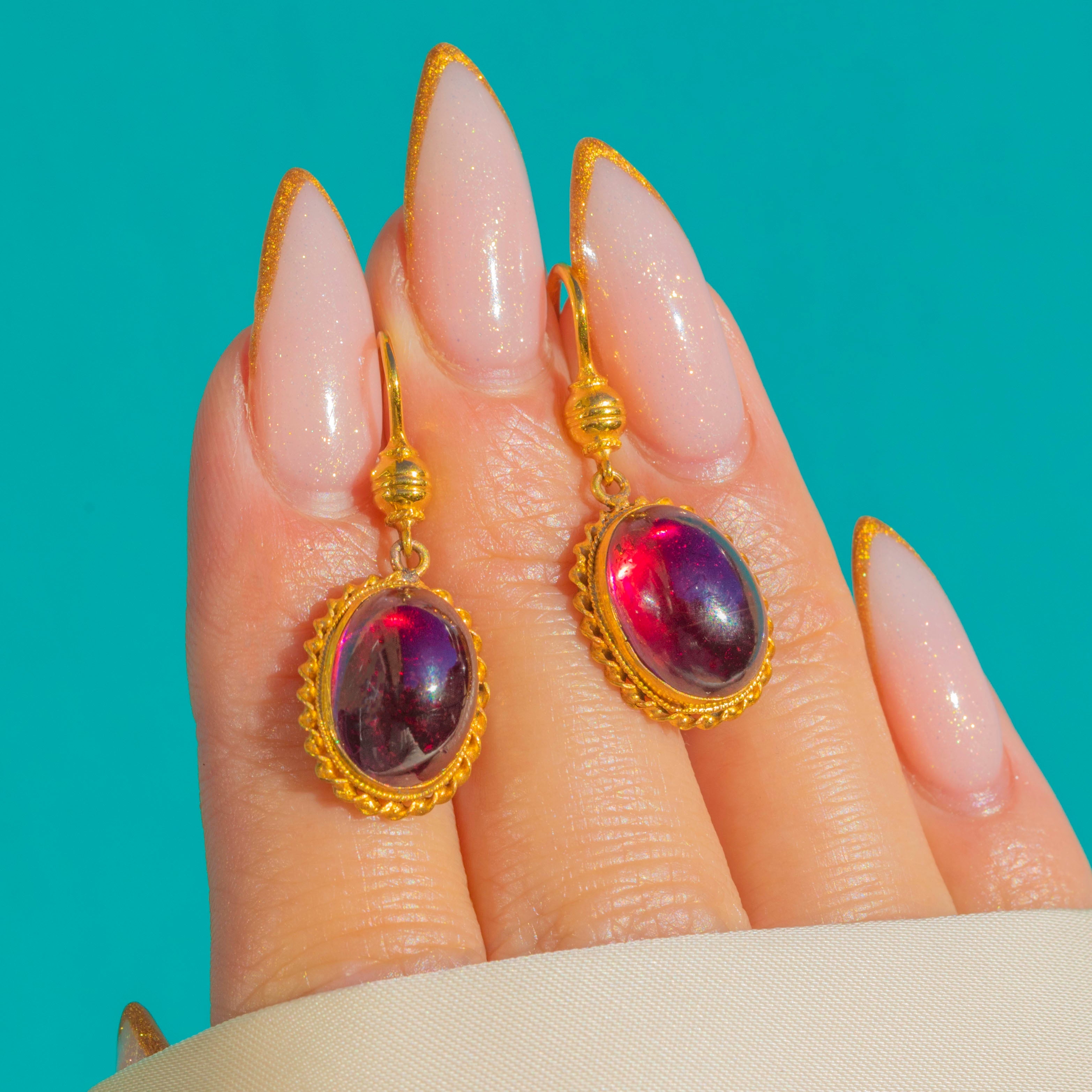 These Victorian 18ct Gold Garnet earrings are a glowing and elegant pair, each set with a rich red Garnet cabochon of exceptional size and colour with a total of 10.70cts!