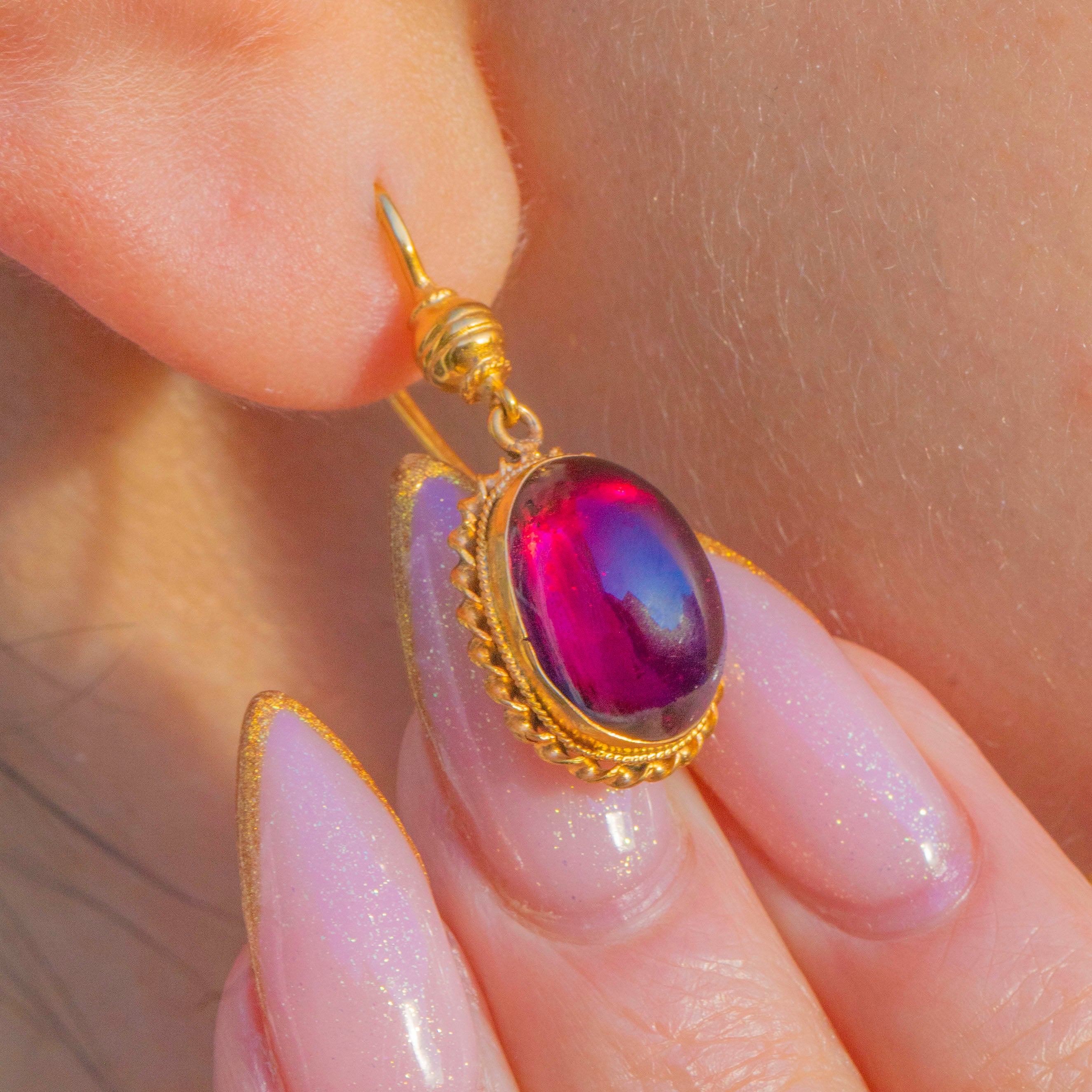 The deep berry tones and smooth domed surface catch the light beautifully, giving the earrings a luxurious and romantic feel.