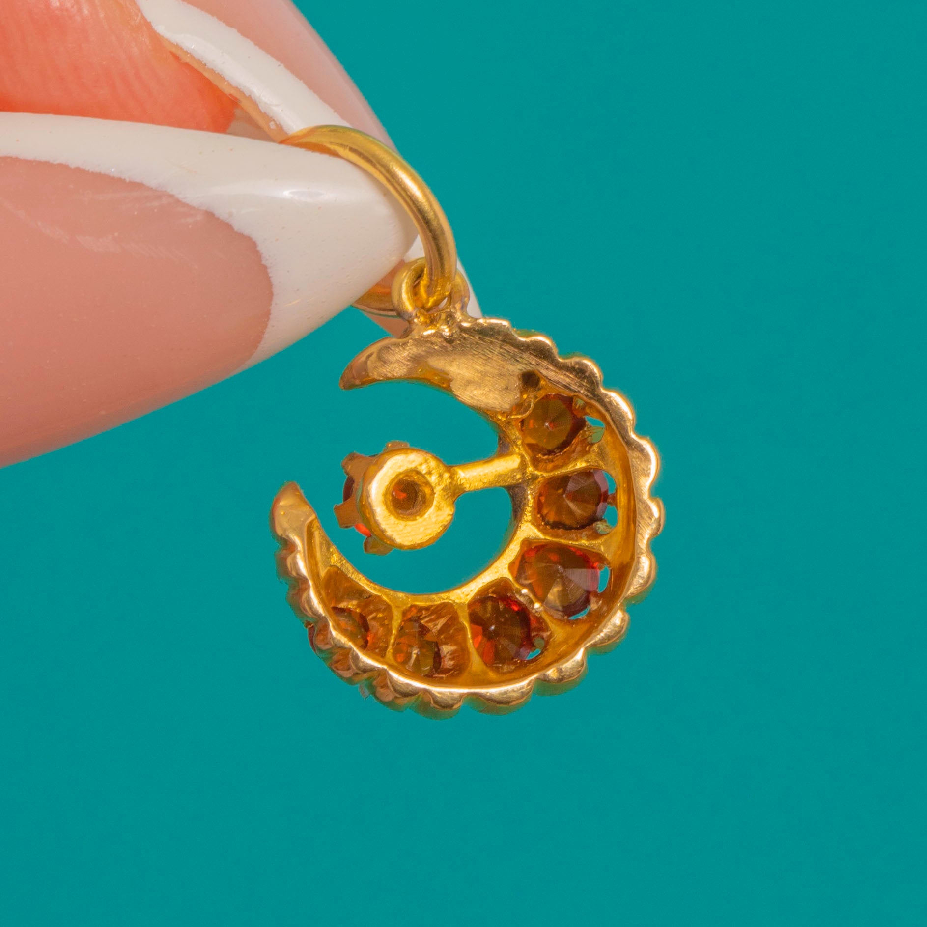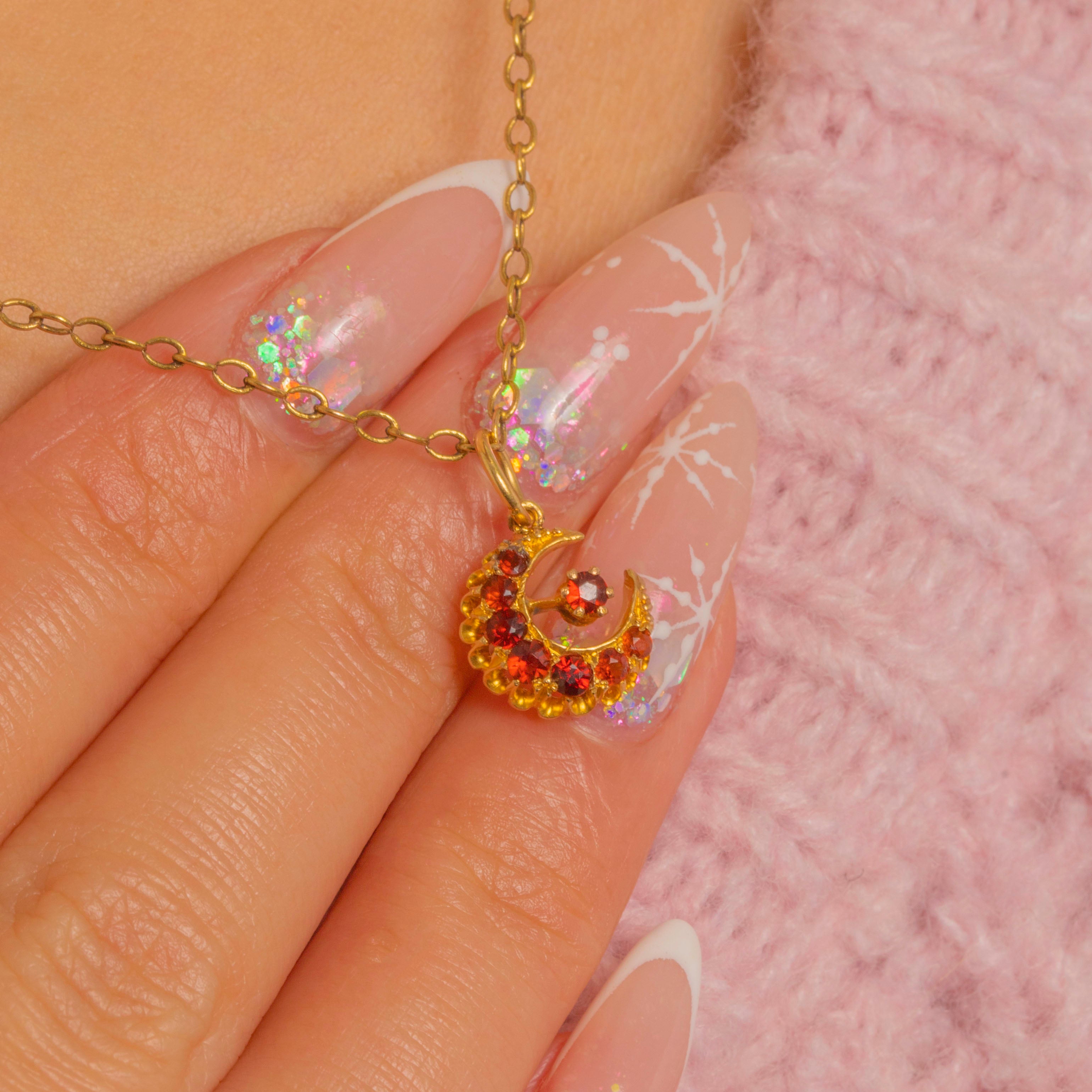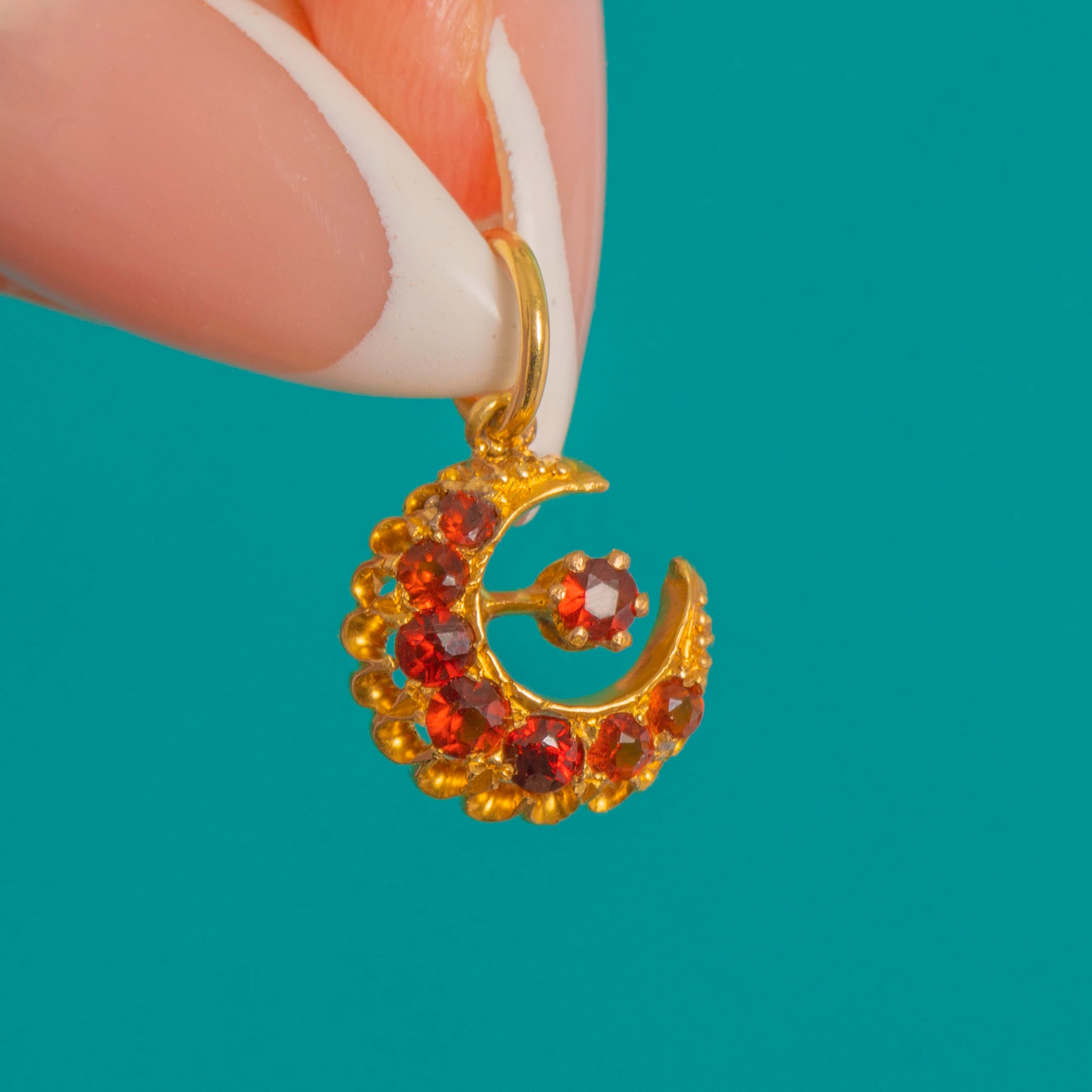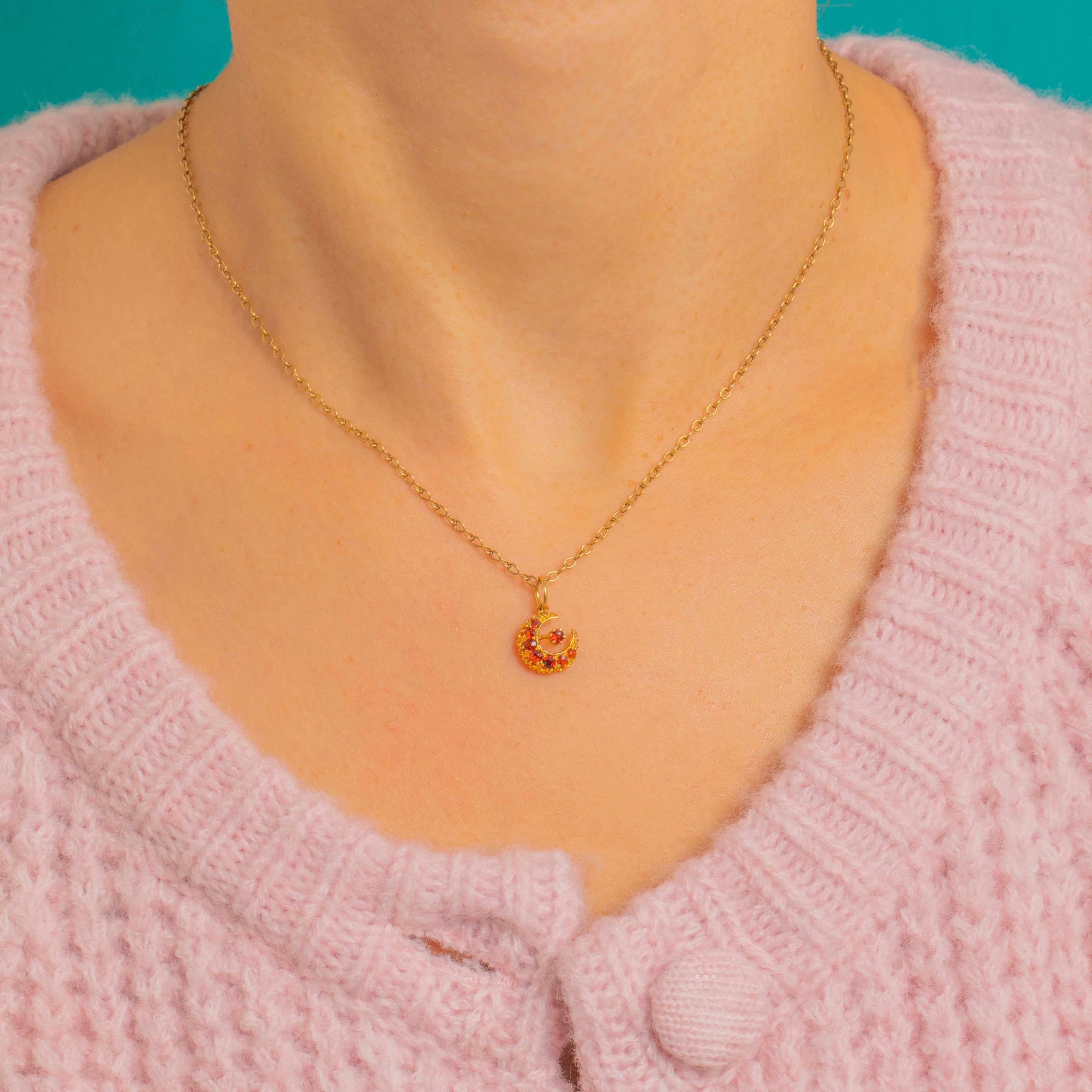 A radiant Victorian treasure, this crescent pendant glows with deep red Garnets set in warm 18ct Gold. The arc of perfectly matched round-cut stones catches the light beautifully, while a single Garnet sits poised at the centre on a delicate Gold stem for a playful, celestial flourish.