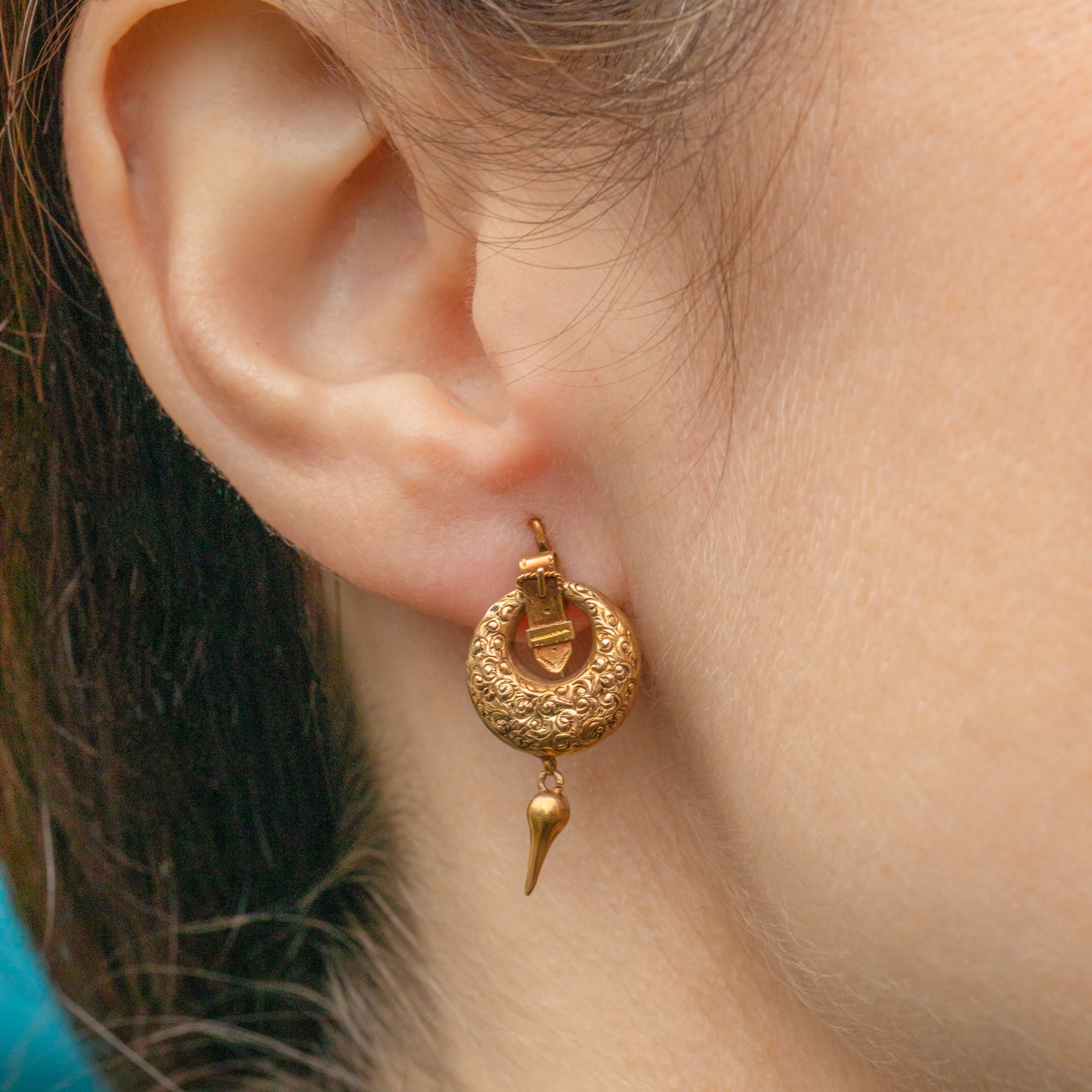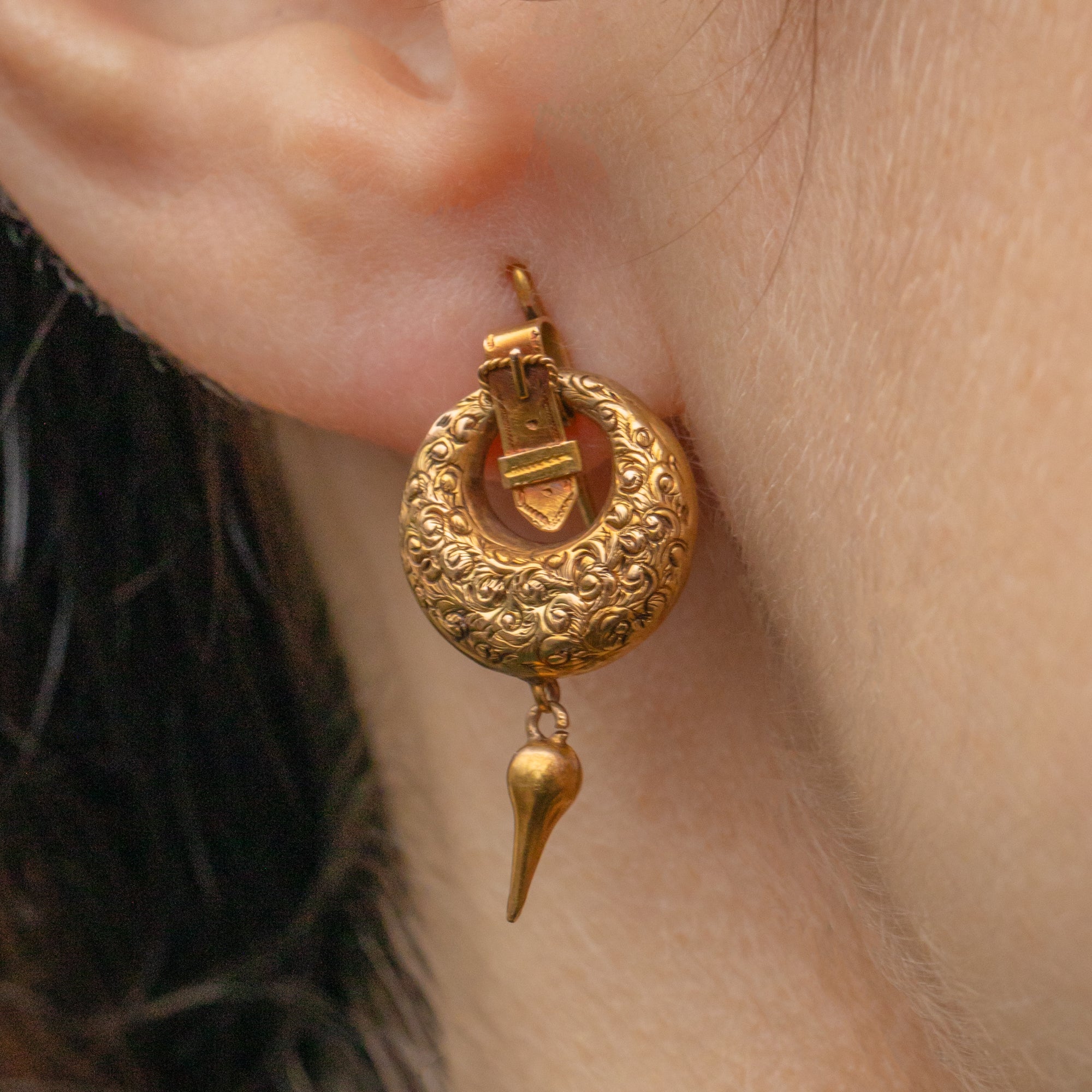 VERY GOOD. These Victorian 18ct Gold repoussé hoop earrings are in very good condition. The details are crisp and intricate and the Gold is brightly saturated. There is some minor wear throughout, including a small ding on the front of one hoop and a missing prong on one buckle, but these are only noticeable under close inspection. With secure and comfortable hooks, these antique hoop earrings can be worn with confidence!