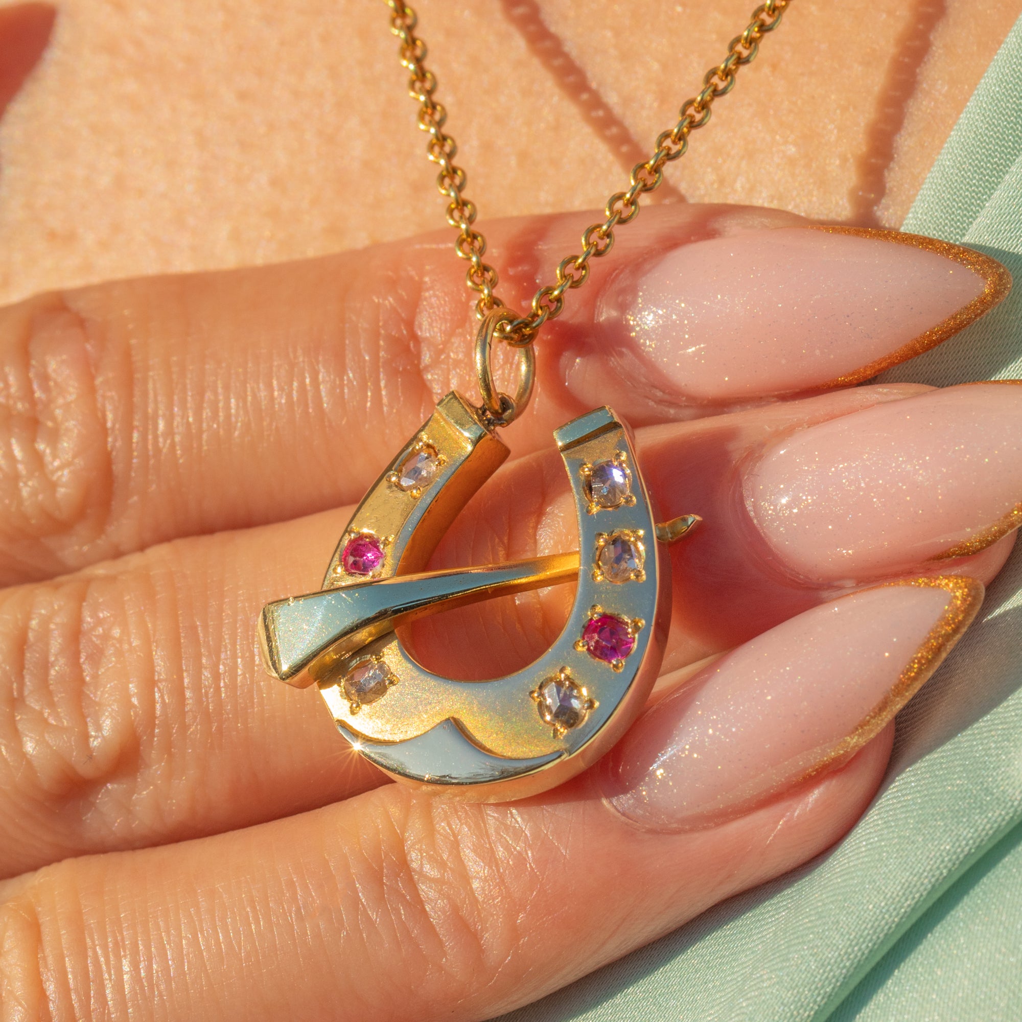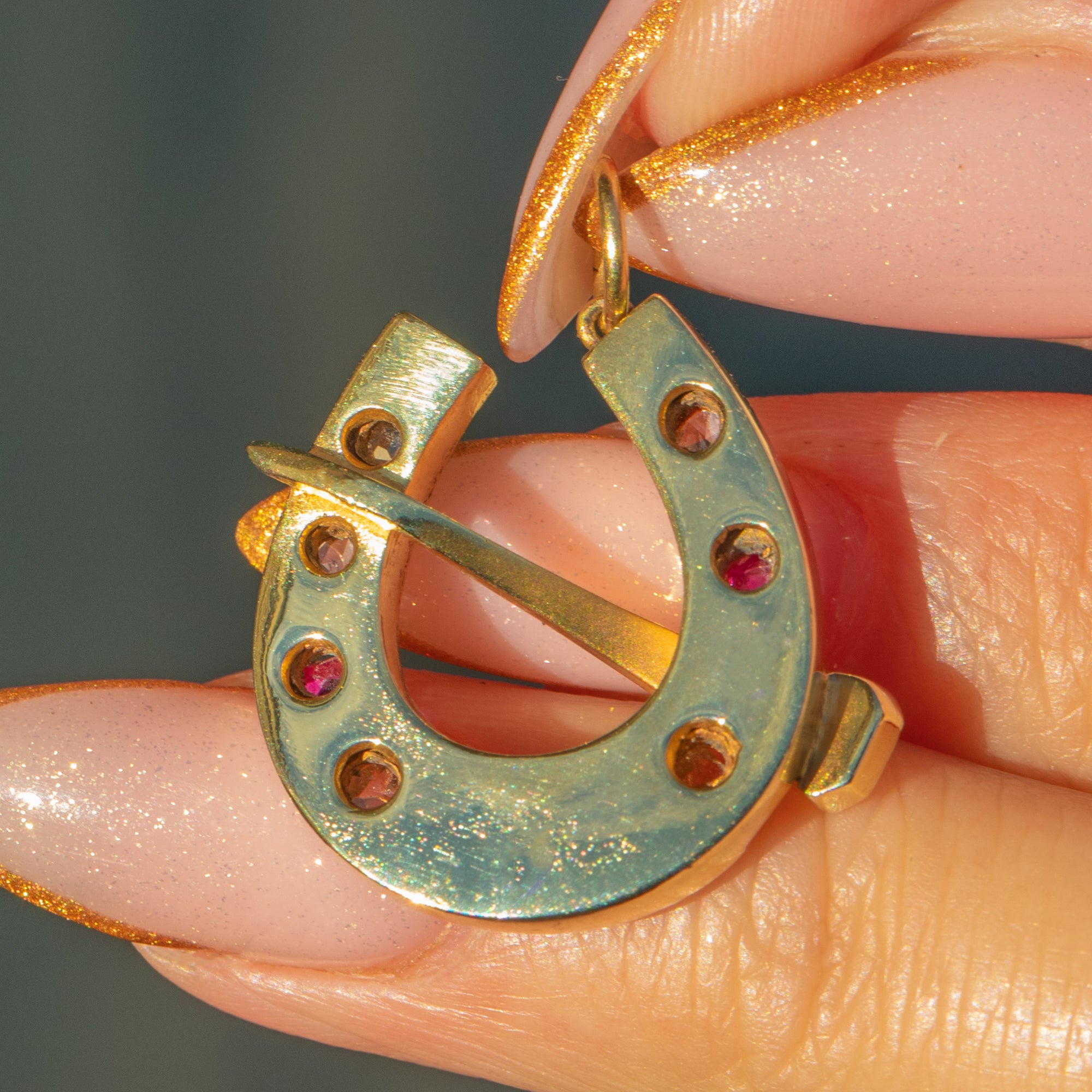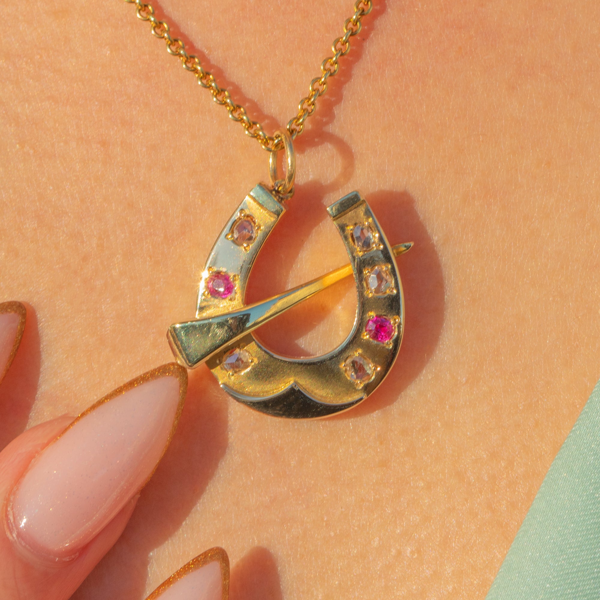 A sumptuous and beautifully made Victorian horseshoe pendant, crafted in heavy solid 18ct Gold and set with bright Rubies and sparkling rose-cut Diamonds. This is a luxurious example of the classic Victorian good-luck motif — richly coloured, wonderfully weighty, and full of antique character.