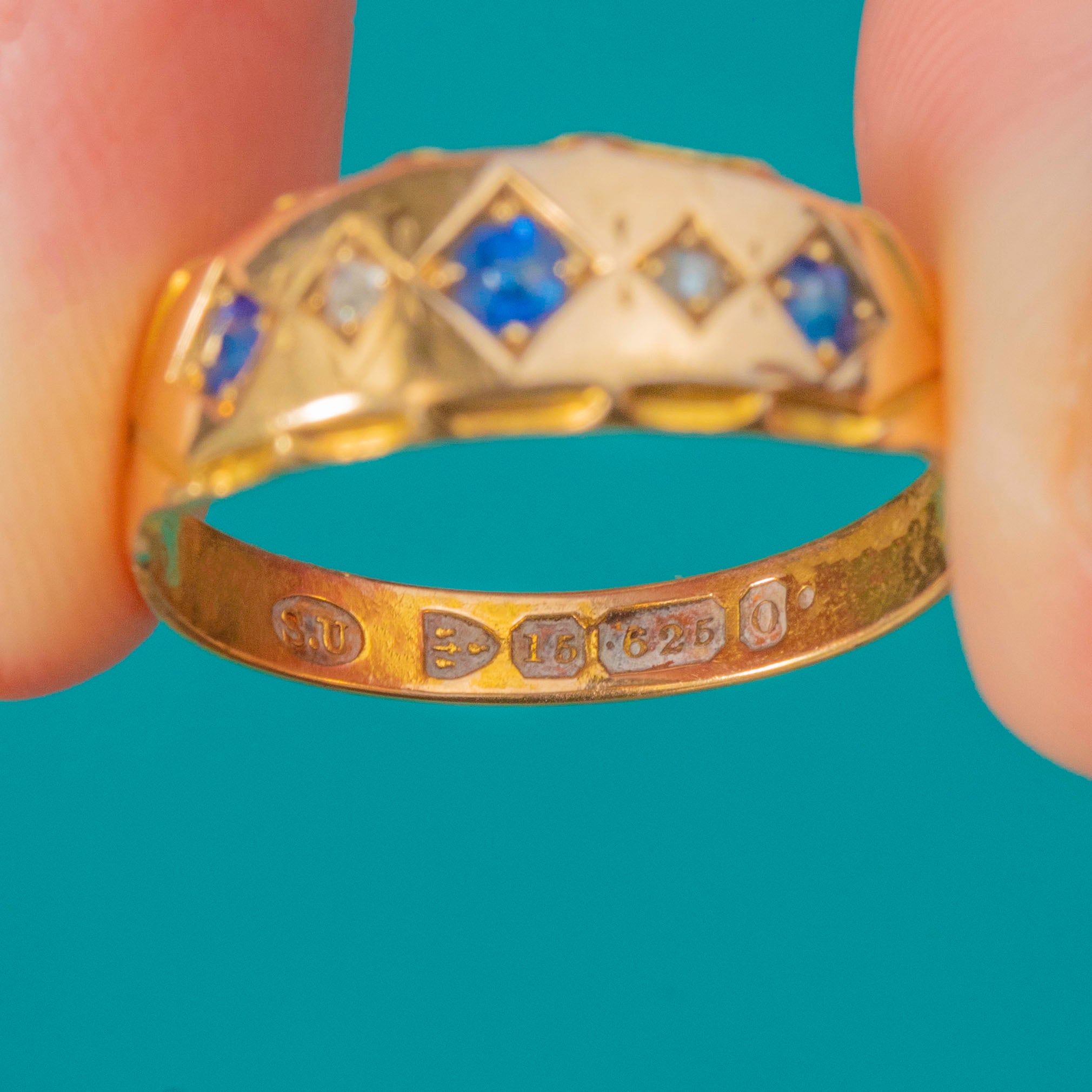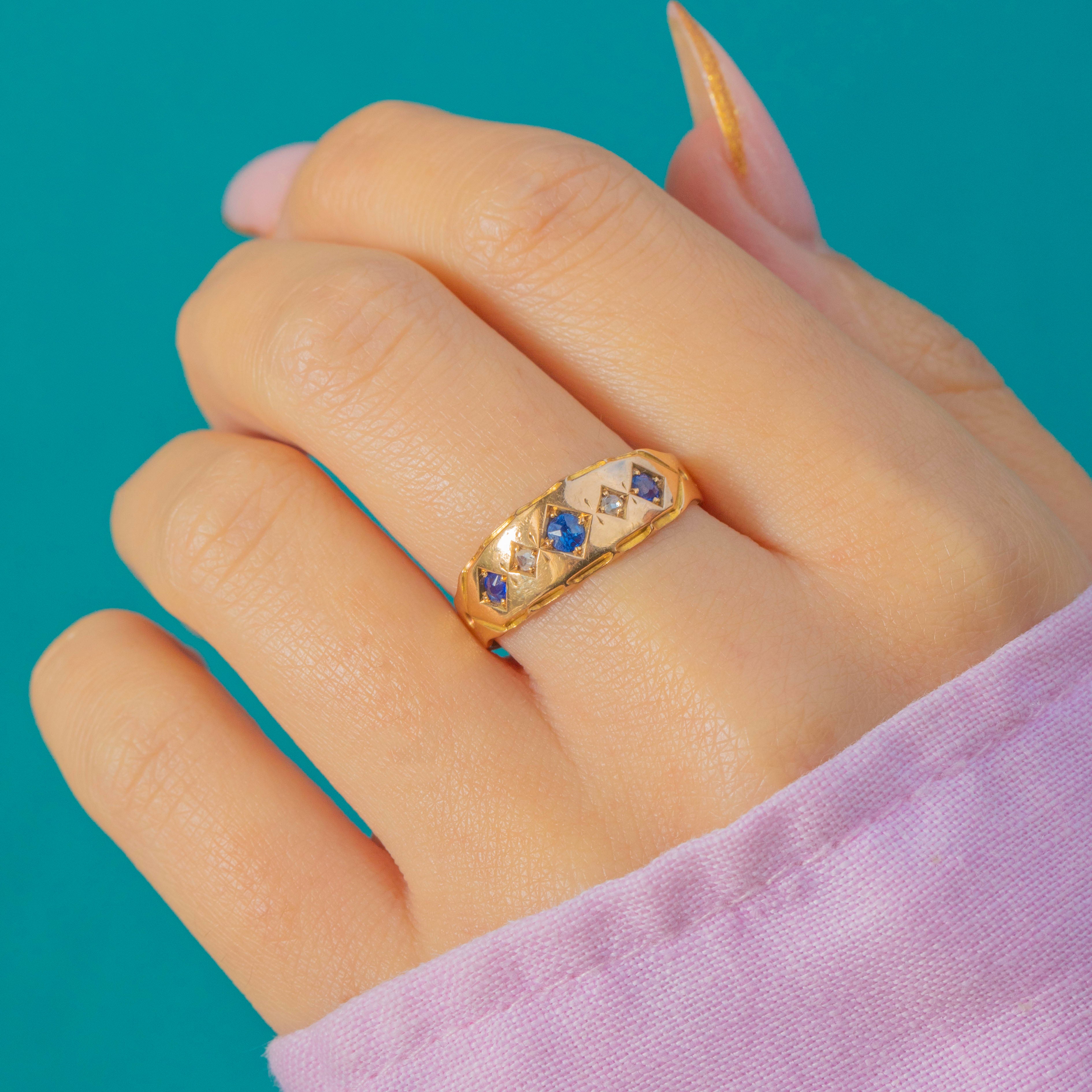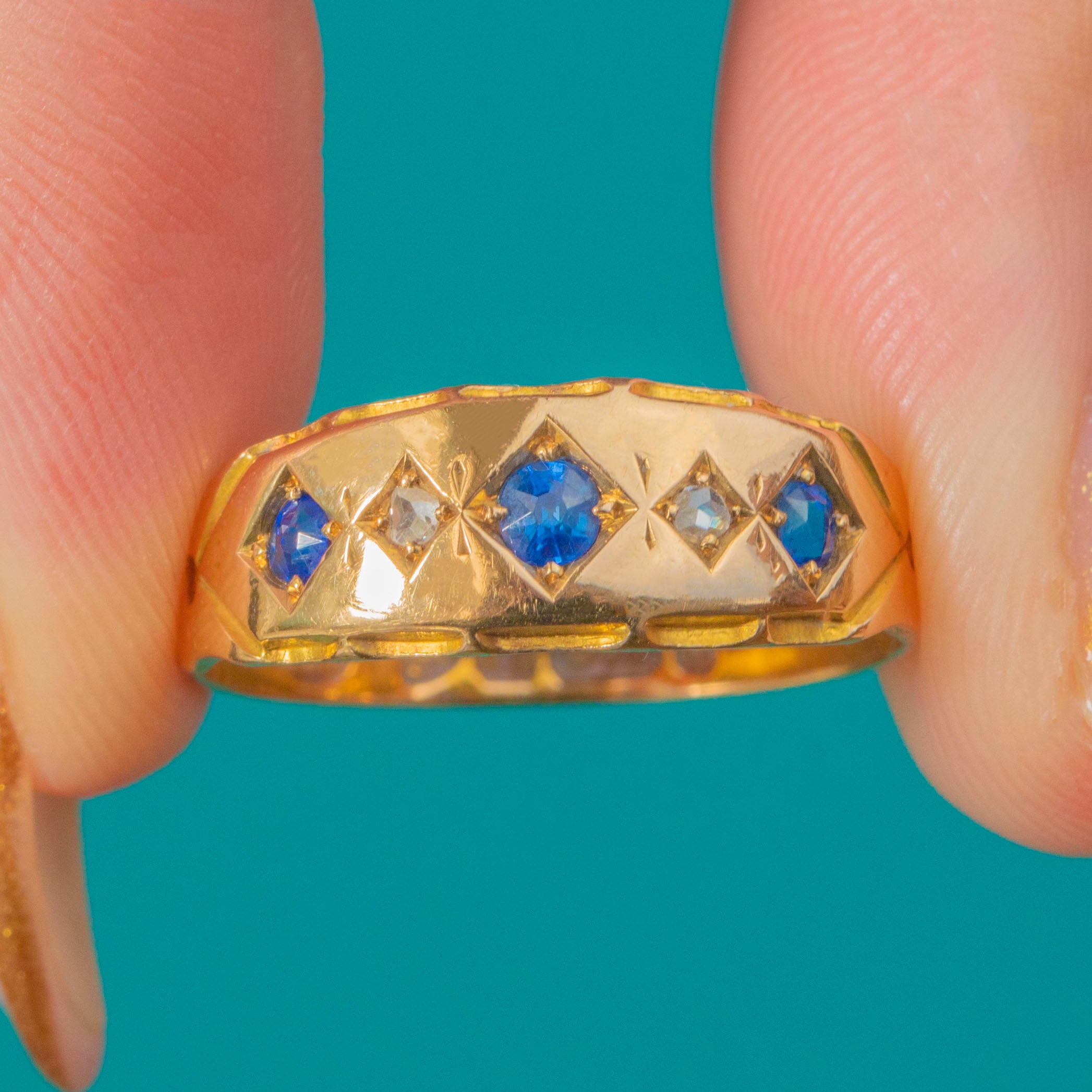 This Victorian five-stone gypsy ring, dated 1897, is a classic design set with bright blue Sapphires and sparkling Diamonds in a smooth, sculpted 18ct Gold band. The stones are flush-set within geometric settings, a hallmark of late-19th-century English craftsmanship.