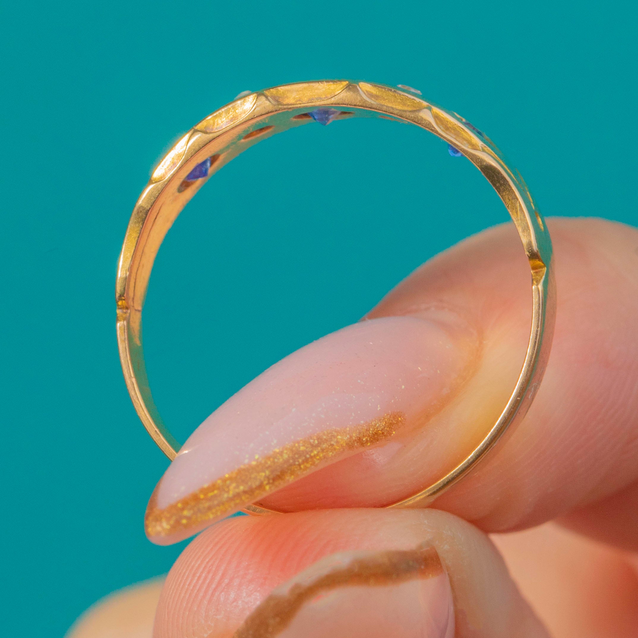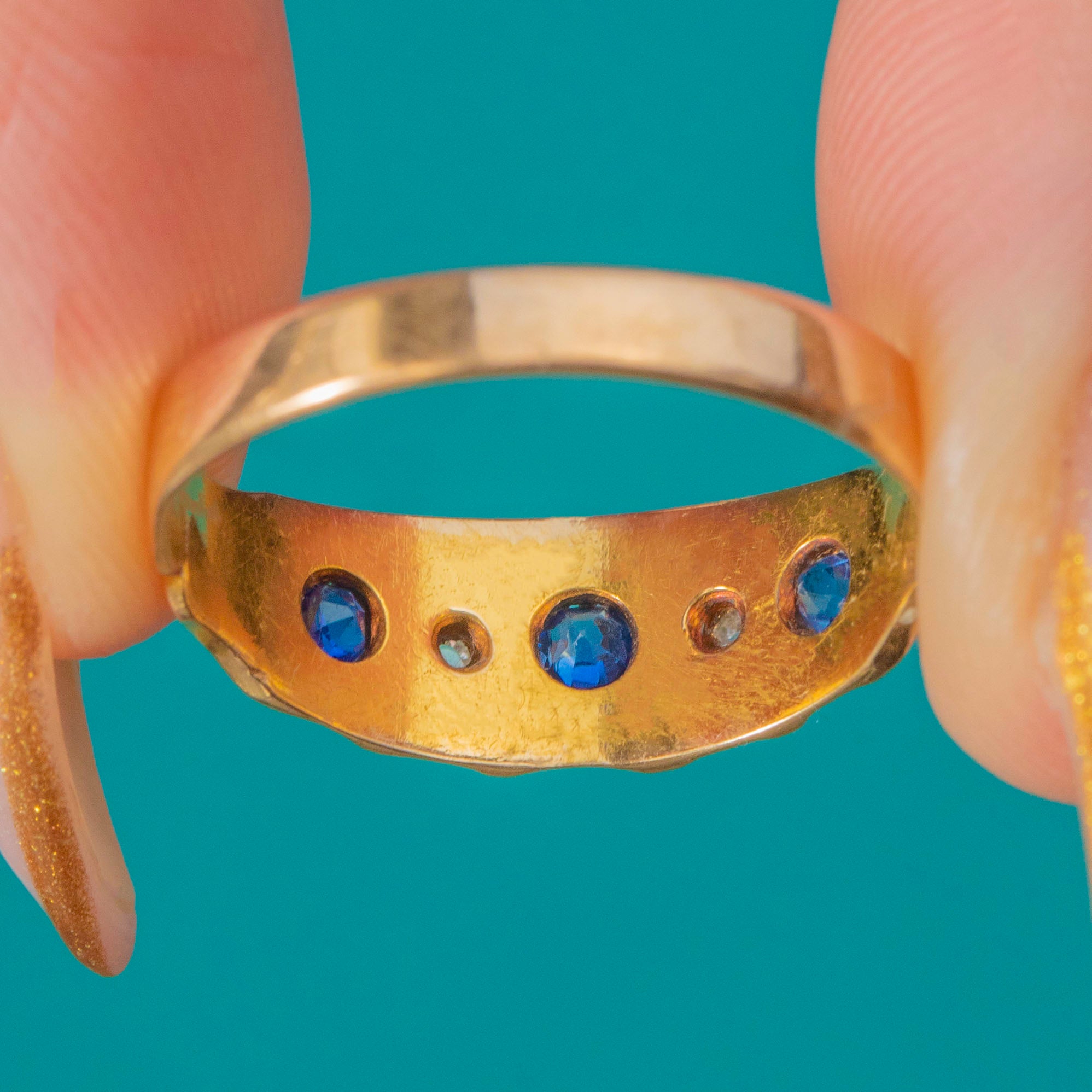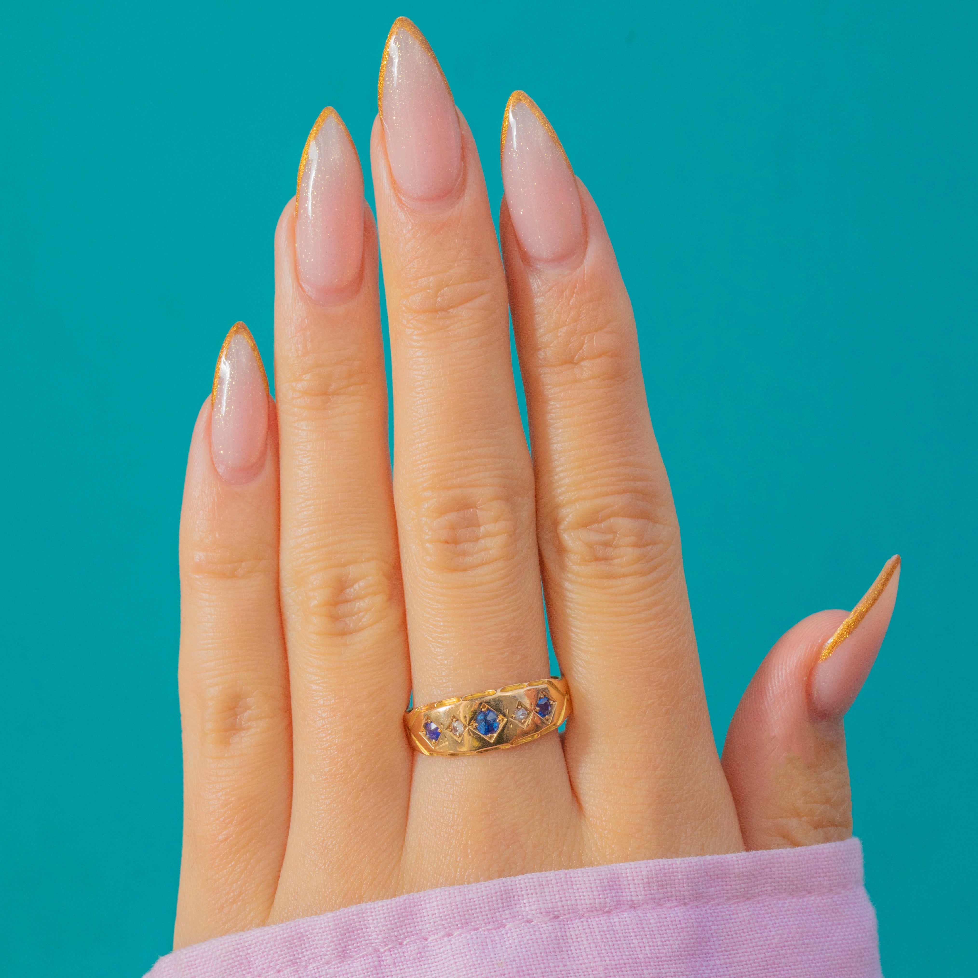 This Victorian five-stone gypsy ring, dated 1897, is a classic design set with bright blue Sapphires and sparkling Diamonds in a smooth, sculpted 18ct Gold band. The stones are flush-set within geometric settings, a hallmark of late-19th-century English craftsmanship.
