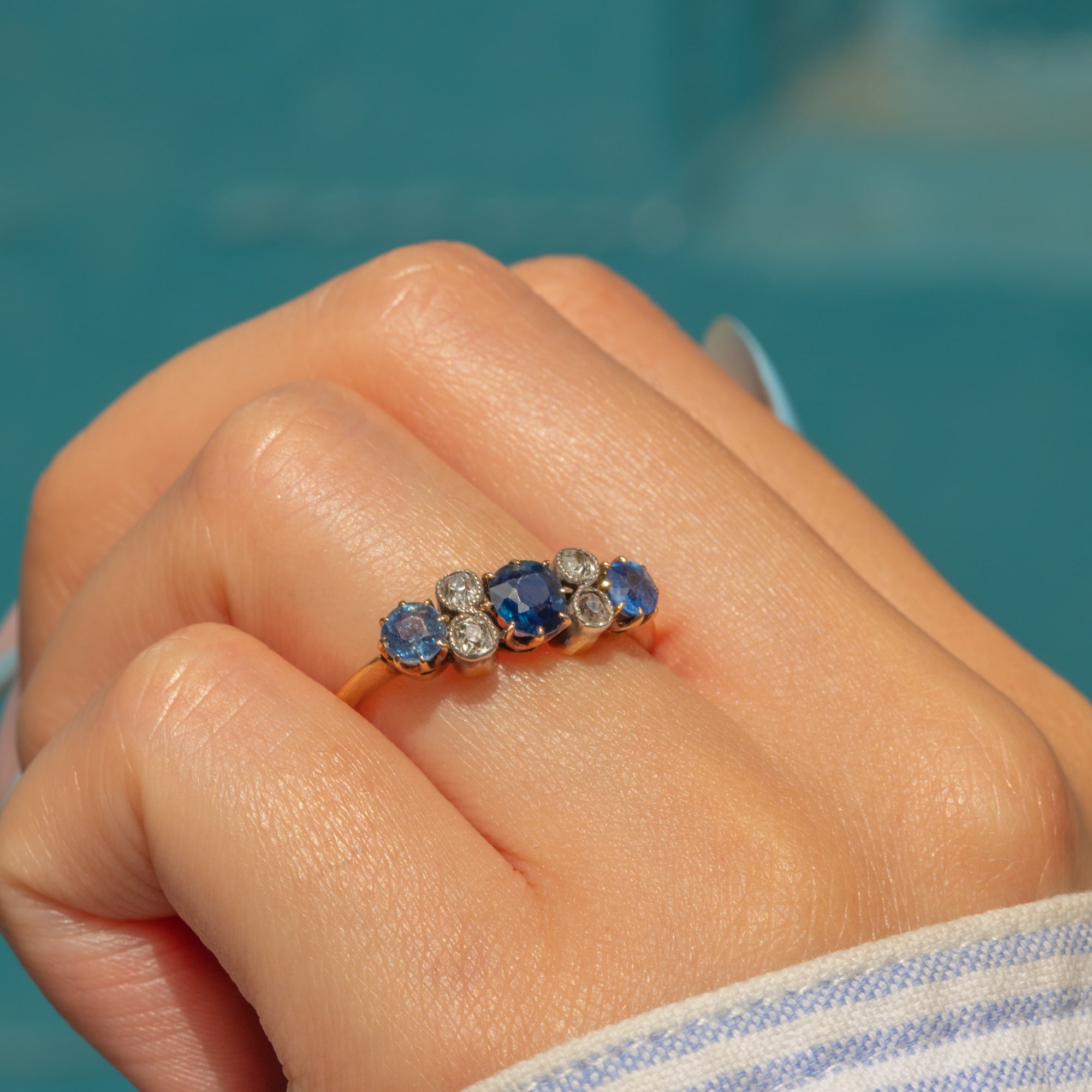 The central Sapphire projects a deep saturated blue hue, flanked by lighter, cornflower blue Sapphires, each displayed within elegant 18ct Gold claws and weighing 0.86cts combined. In typical Victorian fashion, the Diamonds are set within Silver bezels to enhance their bright sparkle.