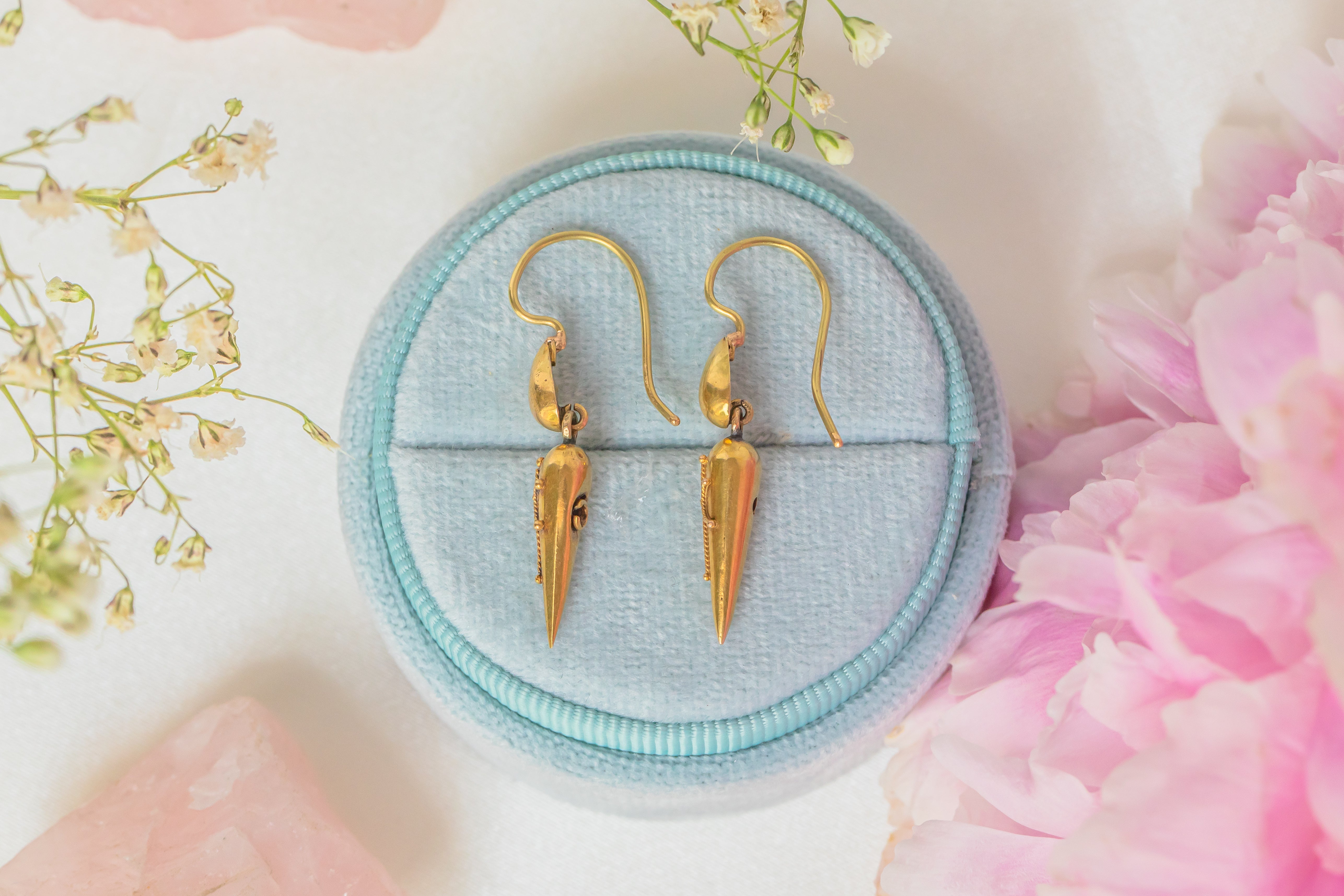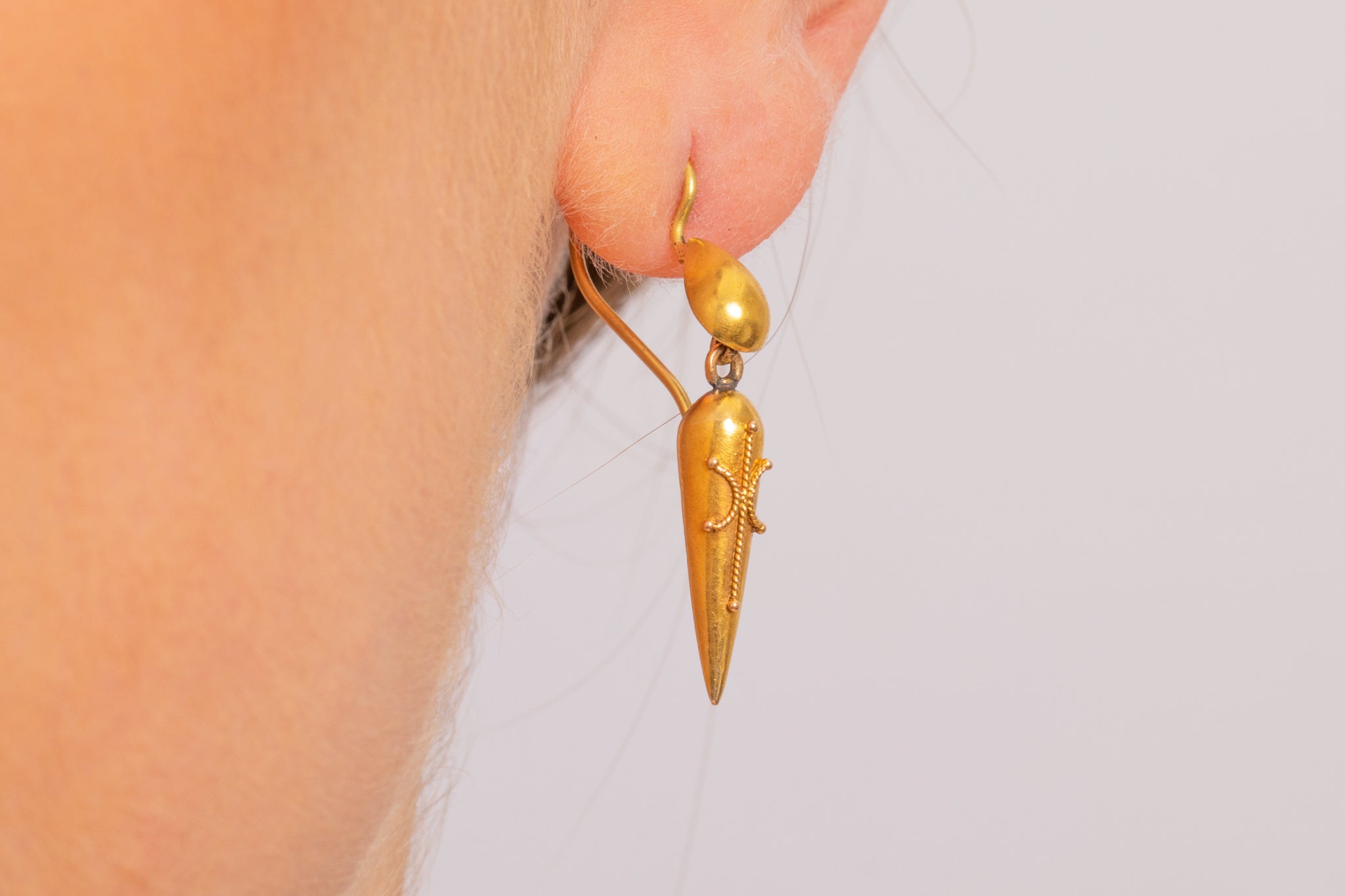 Make these Victorian 18ct Gold torpedo drop earrings your new go-to pair! Unique in design, these striking earrings boast dainty cannetille details resting across the front of the sleek torpedo drops.