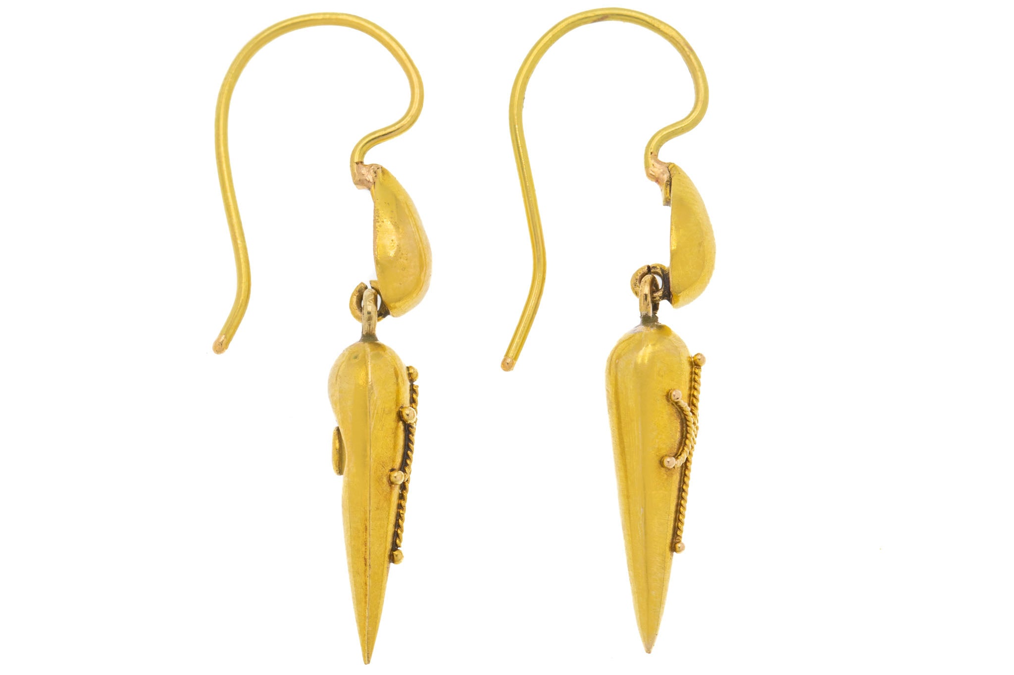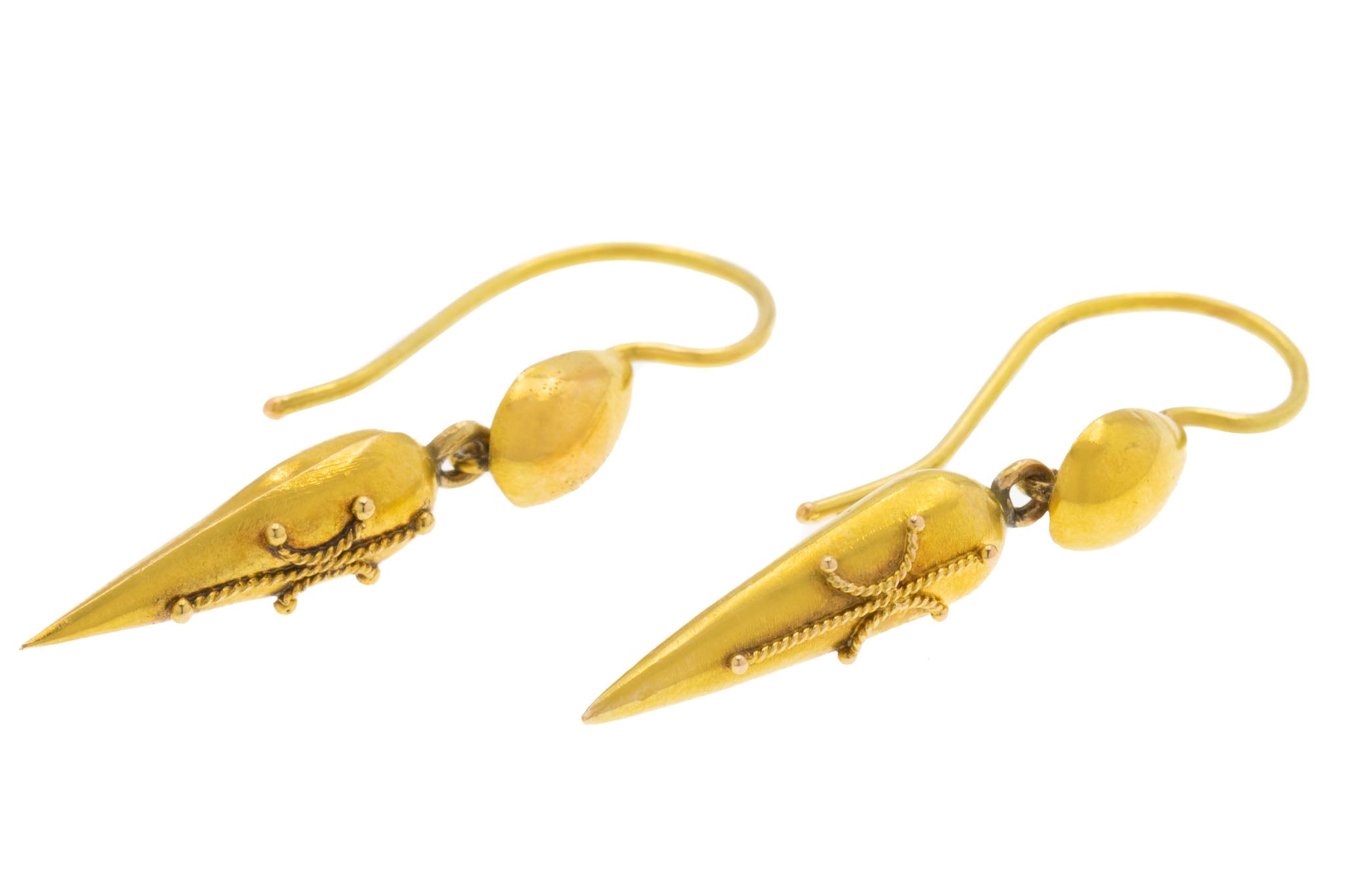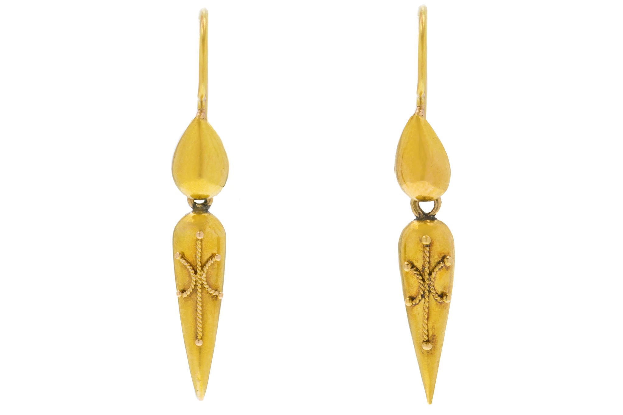 VERY GOOD. This pair of Victorian 18ct Gold torpedo drop earrings are in very good condition. These earrings do have some signs of aging on the back of them, with a few subtle dings. The backs have some open holes in them, which were used to let the heat out when they were being made. The cannetille details are all intact and the hooks are robust promising you years of wear and enjoyment!
