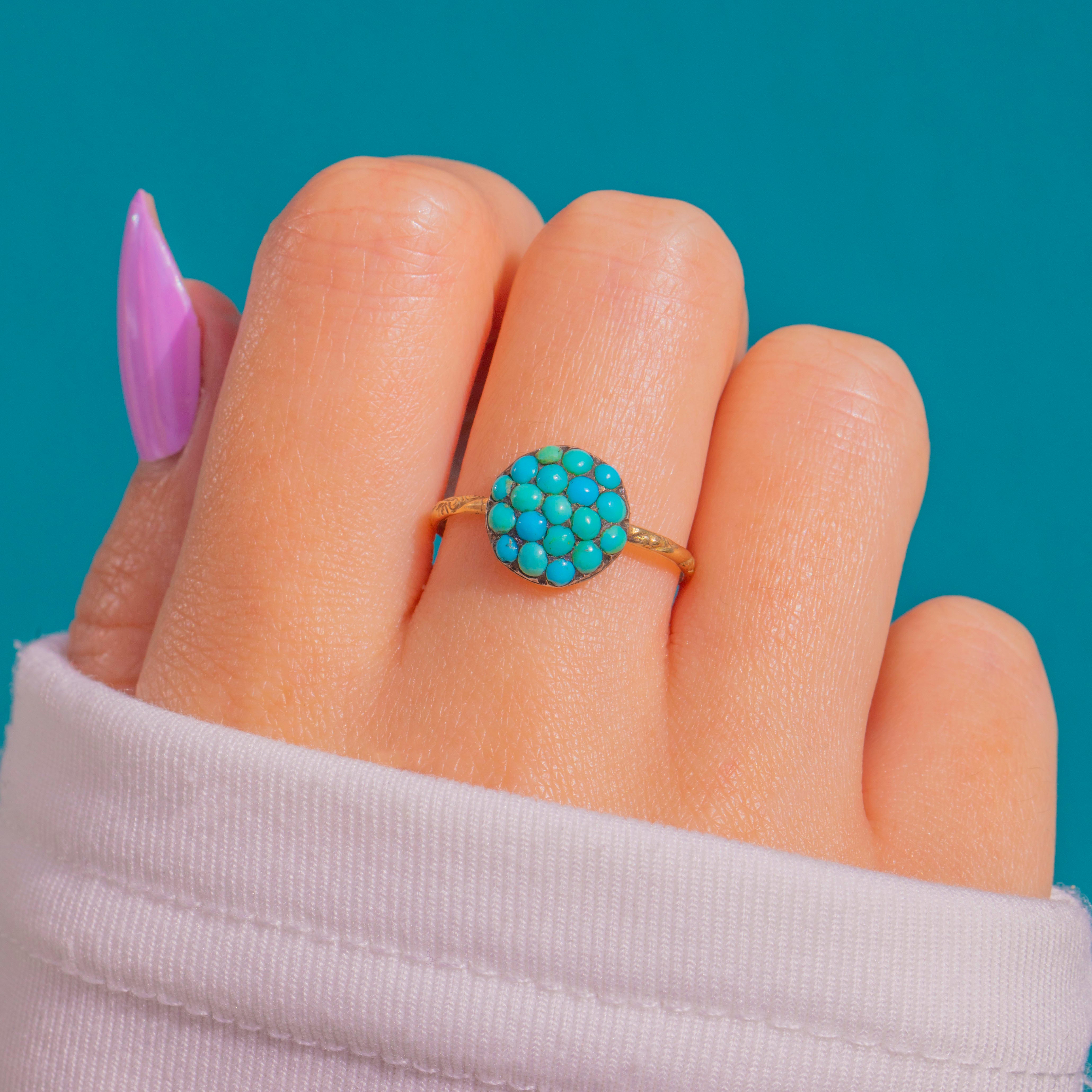 A dainty delight from the Victorian era, this 18ct Gold bombe ring blooms with a circular rosette of Turquoise cabochons. The gently domed cluster creates a pretty pop of blue-green, each cabochon nestled in neat settings for a timeless floral look.