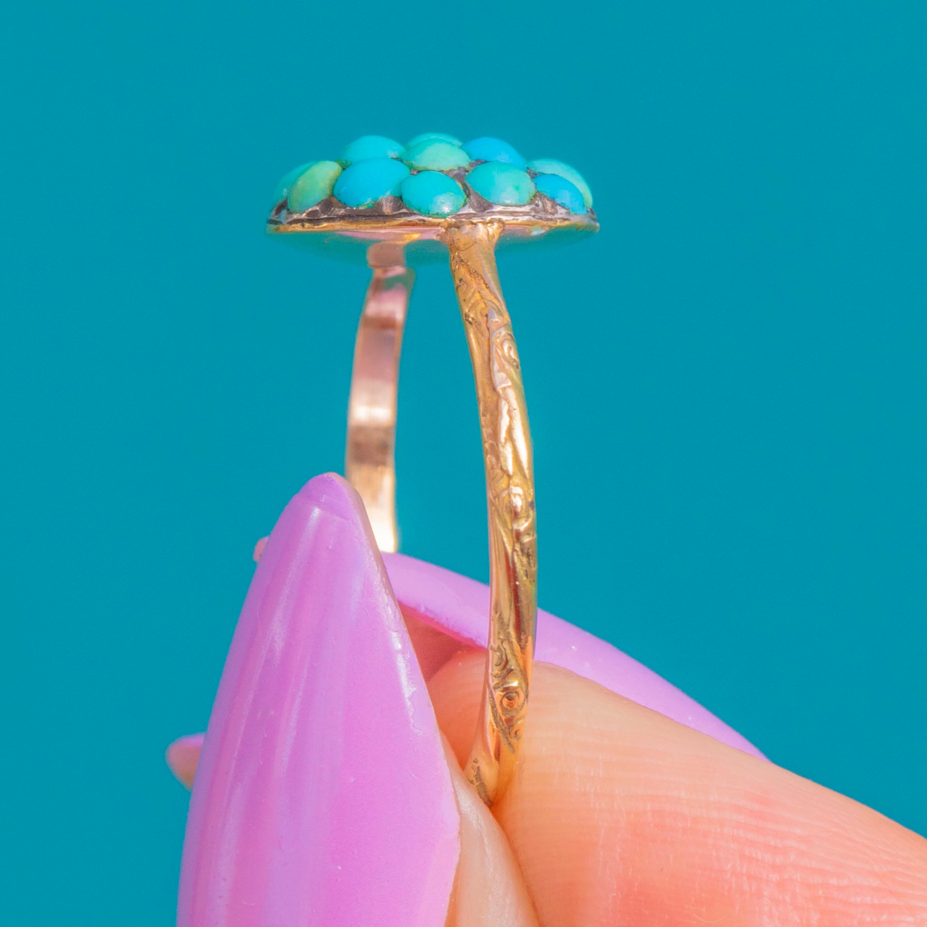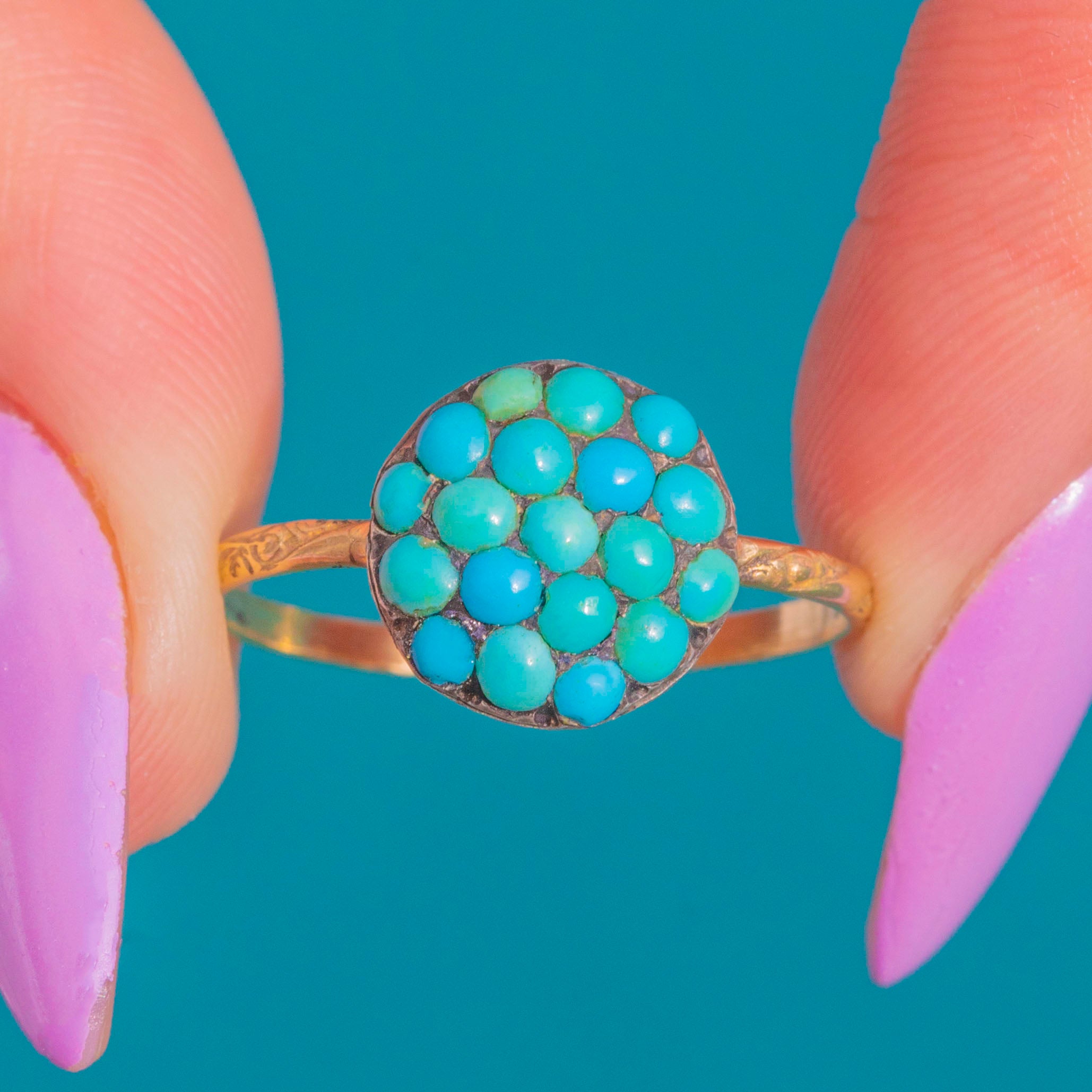 EXCELLENT: Turquoise cabochons are secure and well-matched in colour with only light surface wear visible under magnification; no significant chips noted. The settings, cluster head and slim engraved shank are in lovely condition with minor age-related wear. No clear signs of resizing or restoration. This is a delicate ring that should be worn with care.