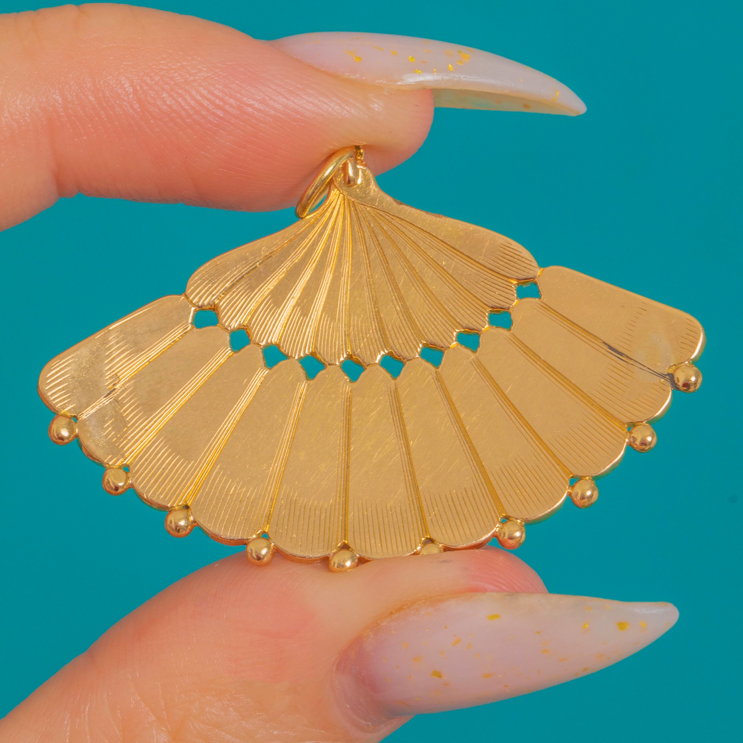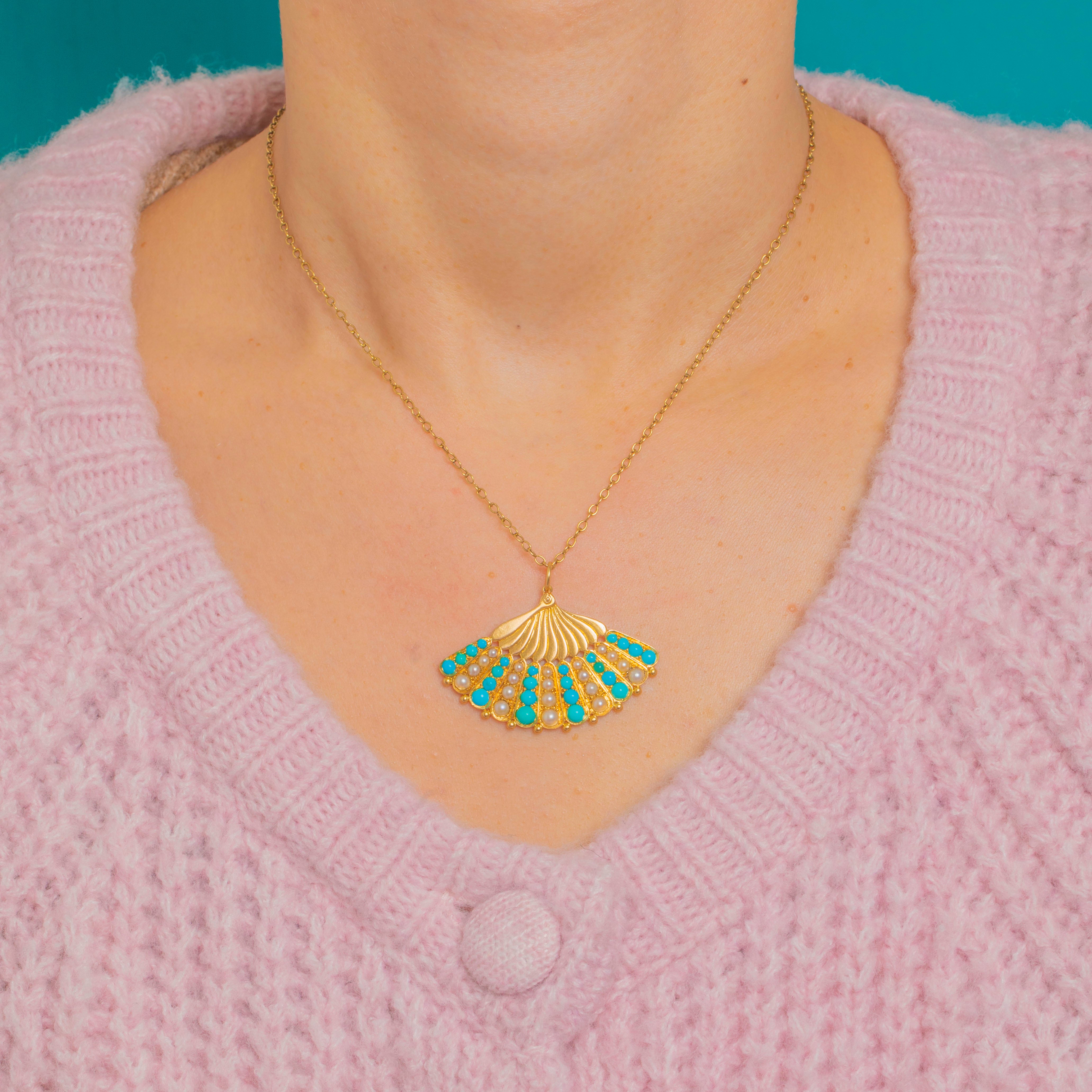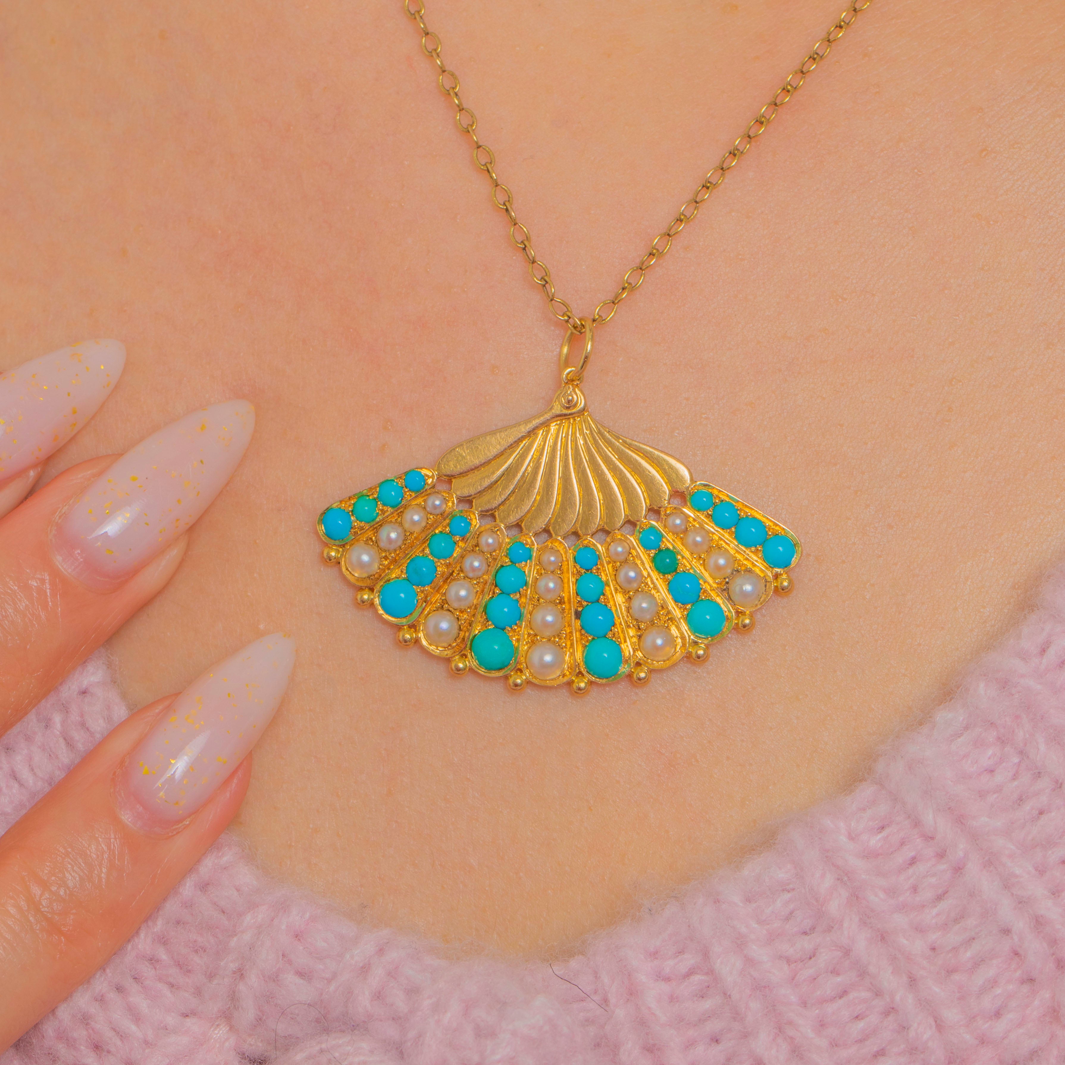 Shaped as an elegant scallop fan, this Victorian 18ct Gold pendant is richly embellished with alternating Turquoise cabochons and lustrous Pearls. Radiating fluted lines and a refined beaded perimeter, the vivid blues and creamy tones create a timeless, feminine palette.