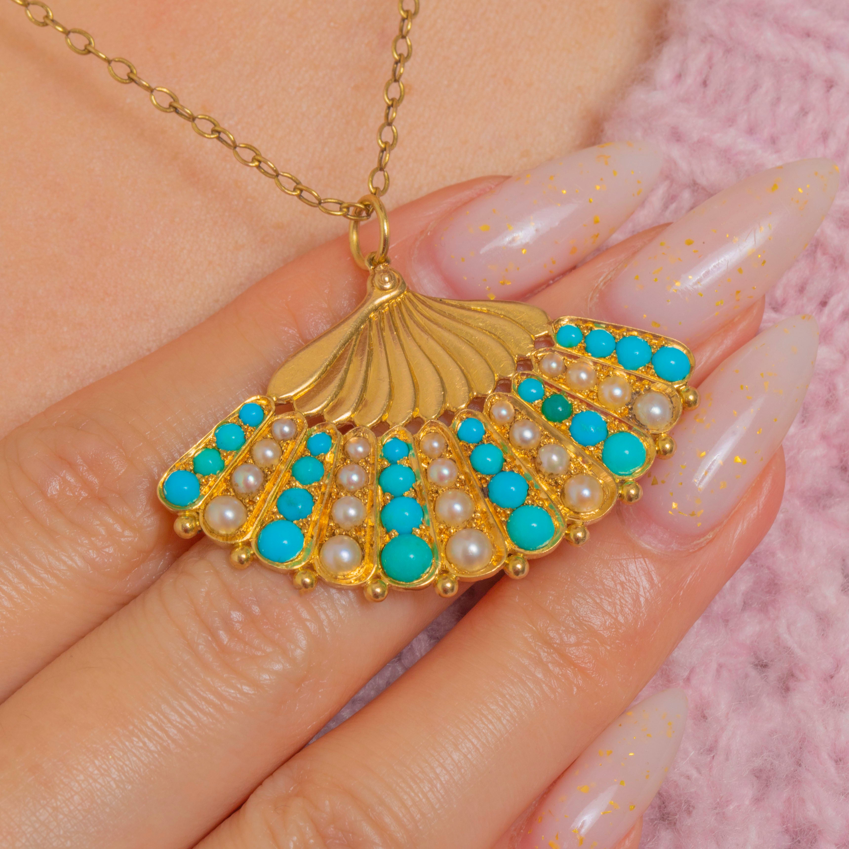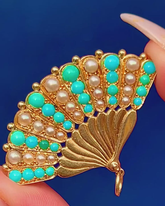Victorian 18ct Gold Turquoise Pearl Fan Pendant