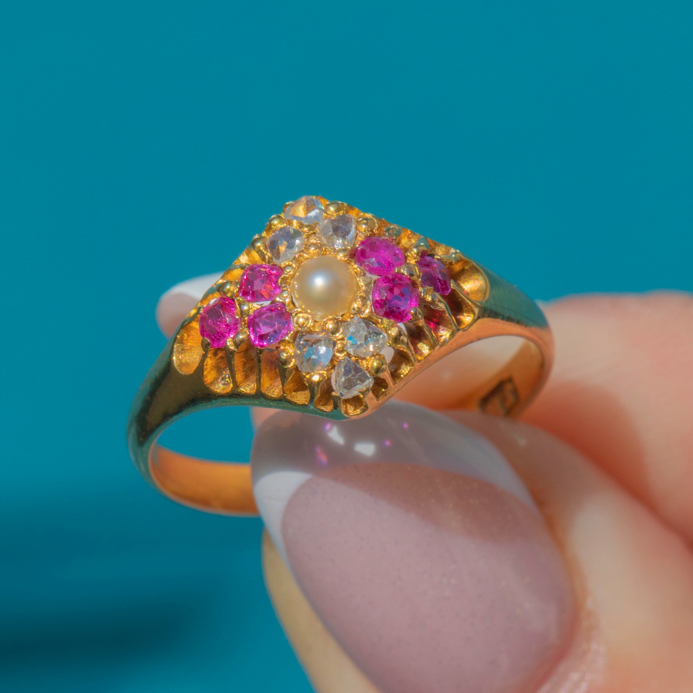 This Victorian 18ct Gold Ruby & rose-cut Diamond Pearl lozenge ring is an antique delight! Displaying a luxurious selection of gemstones, this Victorian ring boasts six fuchsia Rubies and six scintillating Diamonds surrounding an iridescent Pearl -what a treat!
