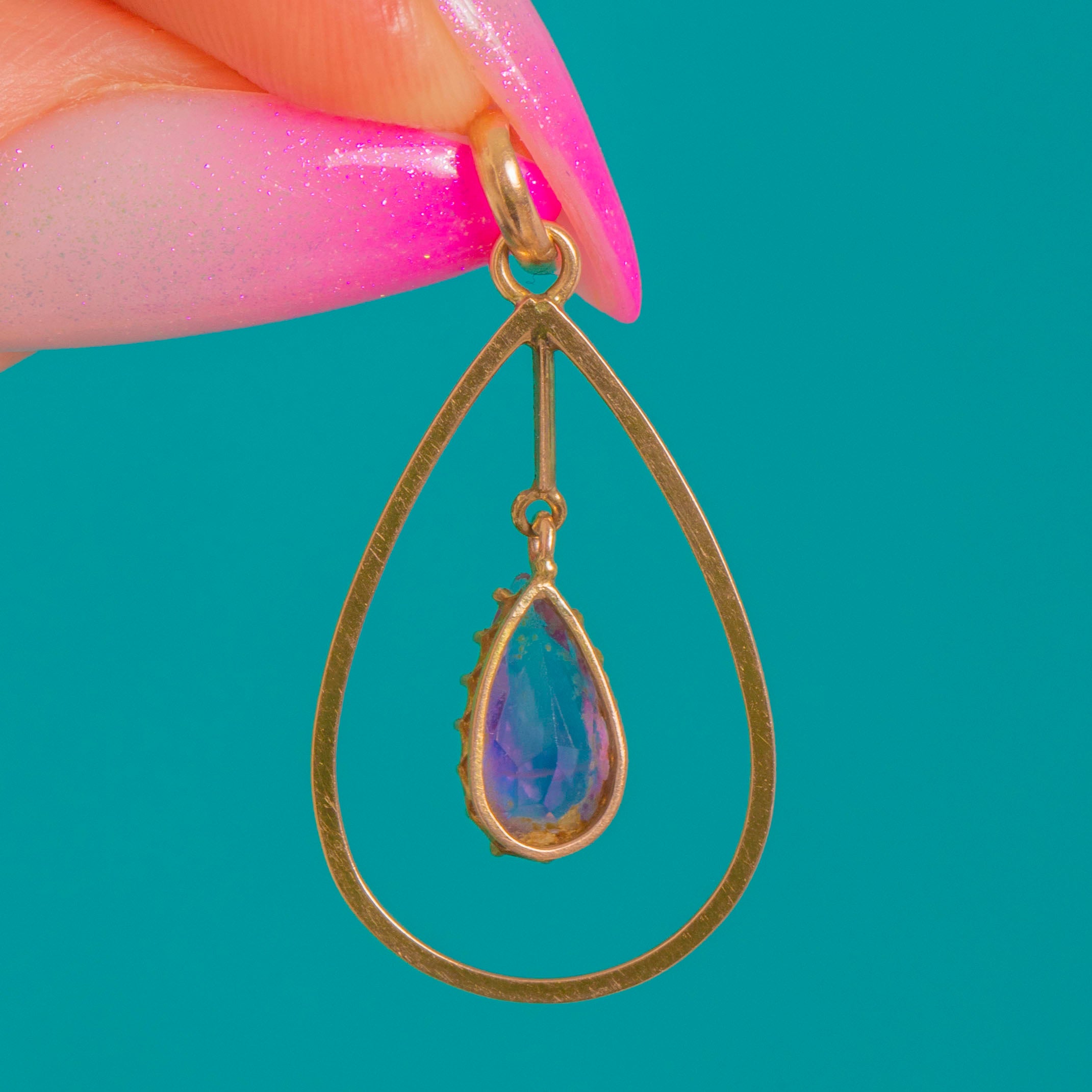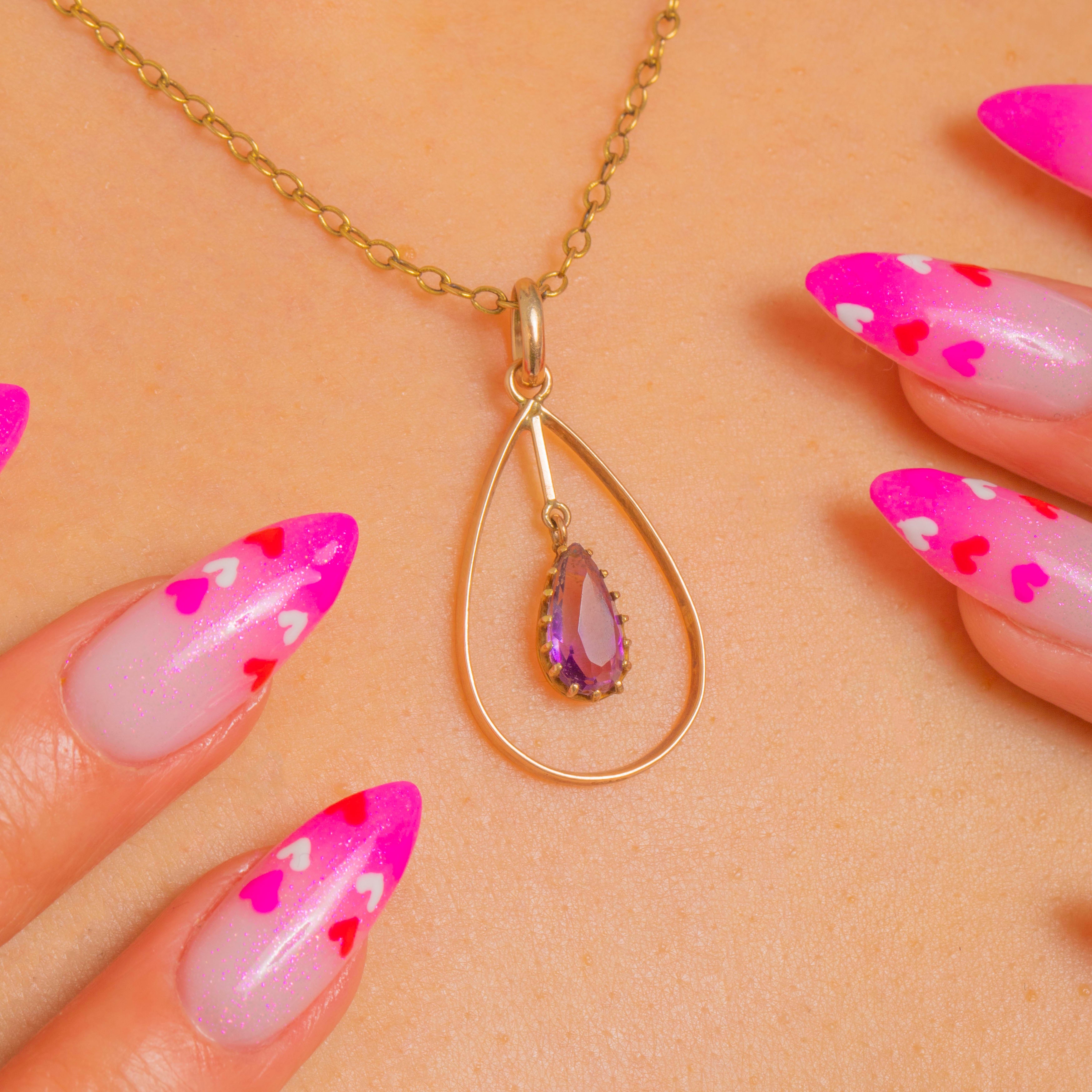 A refined Victorian Amethyst drop pendant in warm 9ct Gold, shaped as an elegant open teardrop with a suspended pear-cut Amethyst at its heart. The articulated inner drop gives the gemstone gentle movement, allowing its rich purple hue to catch the light beautifully with every turn.