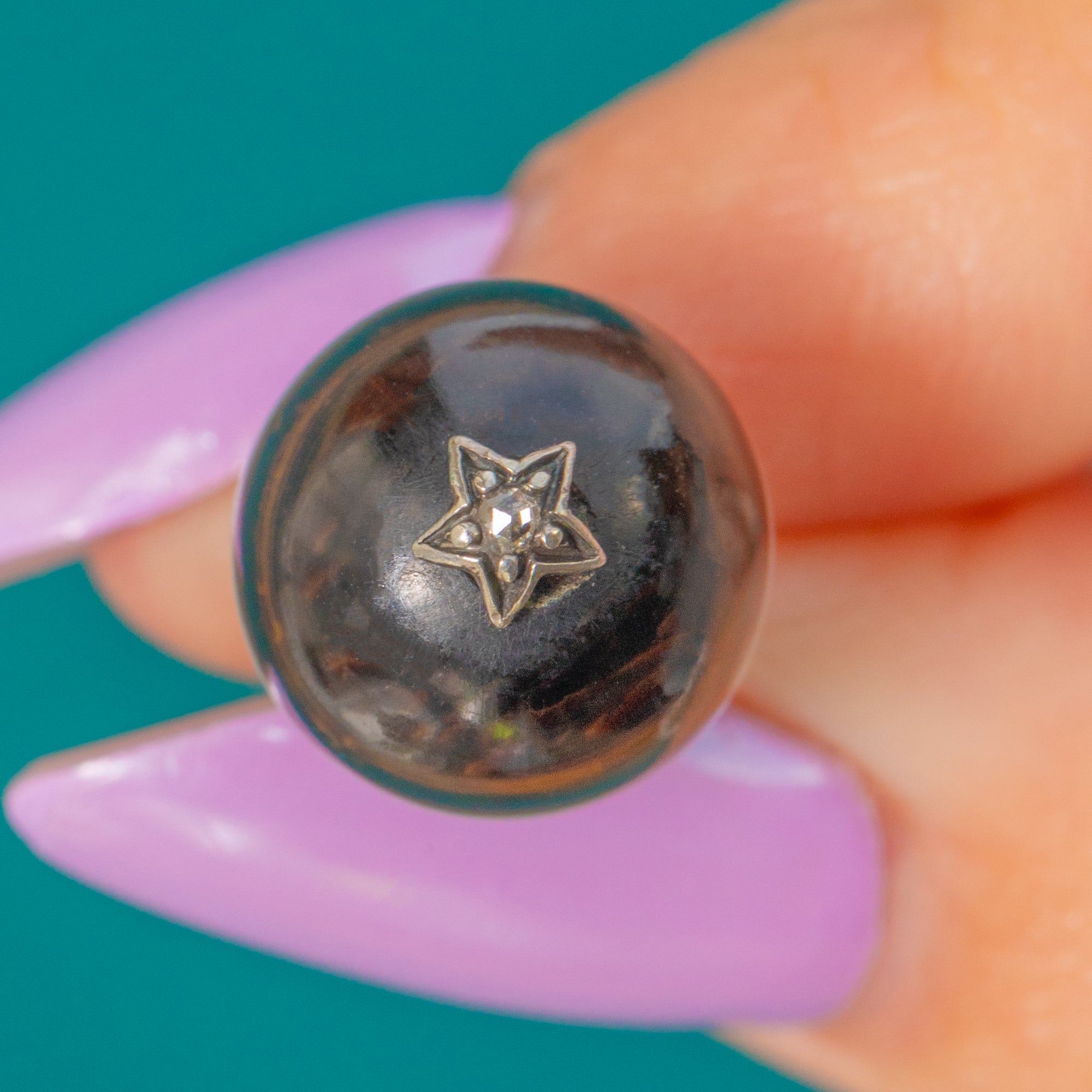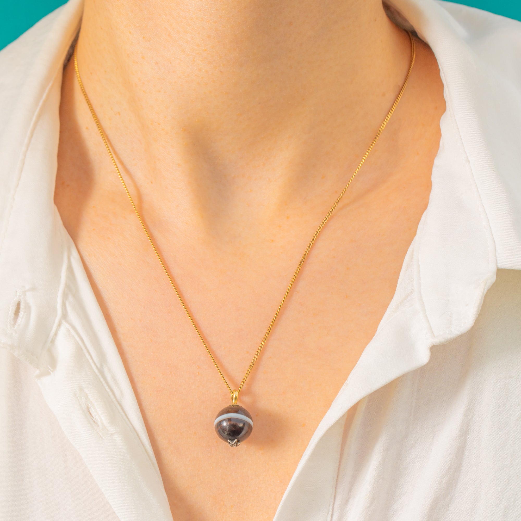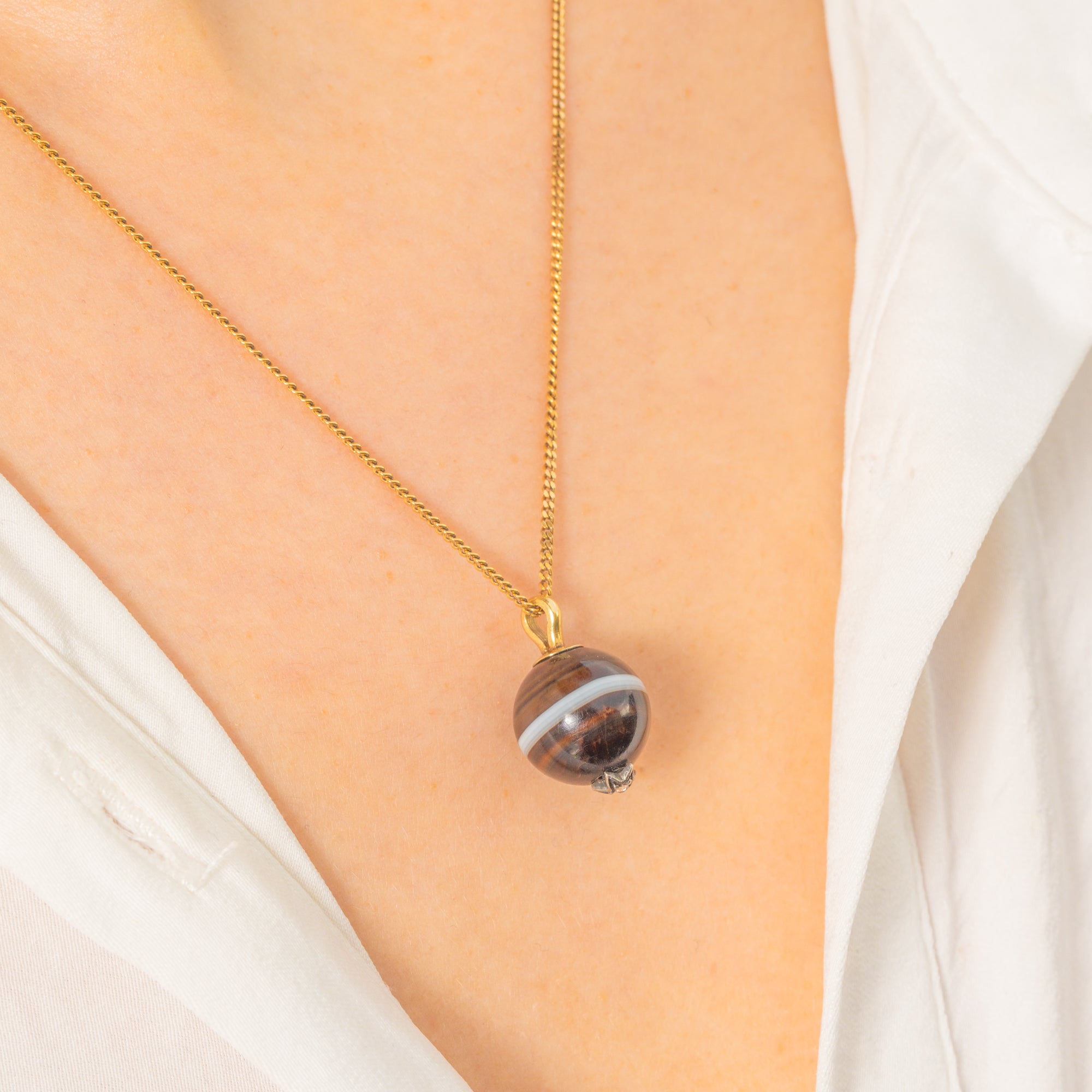 A timeless Victorian treasure, this 9ct Gold Banded Agate orb charm pairs striking natural beauty with a touch of celestial sparkle. The highly polished orb reveals rich, inky-brown to black tones wrapped by a crisp pale band, its smooth surface crowned with classic Gold fittings. Punctuated by a petite Diamond-set star, it glints softly as the charm moves—an elegant nod to Victorian fascination with the night sky.