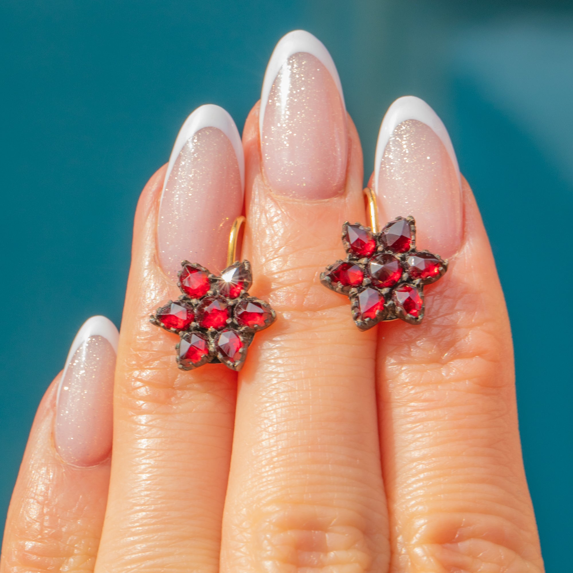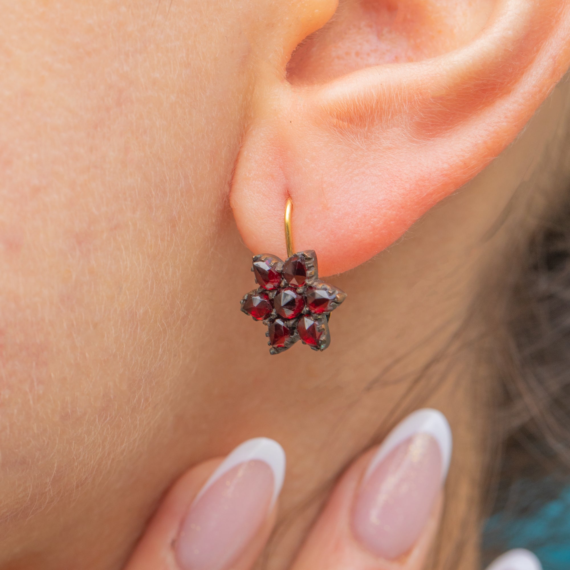 VERY GOOD: These antique Garnet flower cluster earrings are in very good condition! Each Garnet is present and secure, retaining the intense red hues Bohemian Garnets are known for. The Garnet Gold settings do have some wear on the back and there is one small chip to one of the Garnets, but this is not noticeable when they're when worn. The later added 9ct Gold hooks are slender and robust, allowing you to wear them in comfort and style!