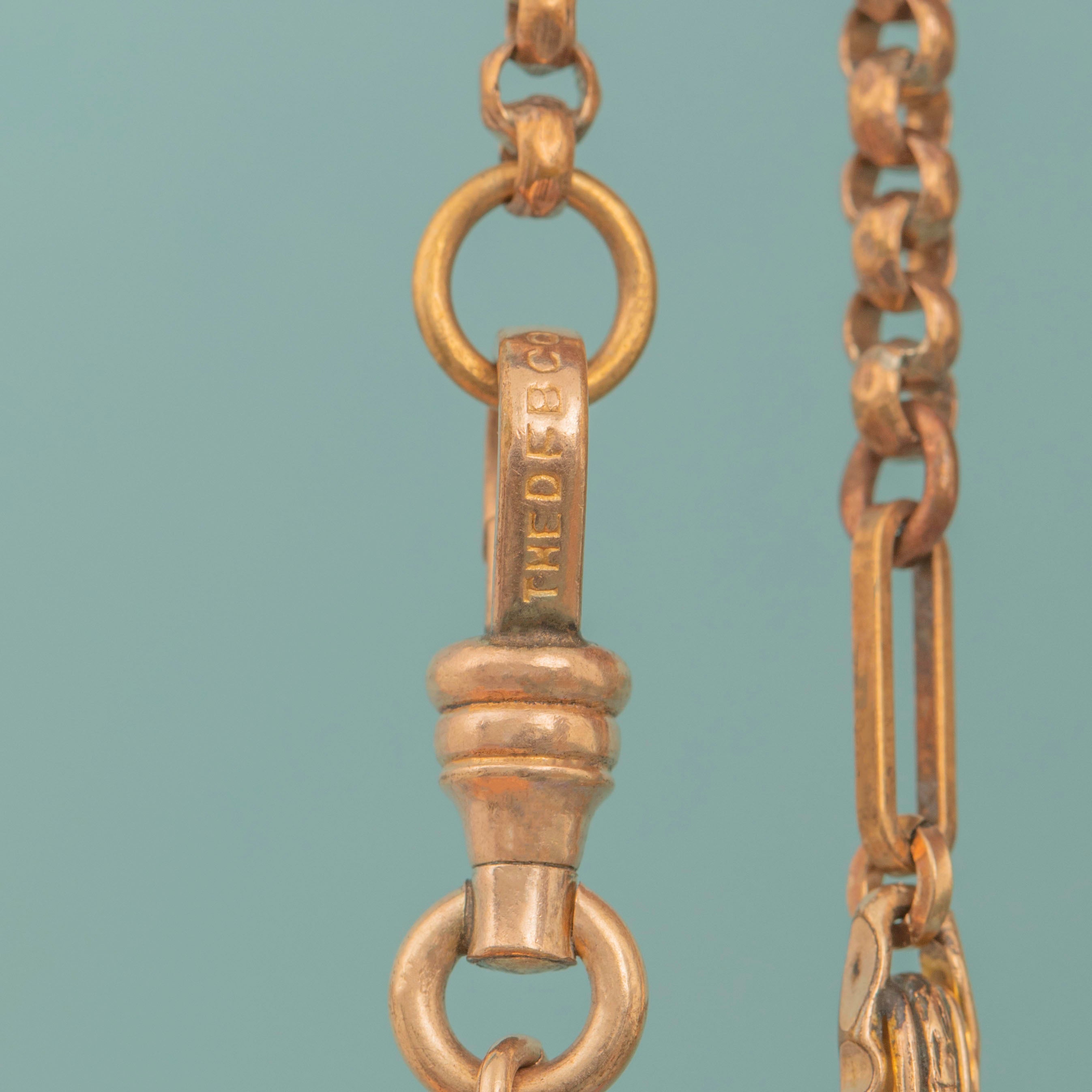 VERY GOOD. This Victorian 9ct Gold cased fancy longuard chain is in very good condition. Her links are uniform and securely connected, with a fully functioning dog clip to finish. There are signs of wear throughout this chain commensurate with age, however this does not distract from her beauty and serves as a reminder of her history. A great piece to add to your collection, this chain is a steal!