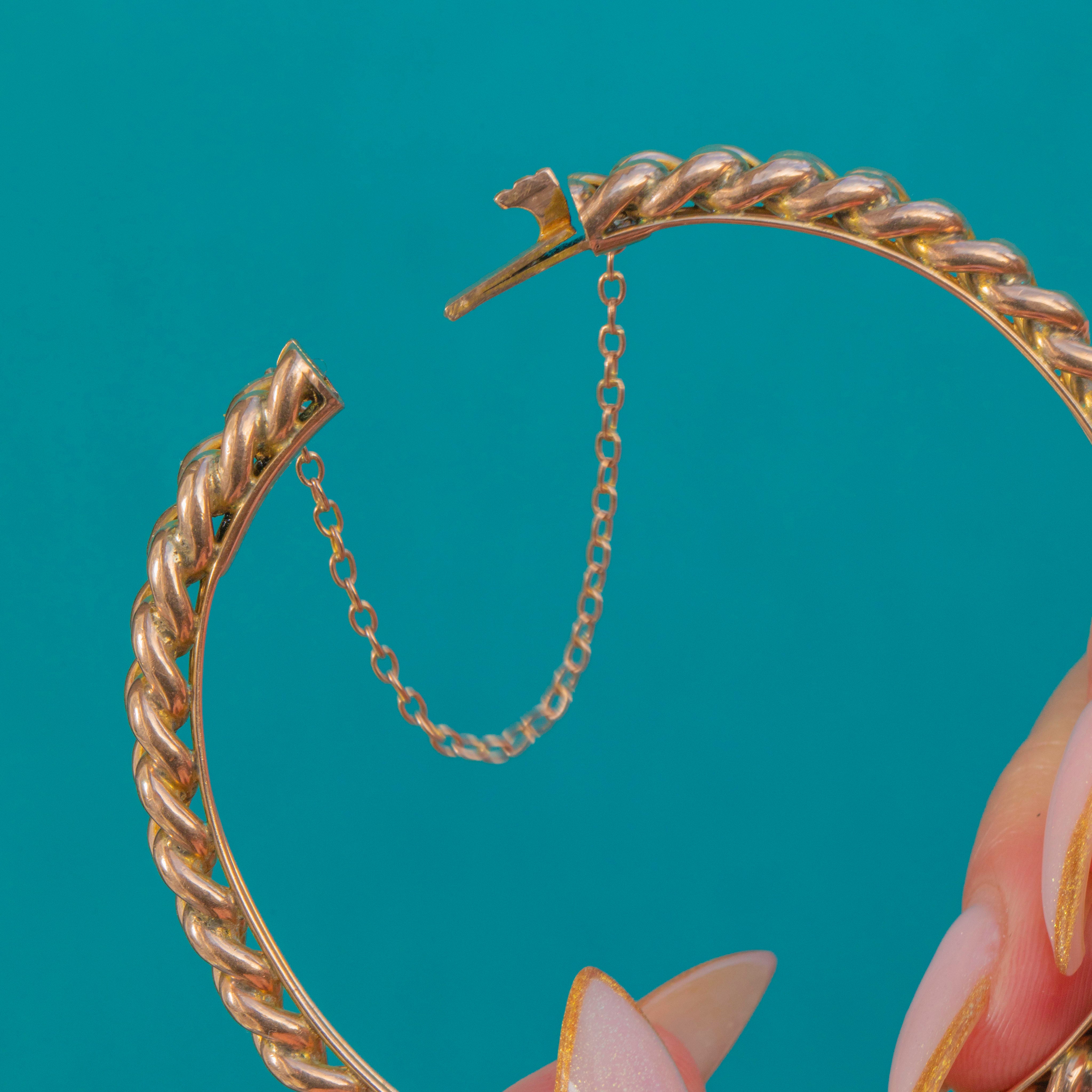 EXCELLENT: The curb links are smooth and well-preserved with only light surface wear under close inspection. The hinge and clasp are in perfect working order, closing securely as they should. There are no dings, dents or signs of damage, especially impressive for a bangle of this age.