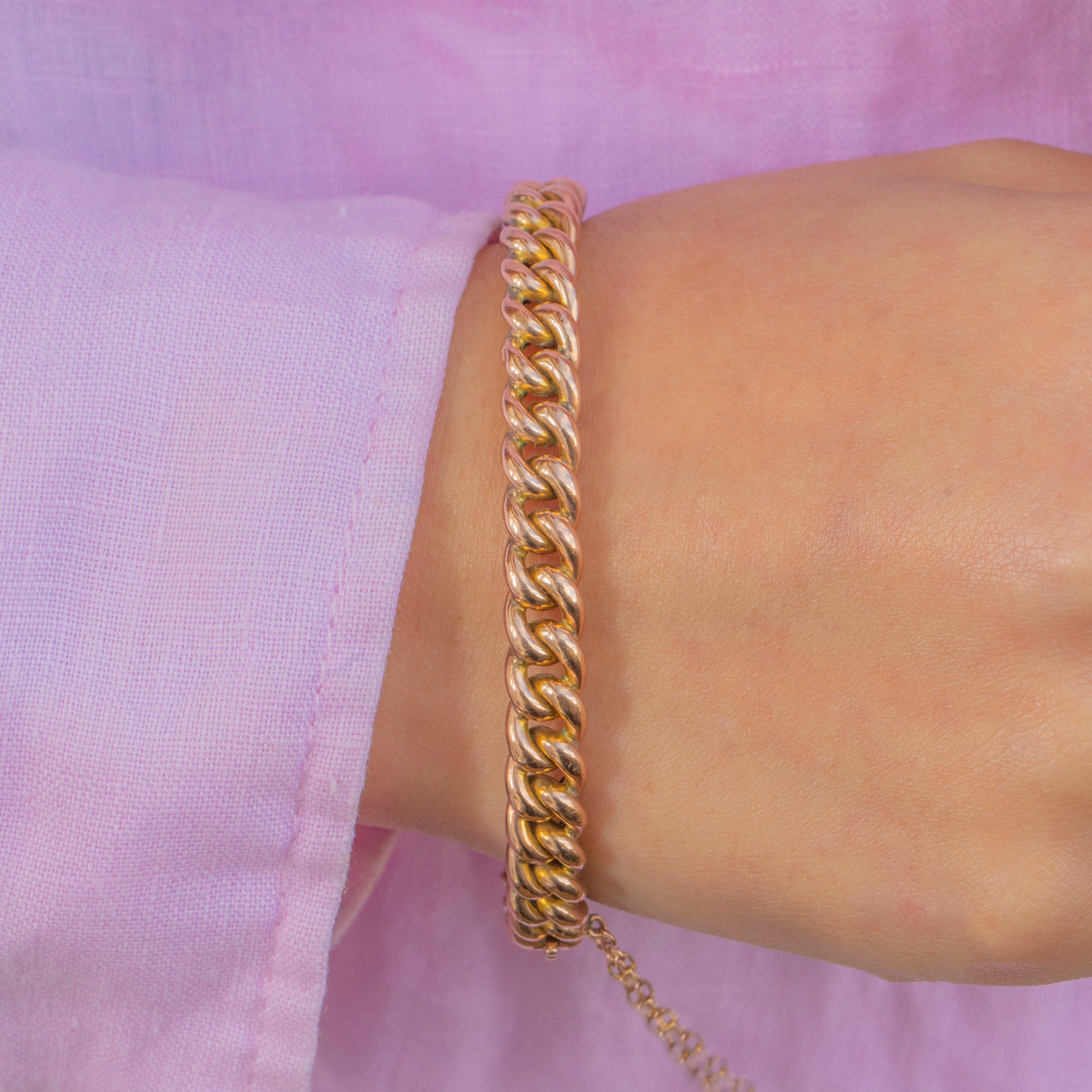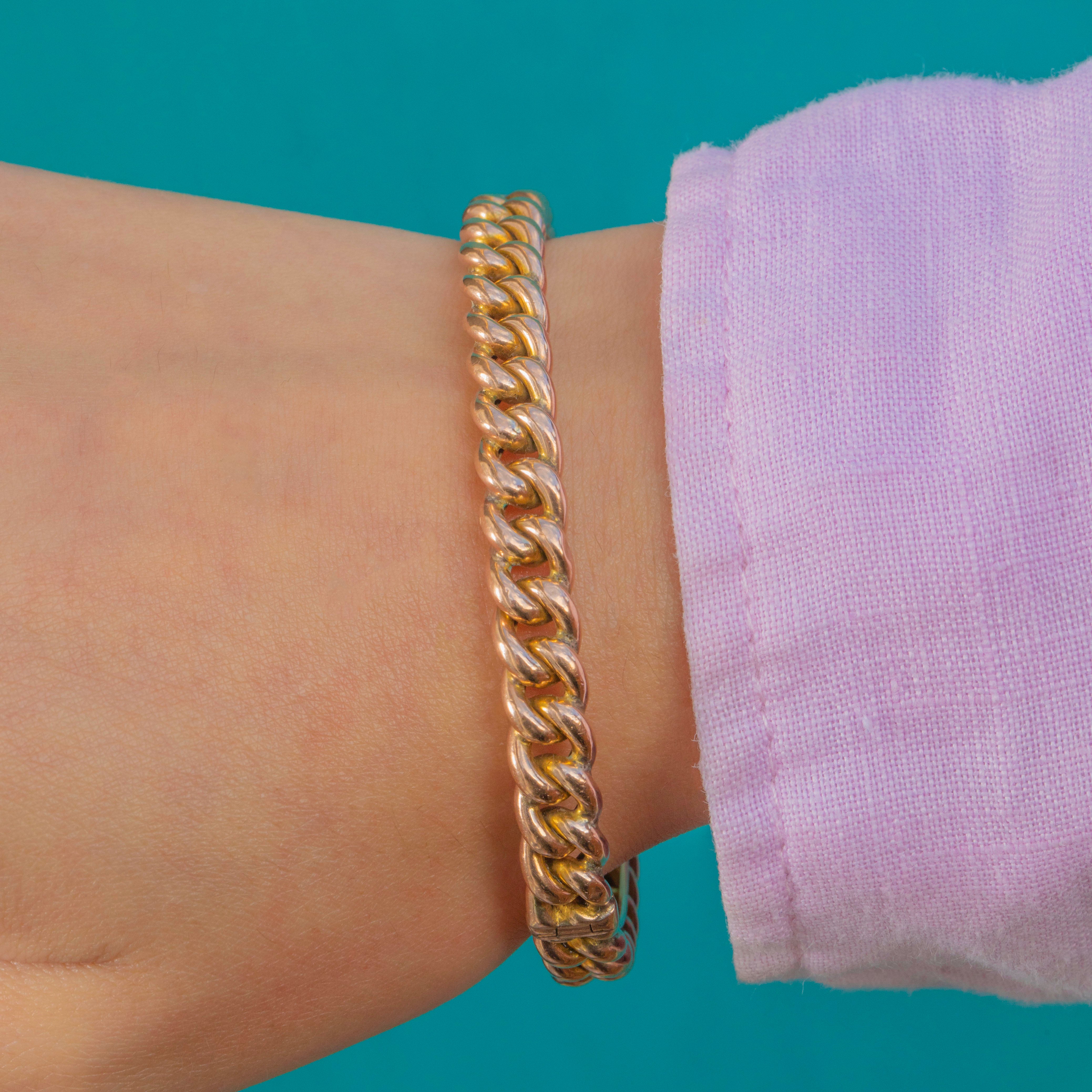This antique 9ct Gold curb bangle is a gorgeous Victorian classic, dating to circa 1900. The rounded curb links form a smooth, continuous row of Gold around the wrist, giving it a sleek yet substantial feel.