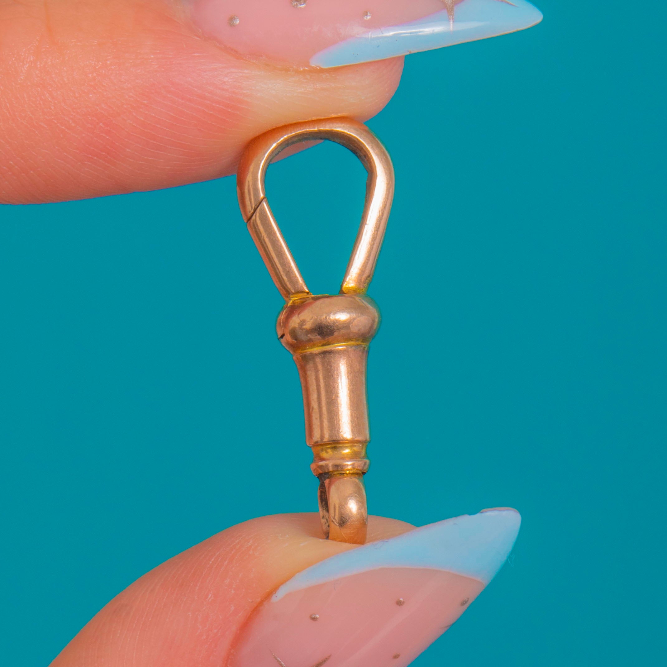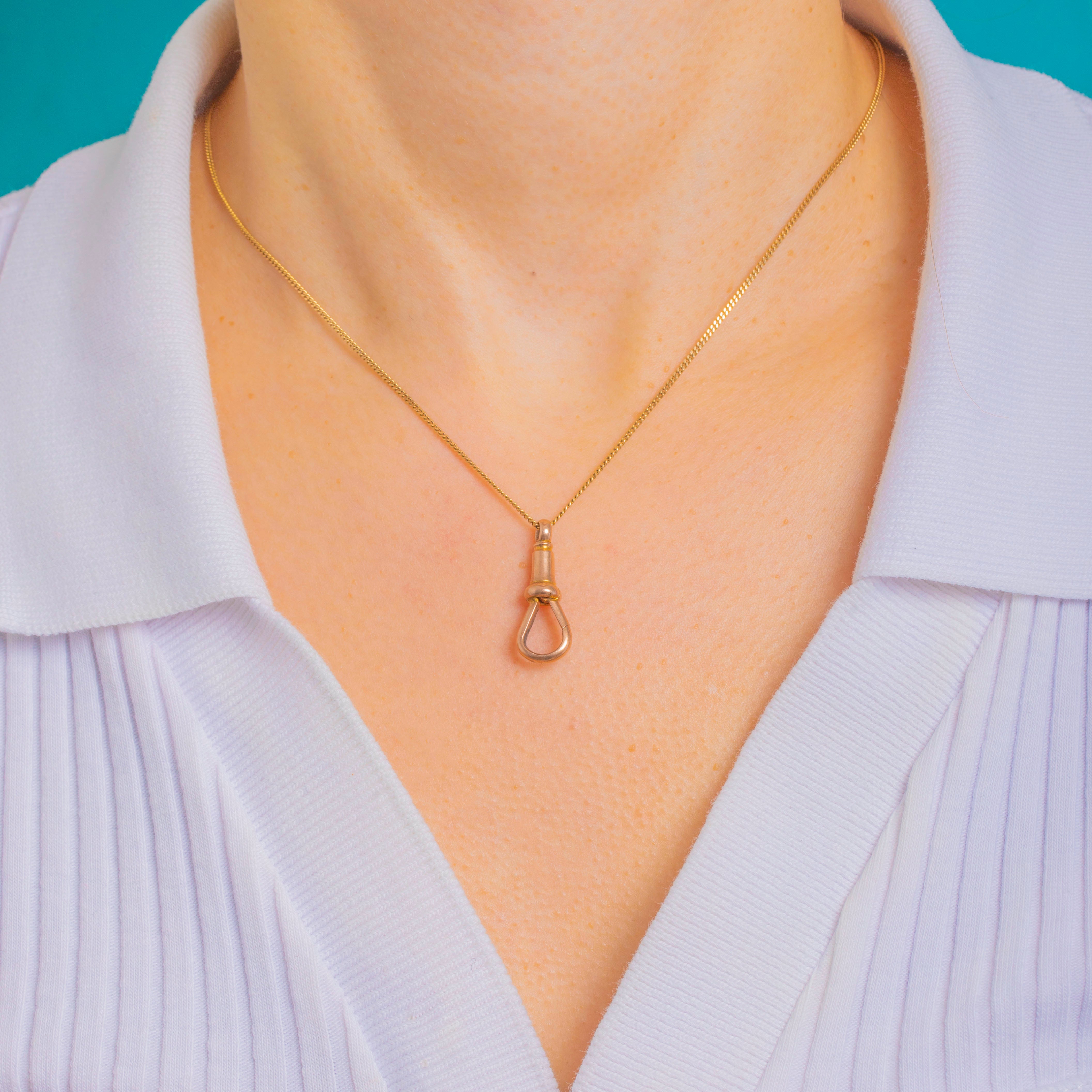 A classic Victorian dog-clip in 9ct Gold, elegantly engineered with a turned barrel, subtle banding and a sleek teardrop gate. Its warm, slightly rosy hue and polished finish lend effortless refinement to any chain.