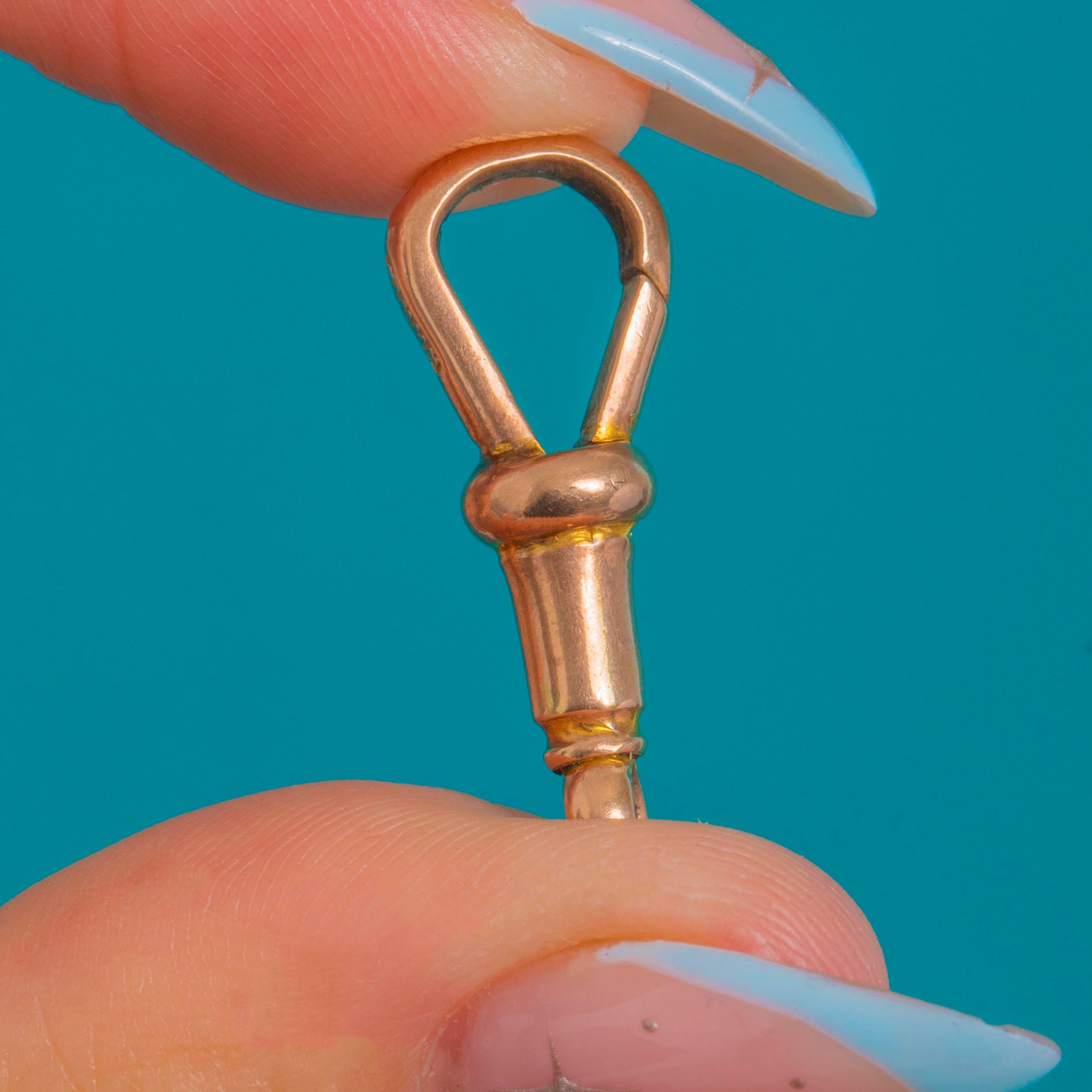 A quintessential Victorian 9ct Gold dog-clip clasp with that timeless blend of elegance and utility. Beautifully engineered, it features a lathe-turned, tapered barrel with a collar, a classic teardrop clip with a spring gate for effortless styling. The warm glow of 9ct Gold and smooth, polished surfaces make it a chic standalone pendant or the perfect charm holder.