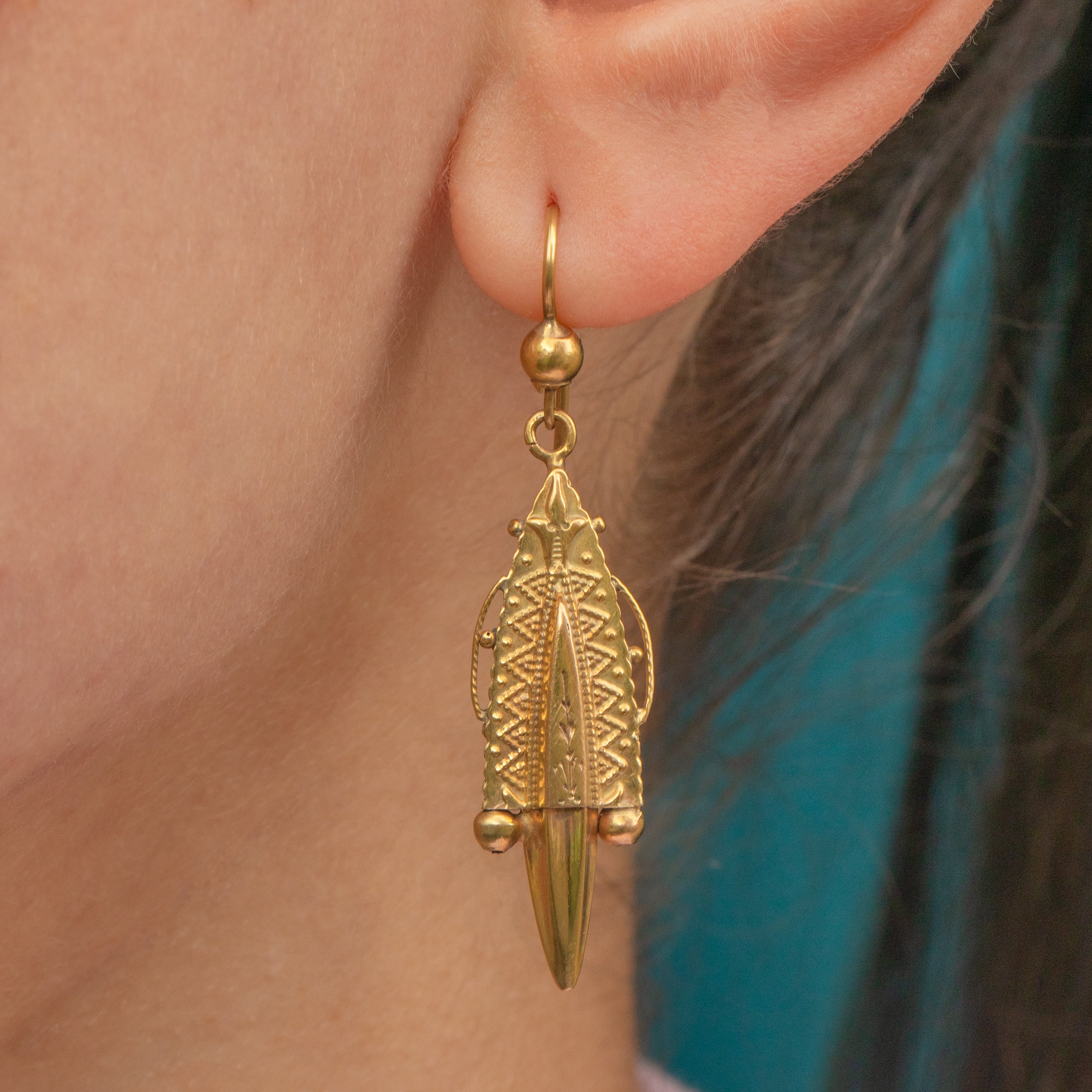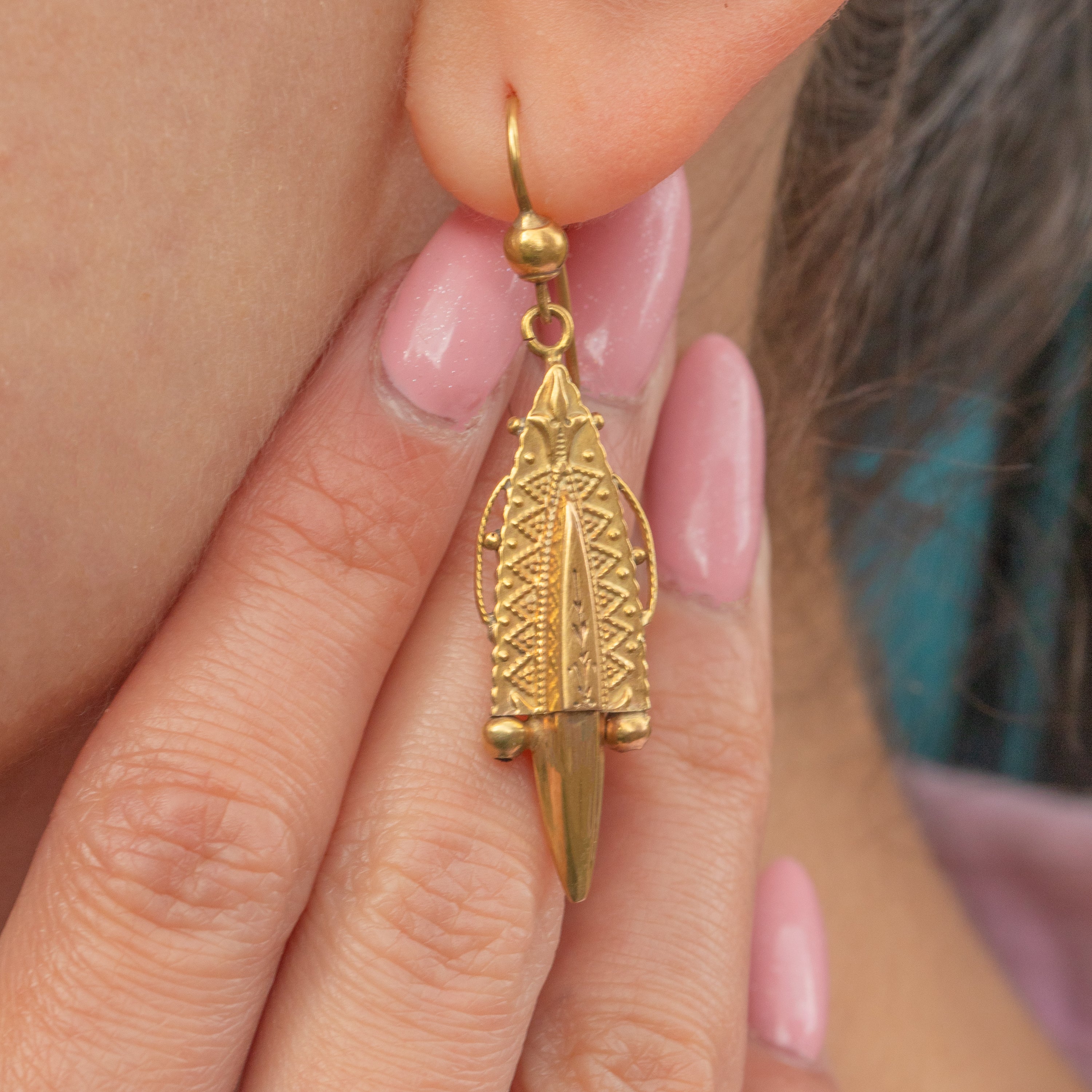 VERY GOOD: These Victorian 9ct Gold engraved fancy torpedo drop earrings are in very good condition. The Gold has an even saturation throughout, and the details have all remained intact and defined. There are some light scratches and dimpling on the back of the earrings, commensurate with age, but this isn't visible from the front and does not detract from their beauty. The hooks are long and slender, providing secure and comfortable wear!