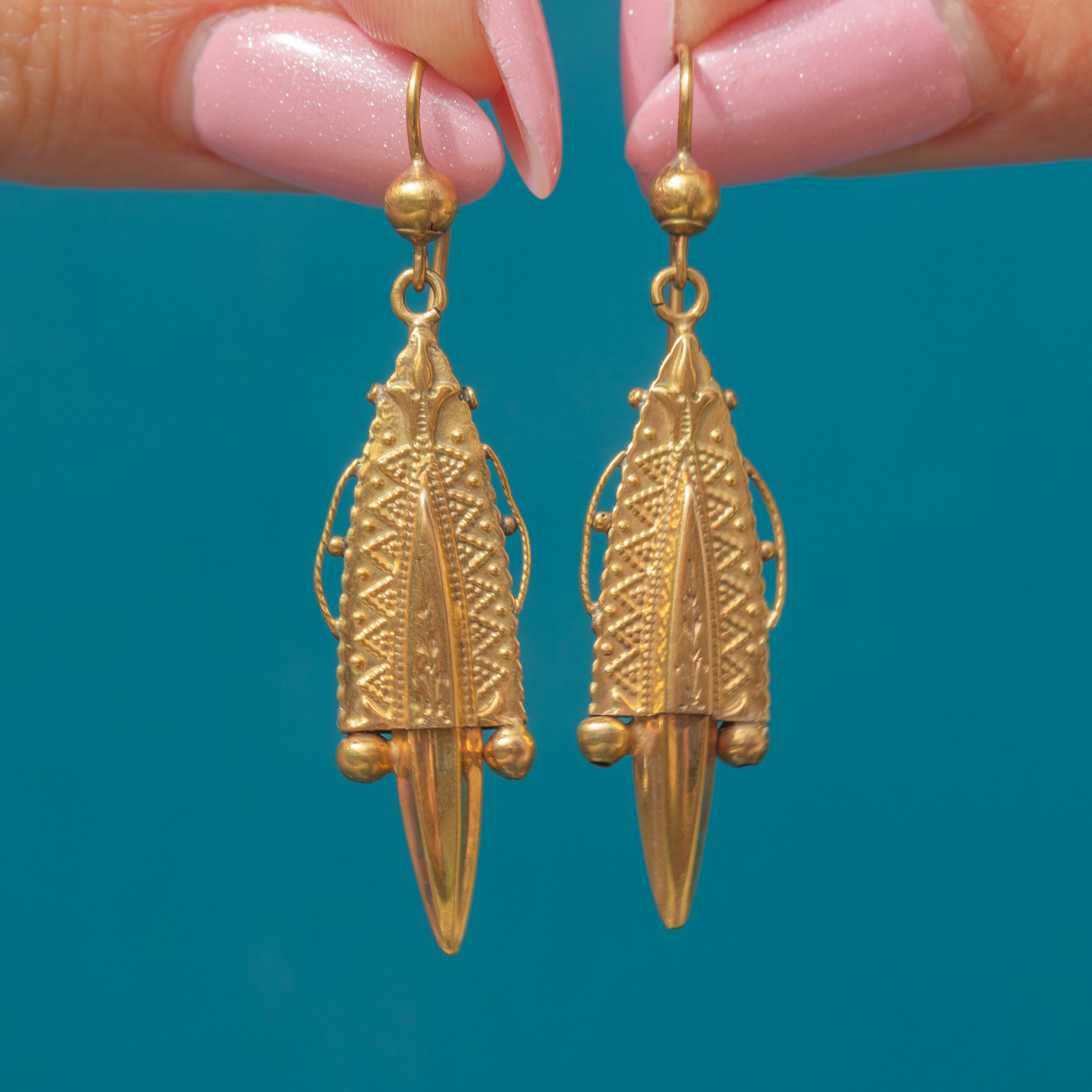 These eye-catching Victorian 9ct Gold engraved fancy torpedo drop earrings will look resplendent adorning your lobes! Crafted from solid 9ct Gold with a gorgeous satin finish, these antique earrings exude luxury from their every curve.