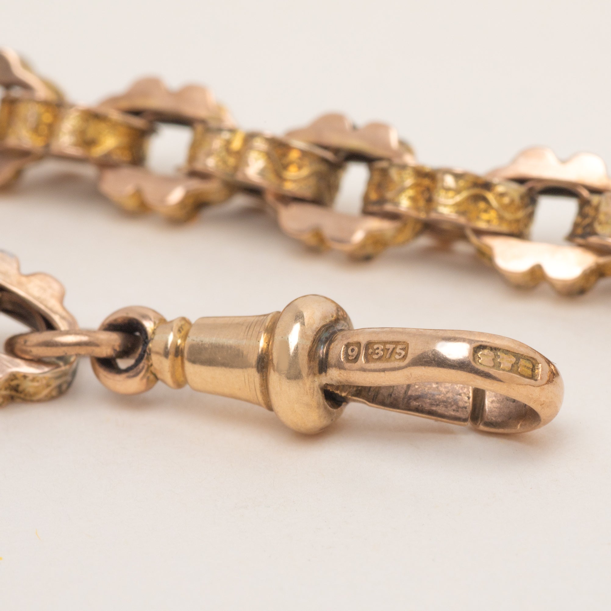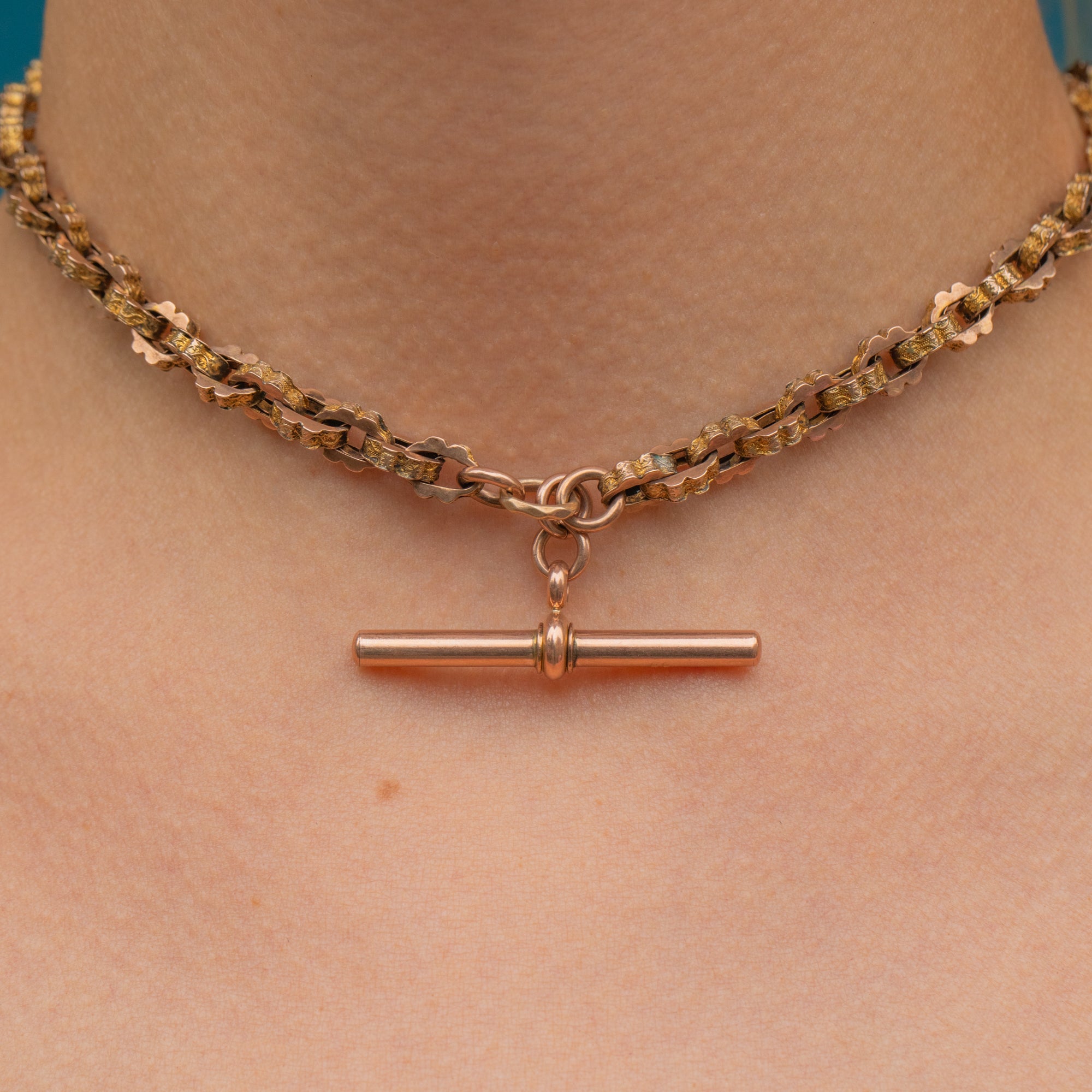 We adore this Victorian 9ct Gold fancy link Albert chain, complete with two dog-clips & a T-bar! The links on this rosy-hued chain are gorgeous, chunky and beautifully engraved, making this a unique treasure to enjoy for a lifetime.