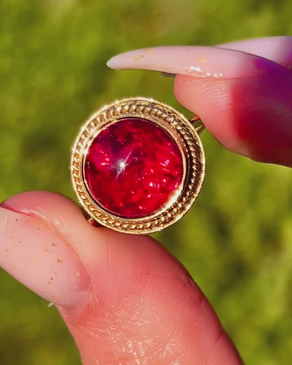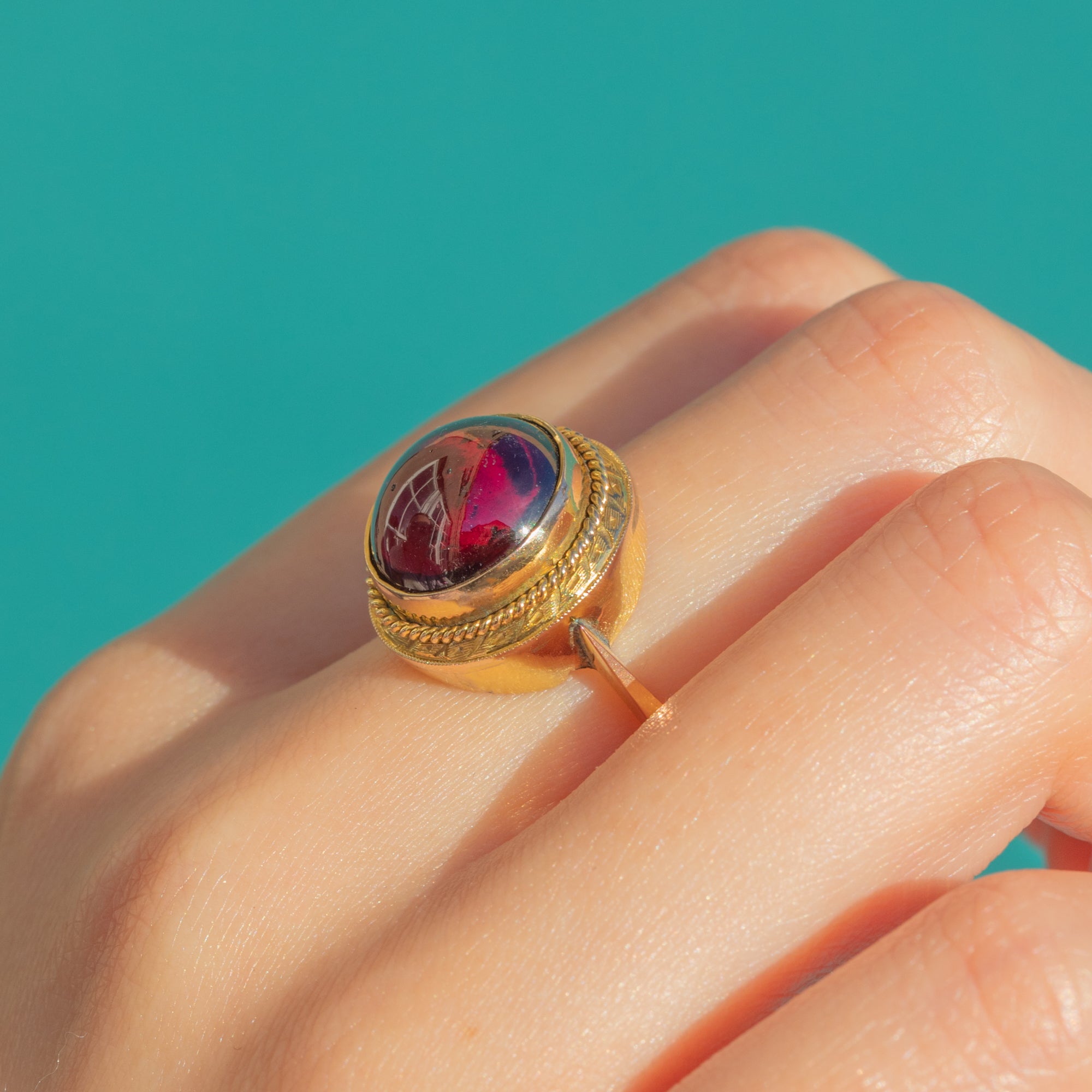 A striking Victorian Garnet solitaire, this luscious cabochon glows a deep wine-red from a bold, sculptural setting in bright yellow 9ct Gold. The round, high-domed 4.75ct Garnet is cradled in a tall bezel atop a circular platform, its edge framed with classical rope‑twist for beautiful texture and definition.