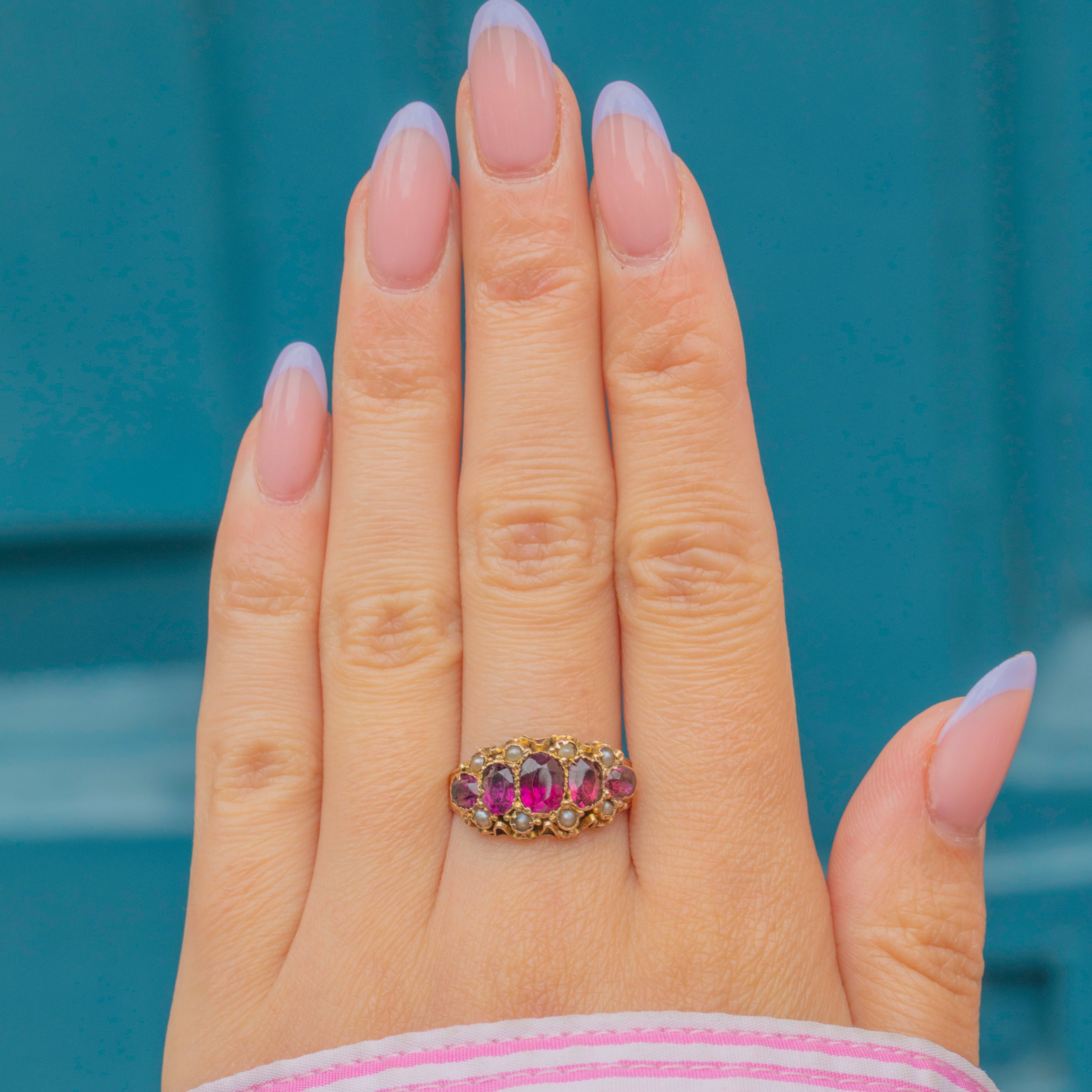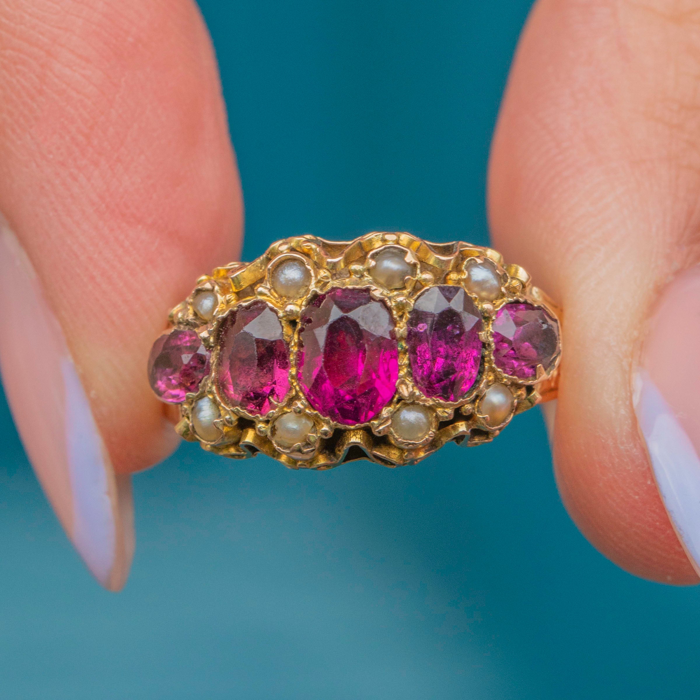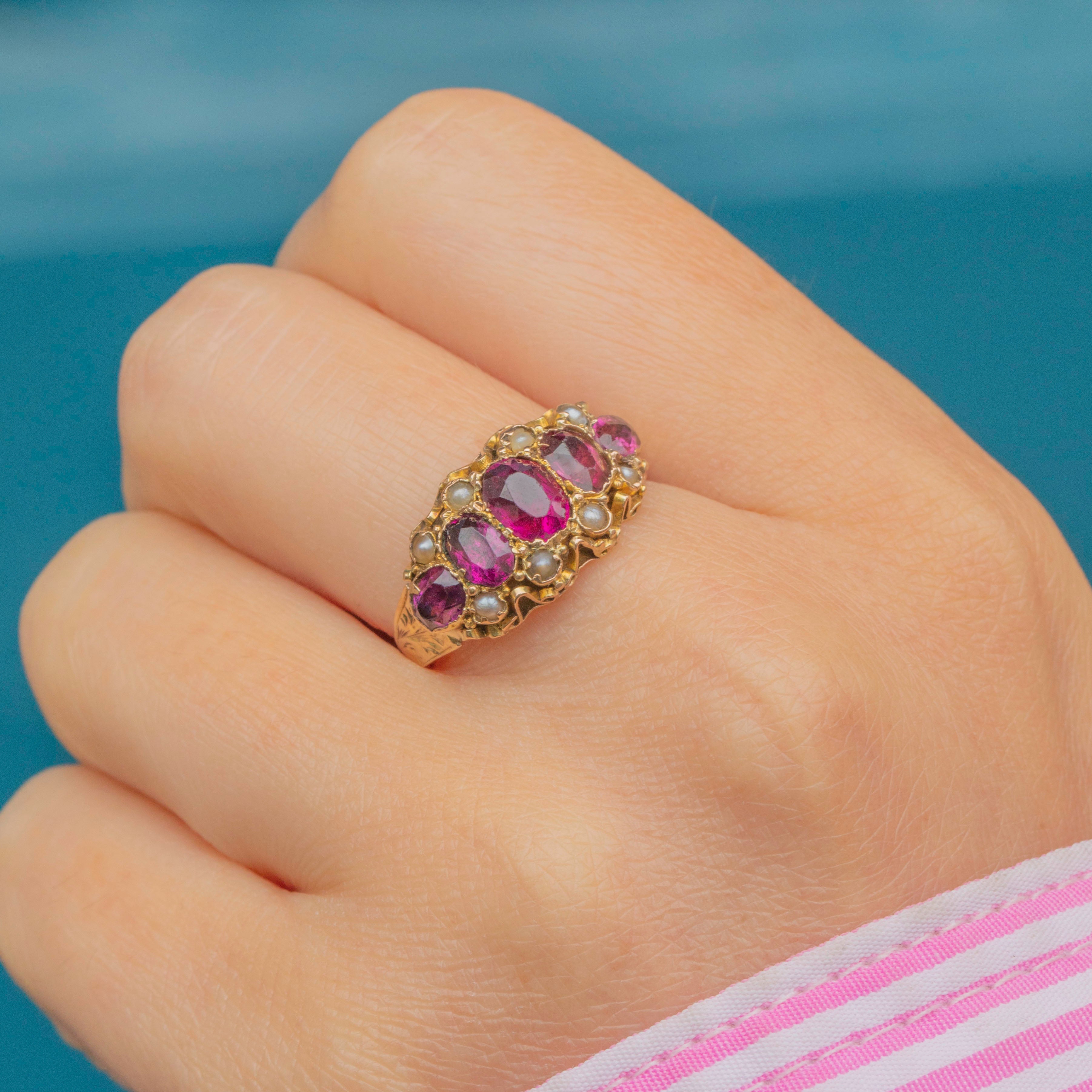 Victorian 9ct Gold Garnet Pearl Five Stone Ring, c.1878
