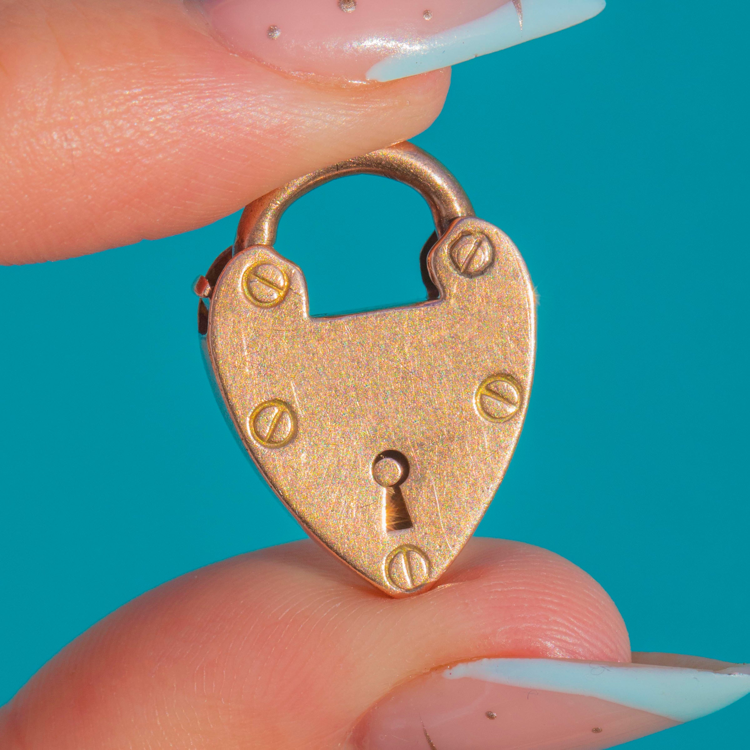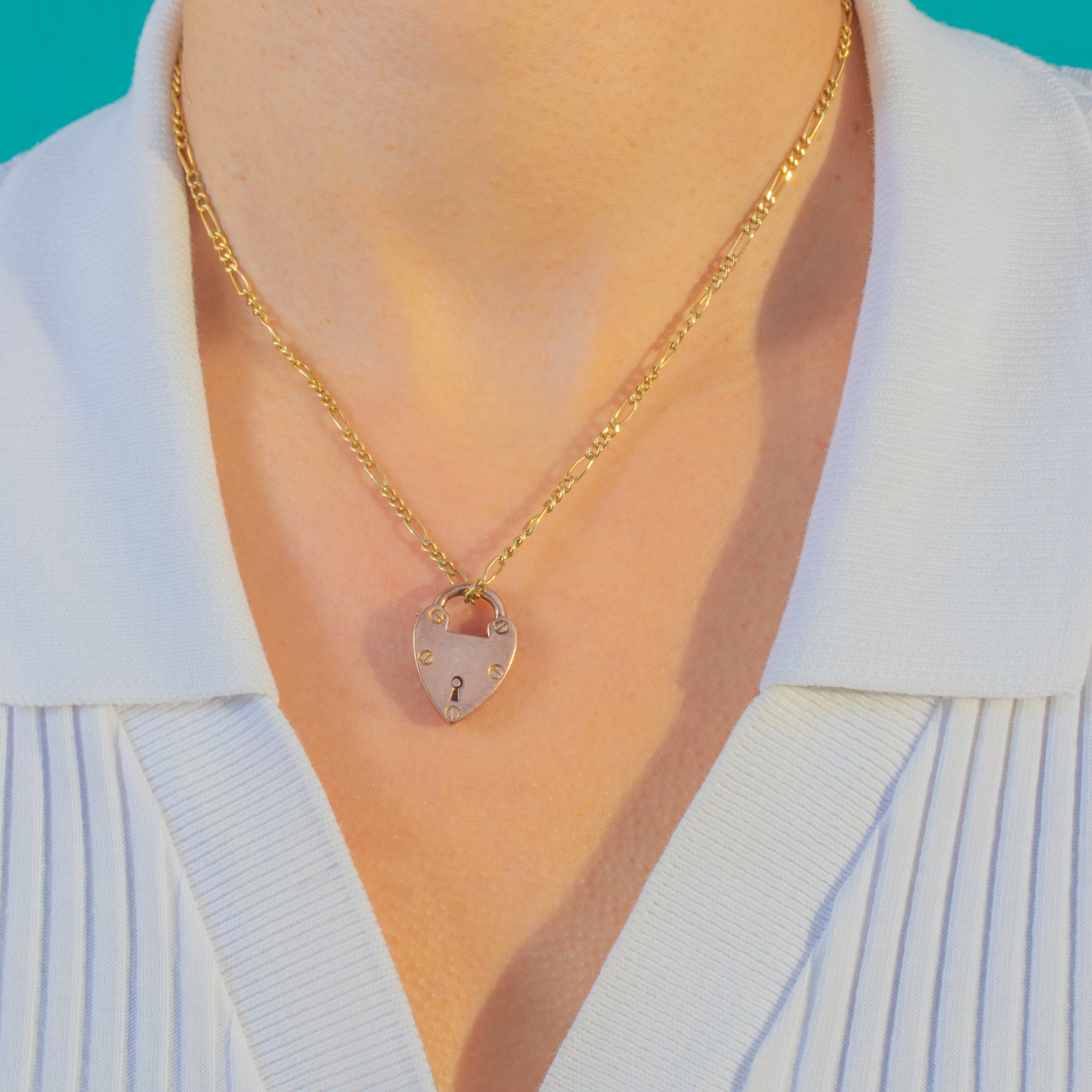 A classic Victorian love token in glowing 9ct Gold, this petite heart padlock pendant pairs romance with a subtle industrial edge. Its smooth heart face is detailed with a decorative keyhole and tiny slotted “screw” accents, all enhanced by a warm, rosy-yellow hue.