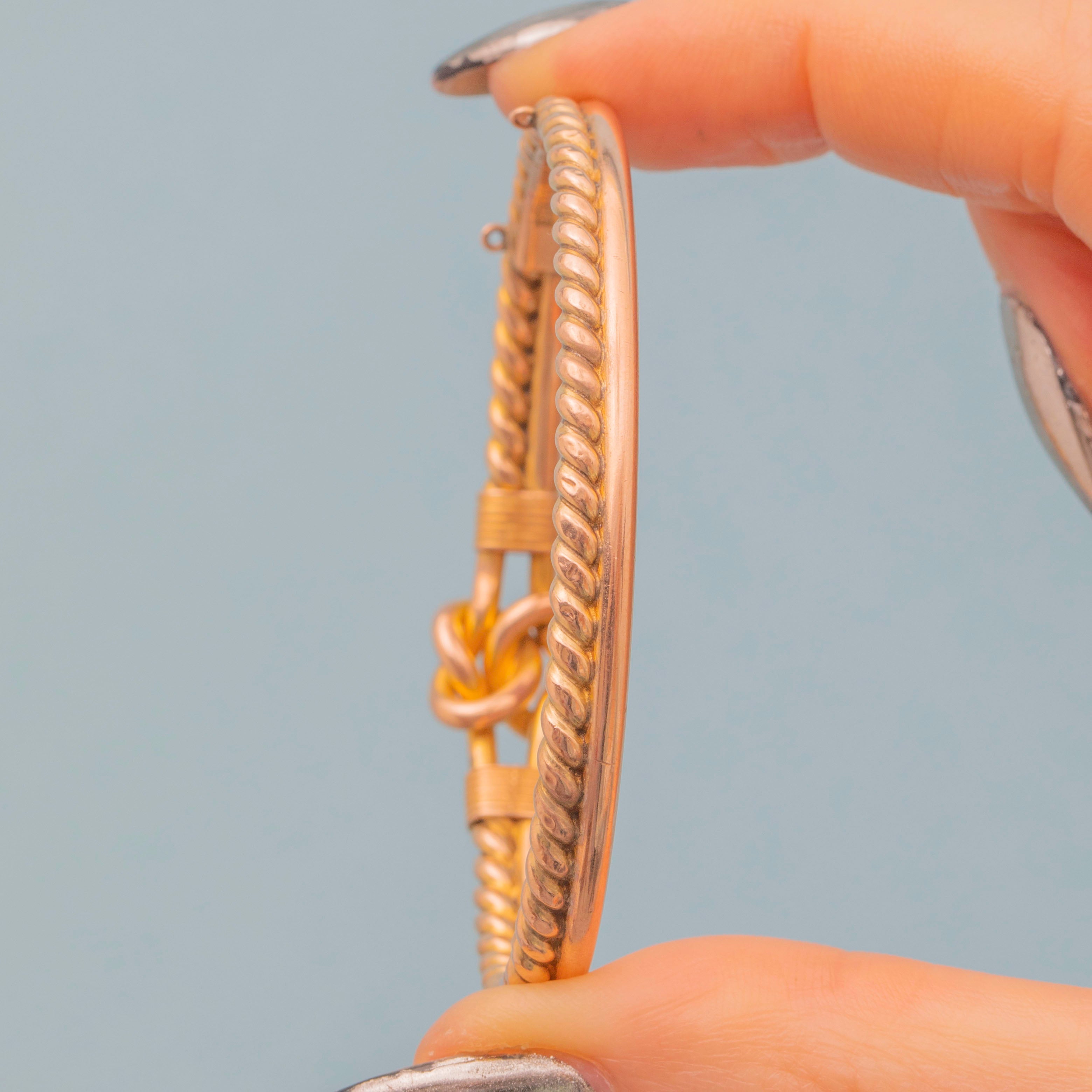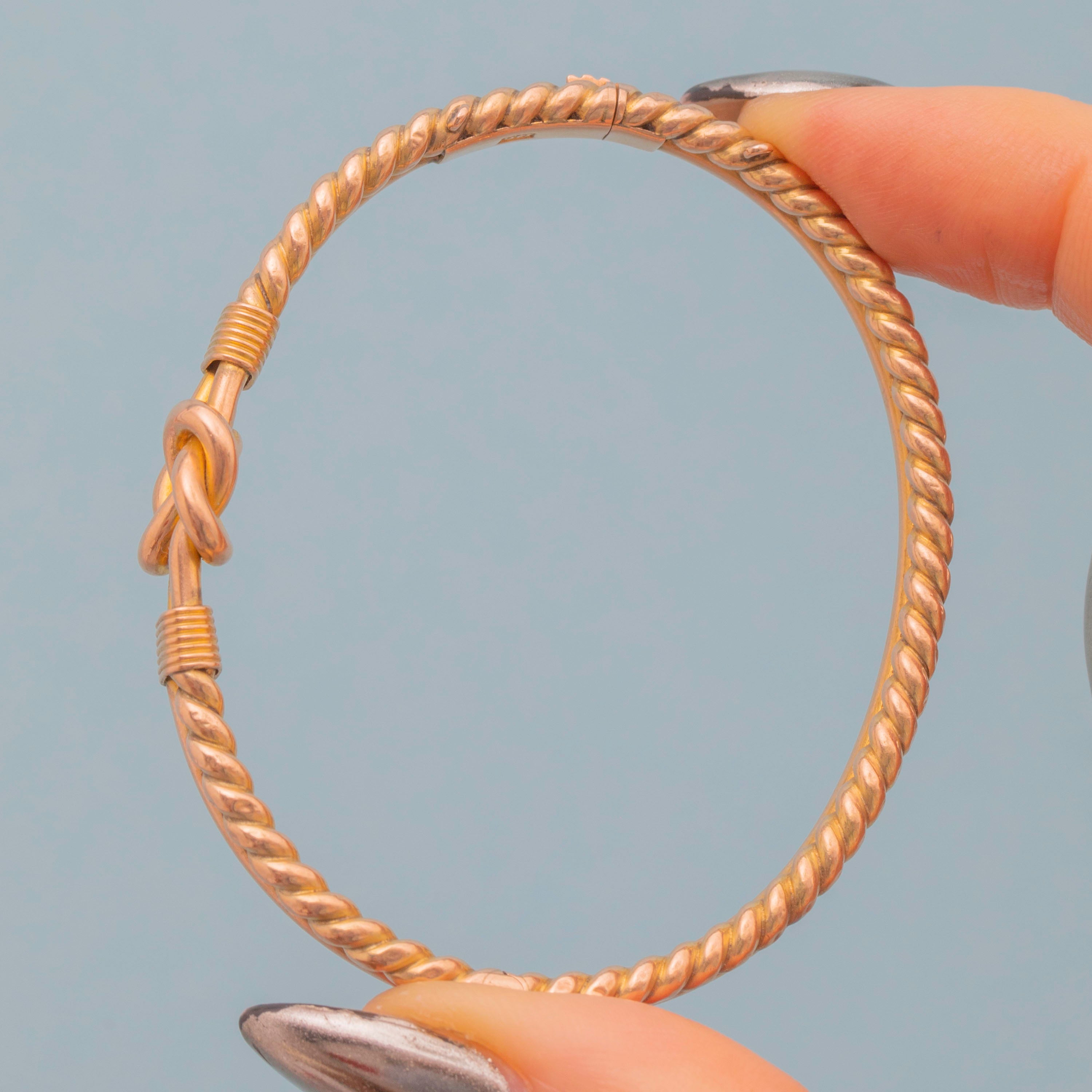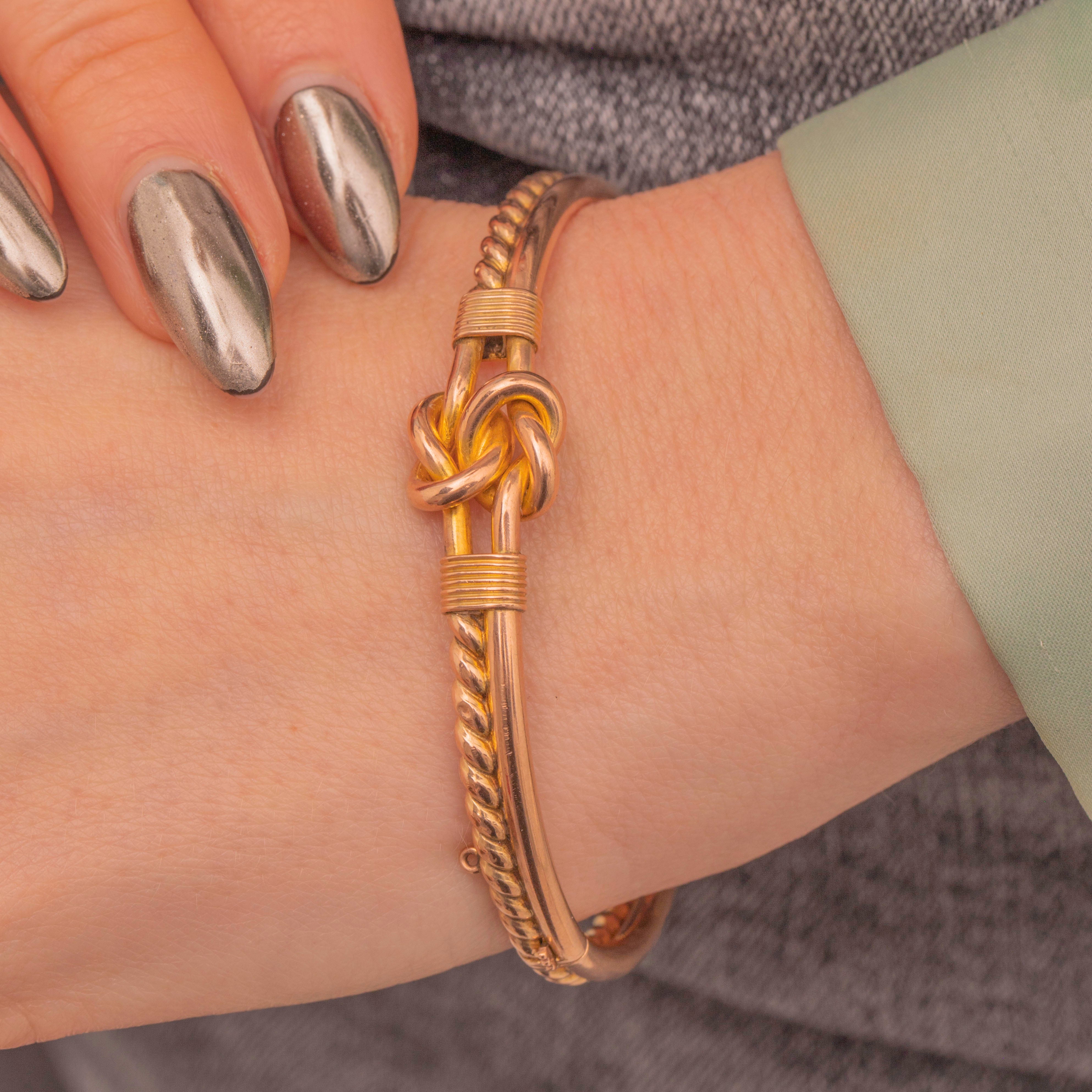 EXCELLENT: This Victorian 9ct Gold lover's knot bangle is in wonderful condition throughout. The 9ct Gold is super smooth on the inside, which feels beautiful against the skin, and she shuts securely with a nice 'click'. A Victorian piece steeped in sentiment, she is sure to bring joy to its receiver!