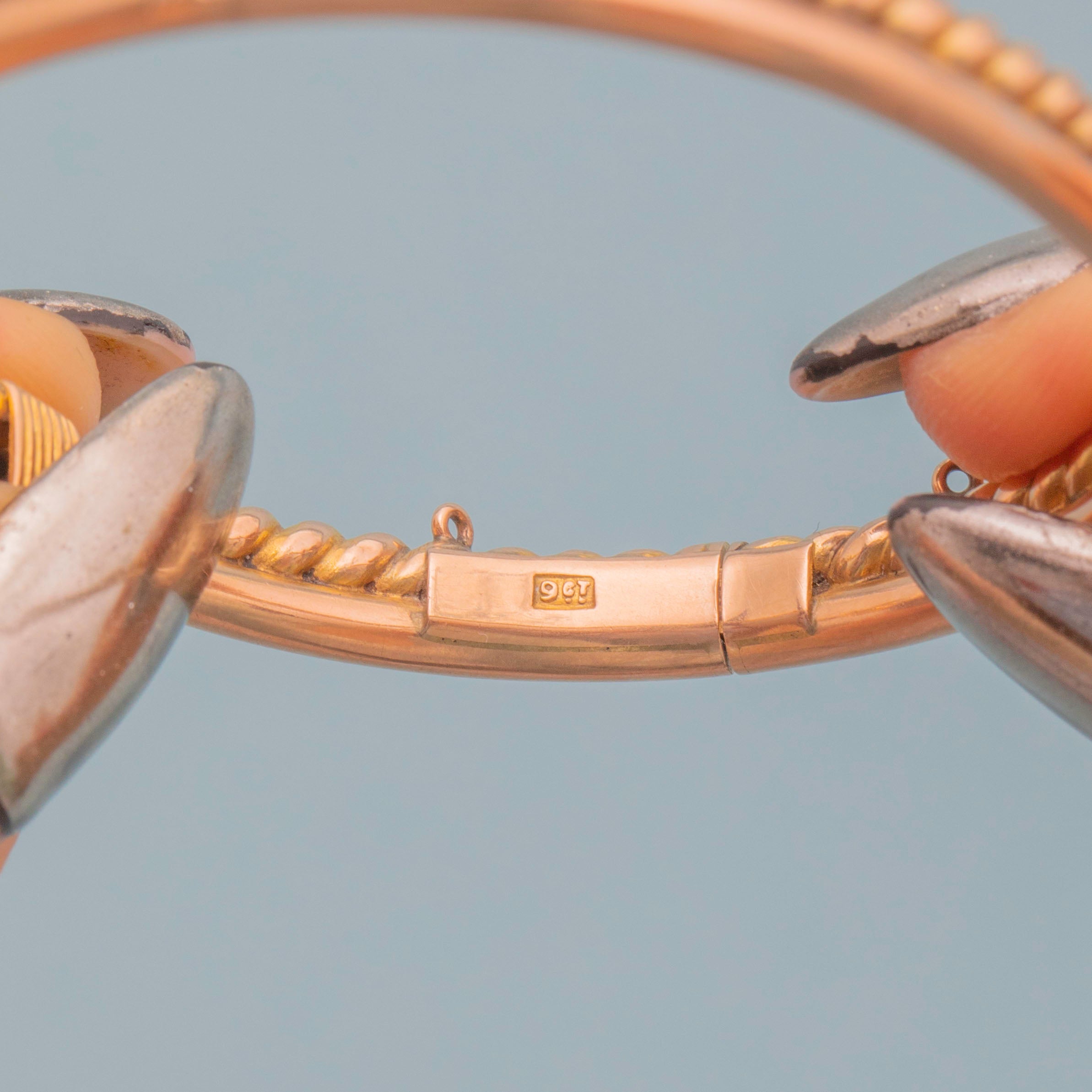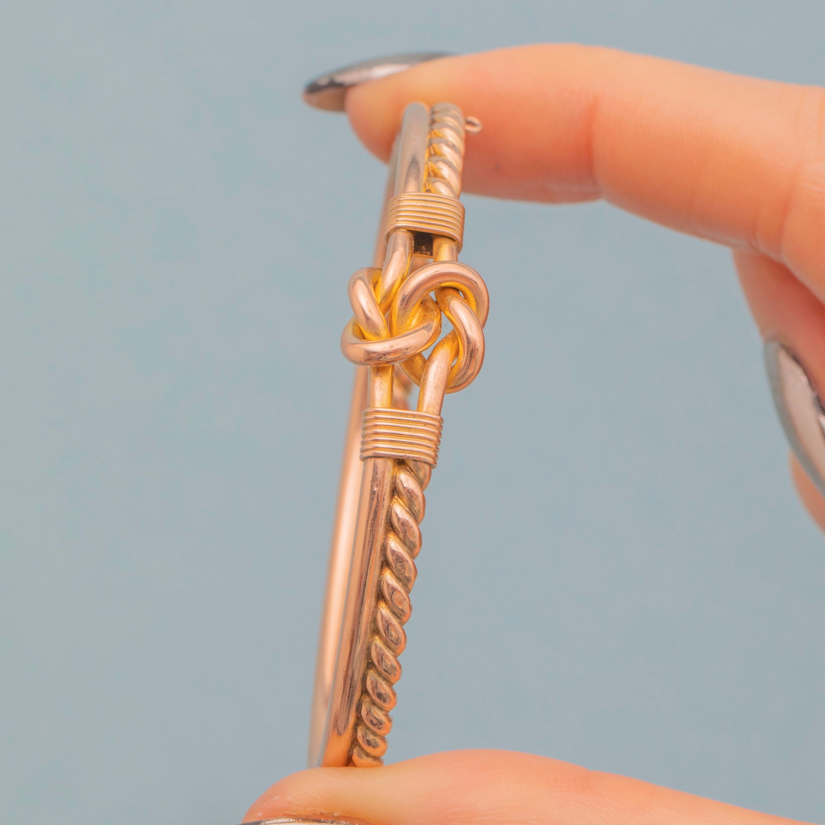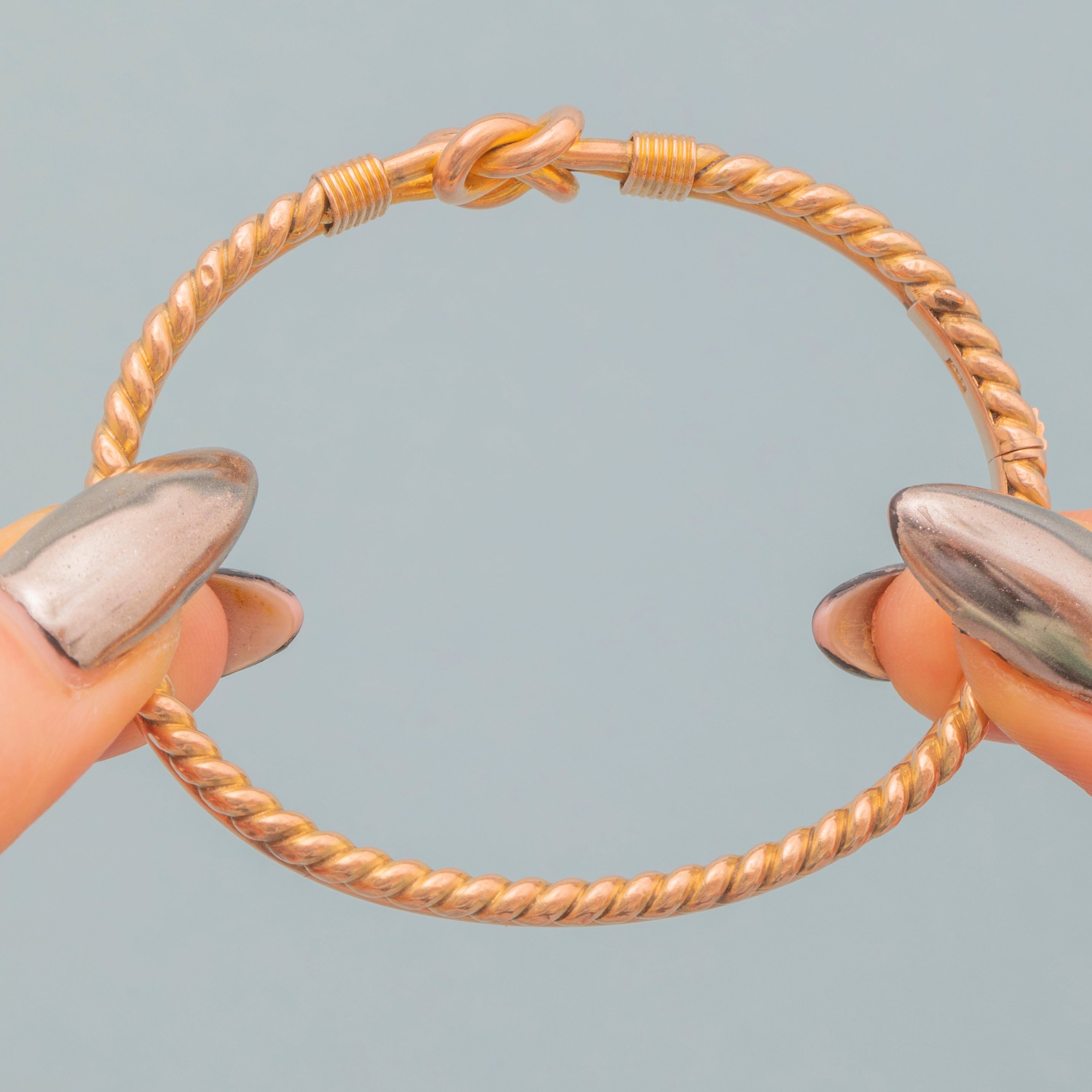 EXCELLENT: This Victorian 9ct Gold lover's knot bangle is in wonderful condition throughout. The 9ct Gold is super smooth on the inside, which feels beautiful against the skin, and she shuts securely with a nice 'click'. A Victorian piece steeped in sentiment, she is sure to bring joy to its receiver!