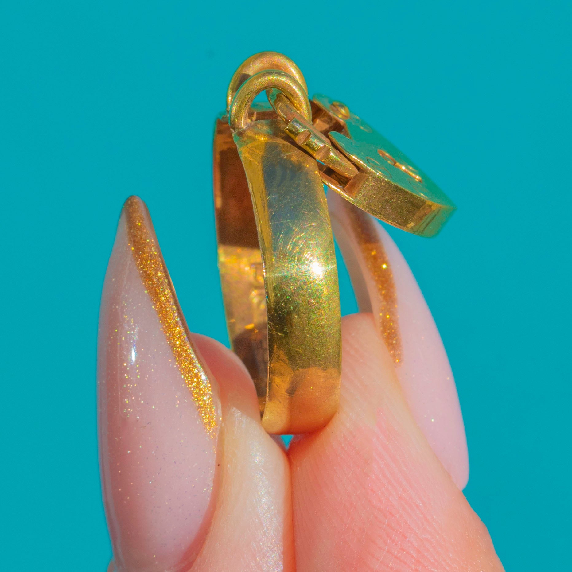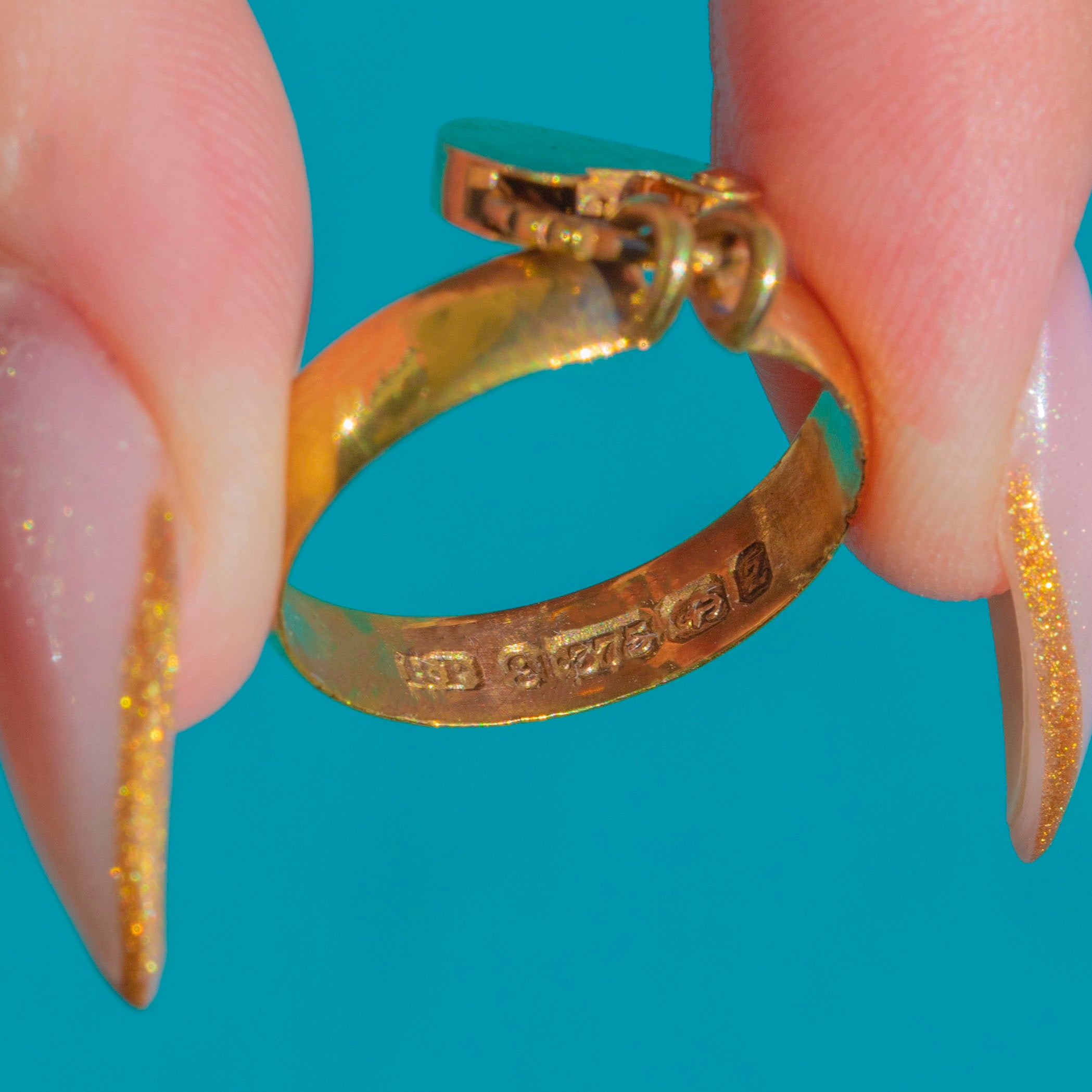 A rare and romantic Victorian padlock ring dated to 1899, crafted in solid 9ct Gold. The tiny functioning padlock motif is full of symbolism, representing love, devotion and “locking in” a bond—classic sentimentality from the late 19th century.
