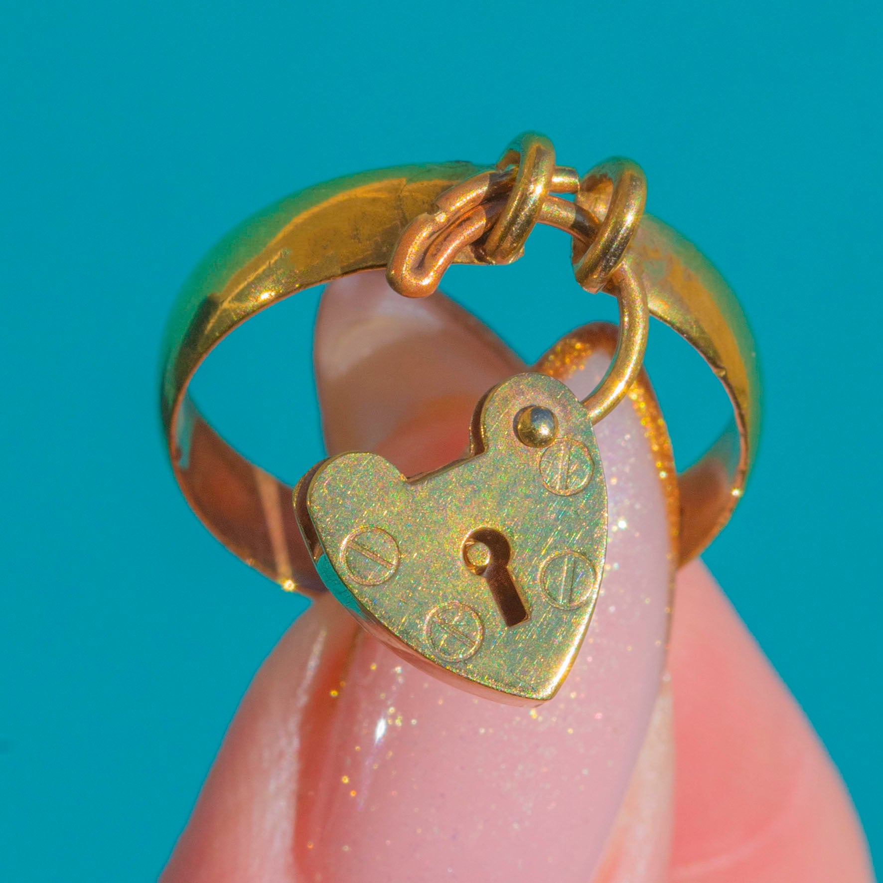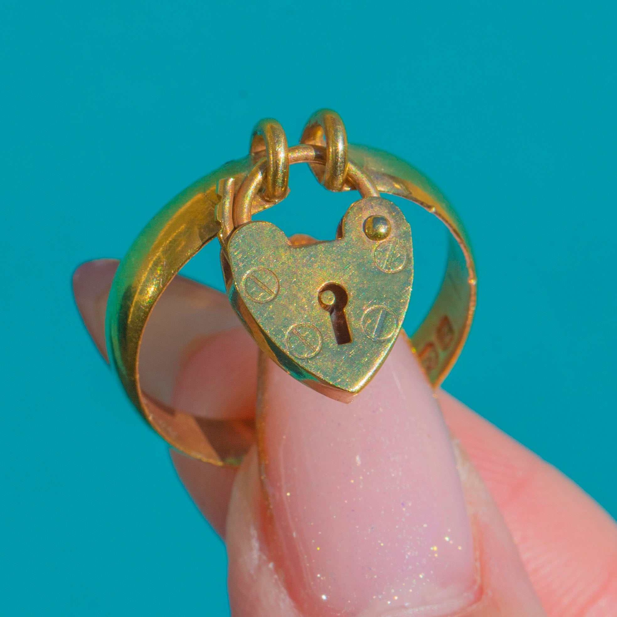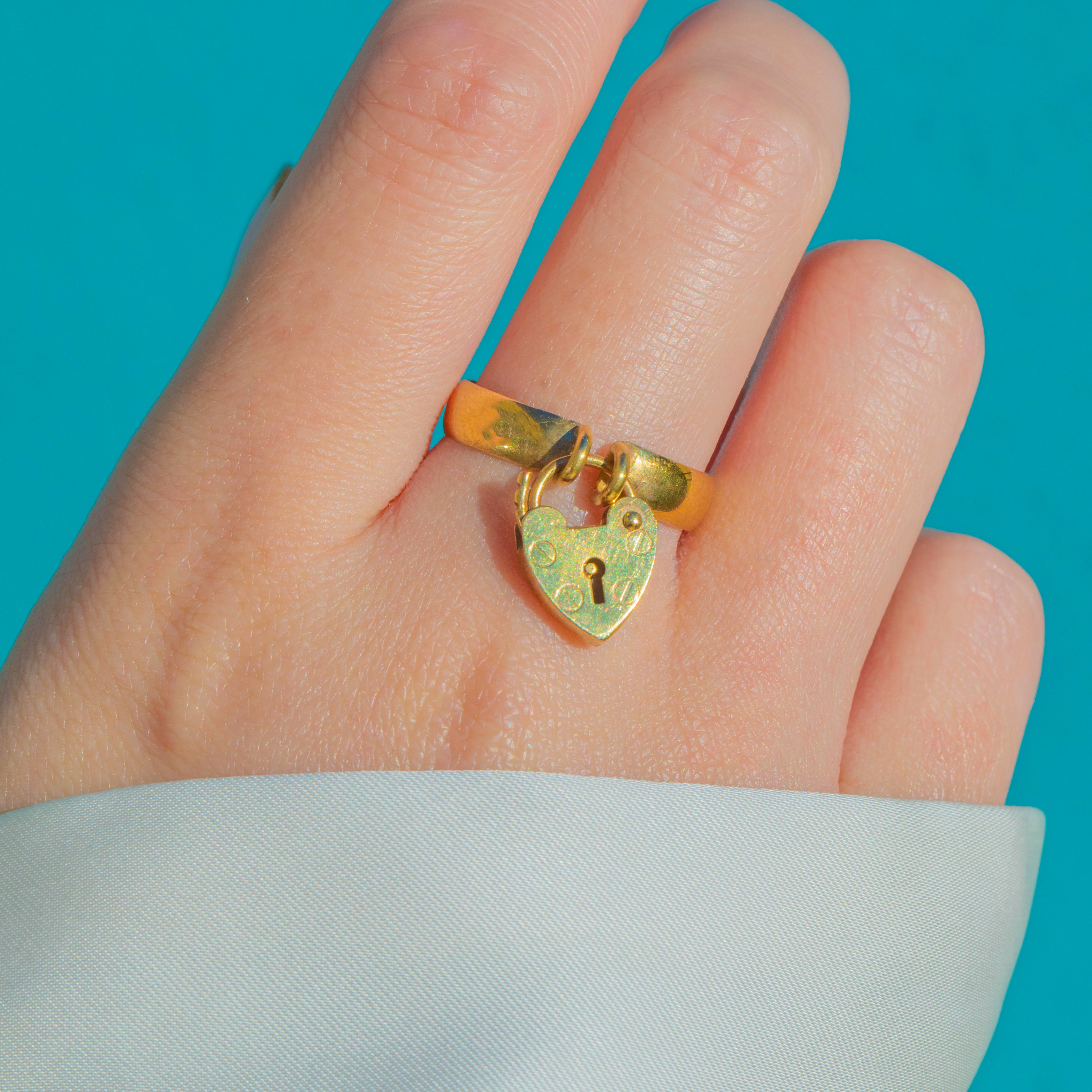 Beautifully made with a smooth 4mm band and a sweet miniature padlock front, this piece is wonderfully wearable as a ring or keepsake jewel. An ideal treasure for collectors of antique symbolism.