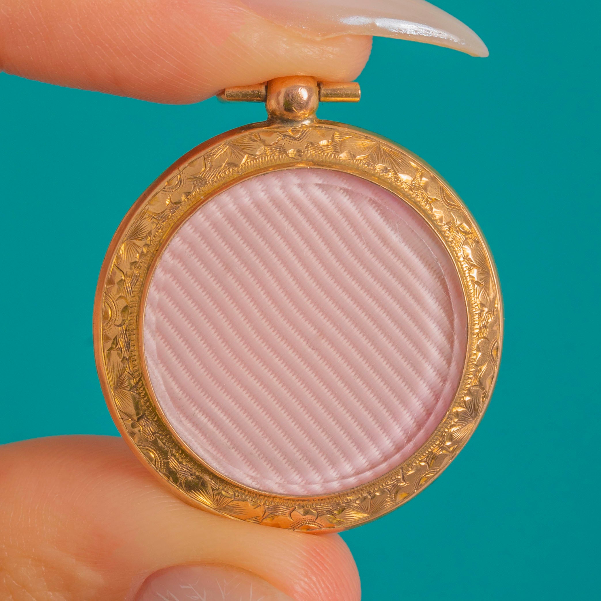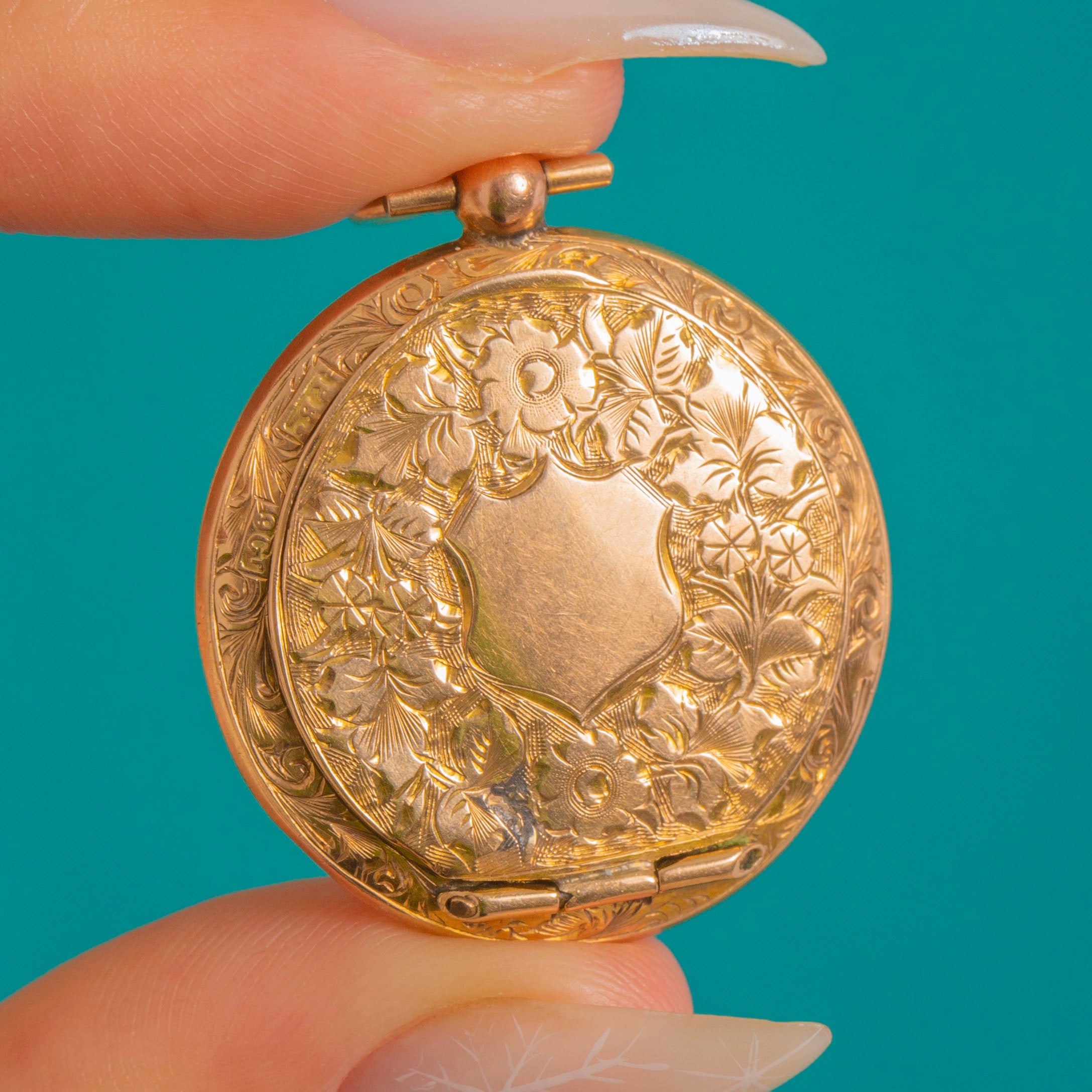 A dreamy late Victorian picture locket in 9ct Gold, its front glowing with a richly engraved wreath encircling a blank shield cartouche—poised for a personal monogram or left pristine as a quiet nod to history.