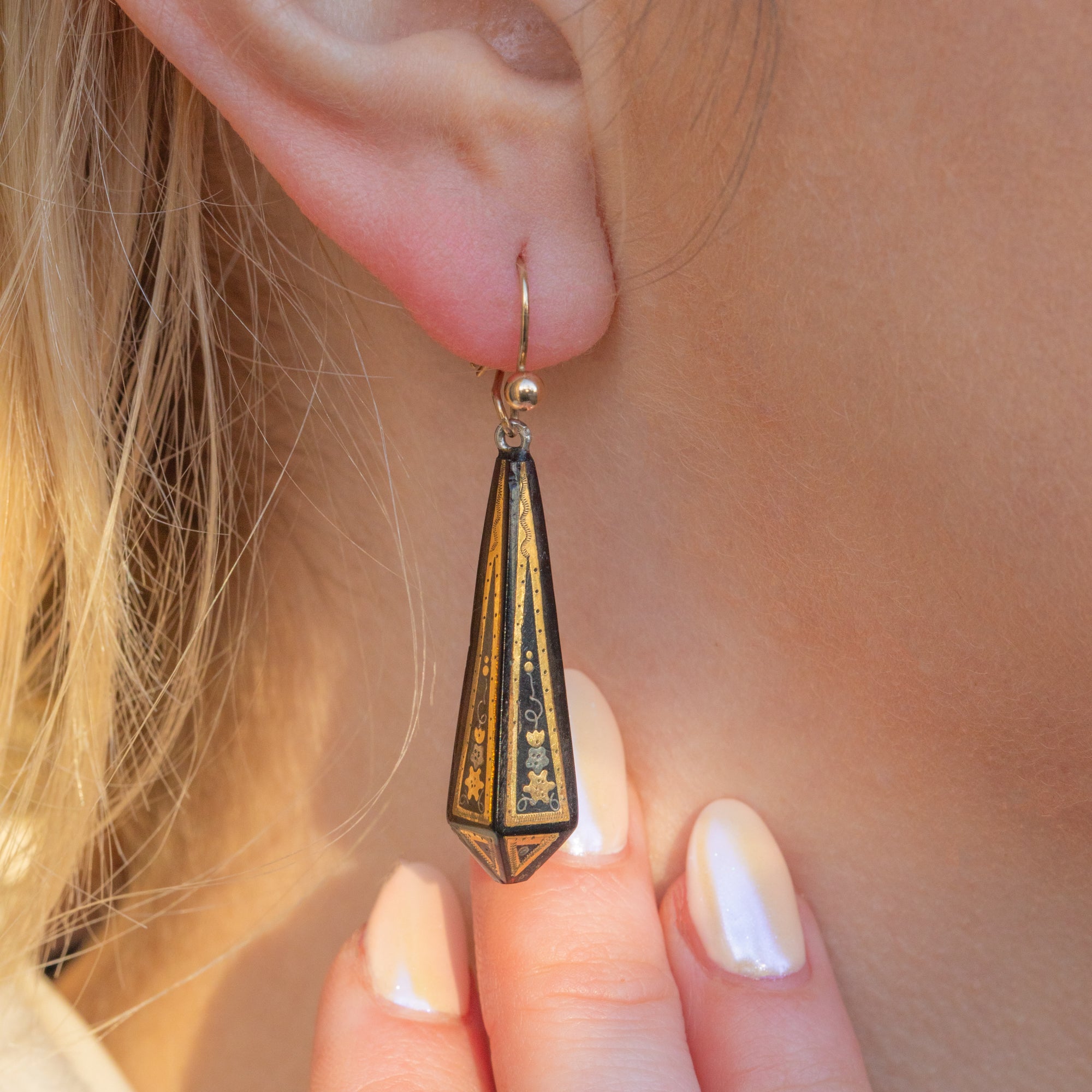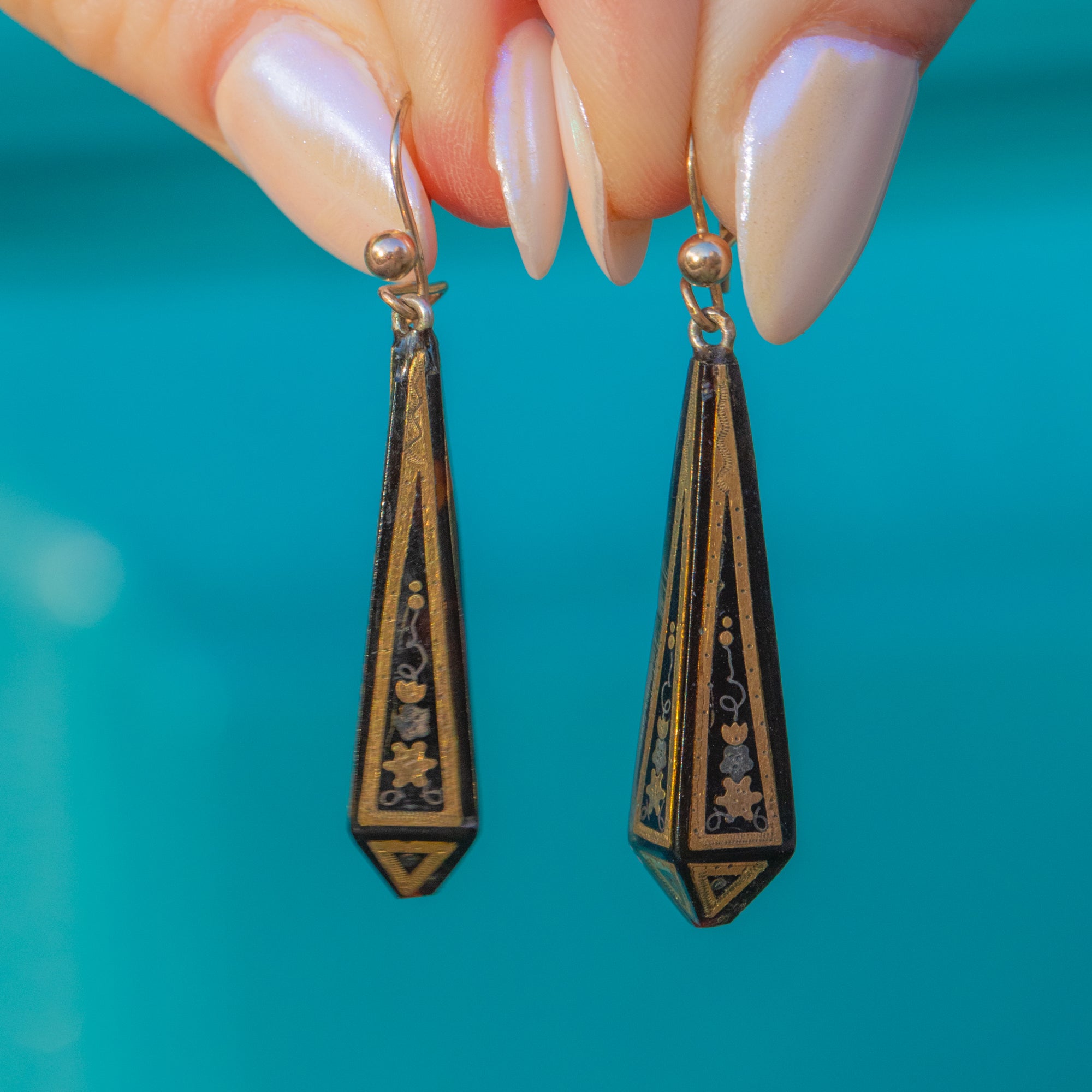 If you have a penchant for unique jewels, these Victorian 9ct Gold Pique floral drop earrings are a must for your collection! Handcrafted from Pique and inlaid with ornate Gold floral details, these antique earrings fall elegantly from the lobes and will provide your outfit with a touch of gothic allure.