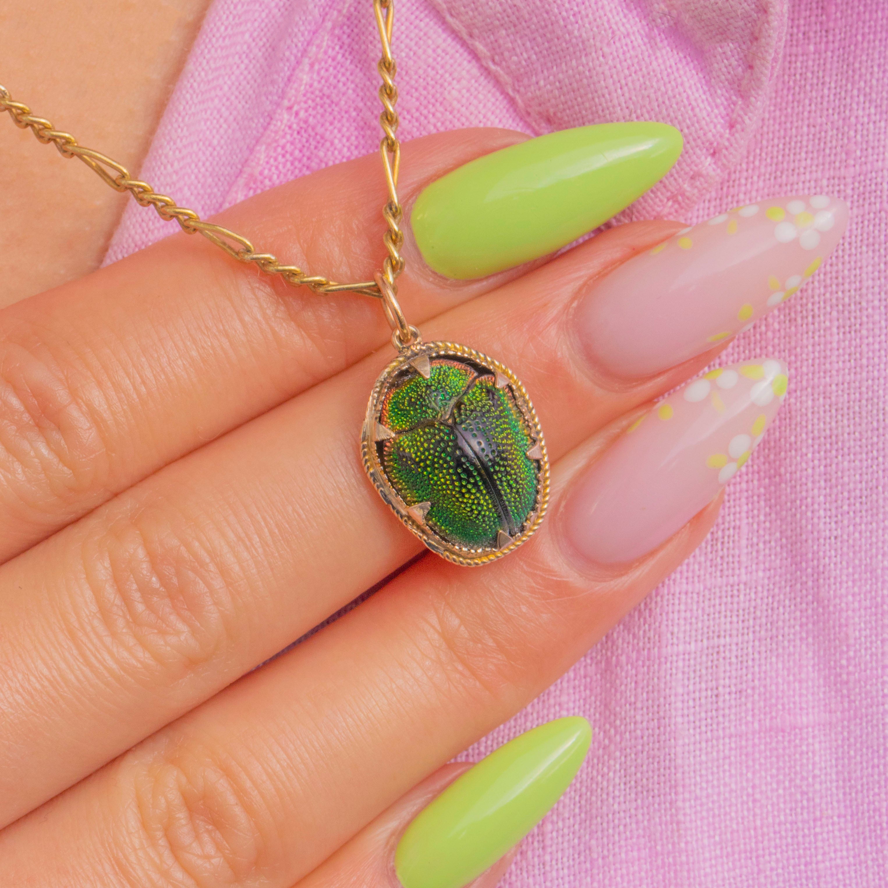 EXCELLENT: The Scarab is glossy with no obvious chips or cracks. The 9ct Gold mount, prongs and jump ring are secure with light surface wear commensurate with age; a small solder line is visible at the bail join, consistent with manufacture.