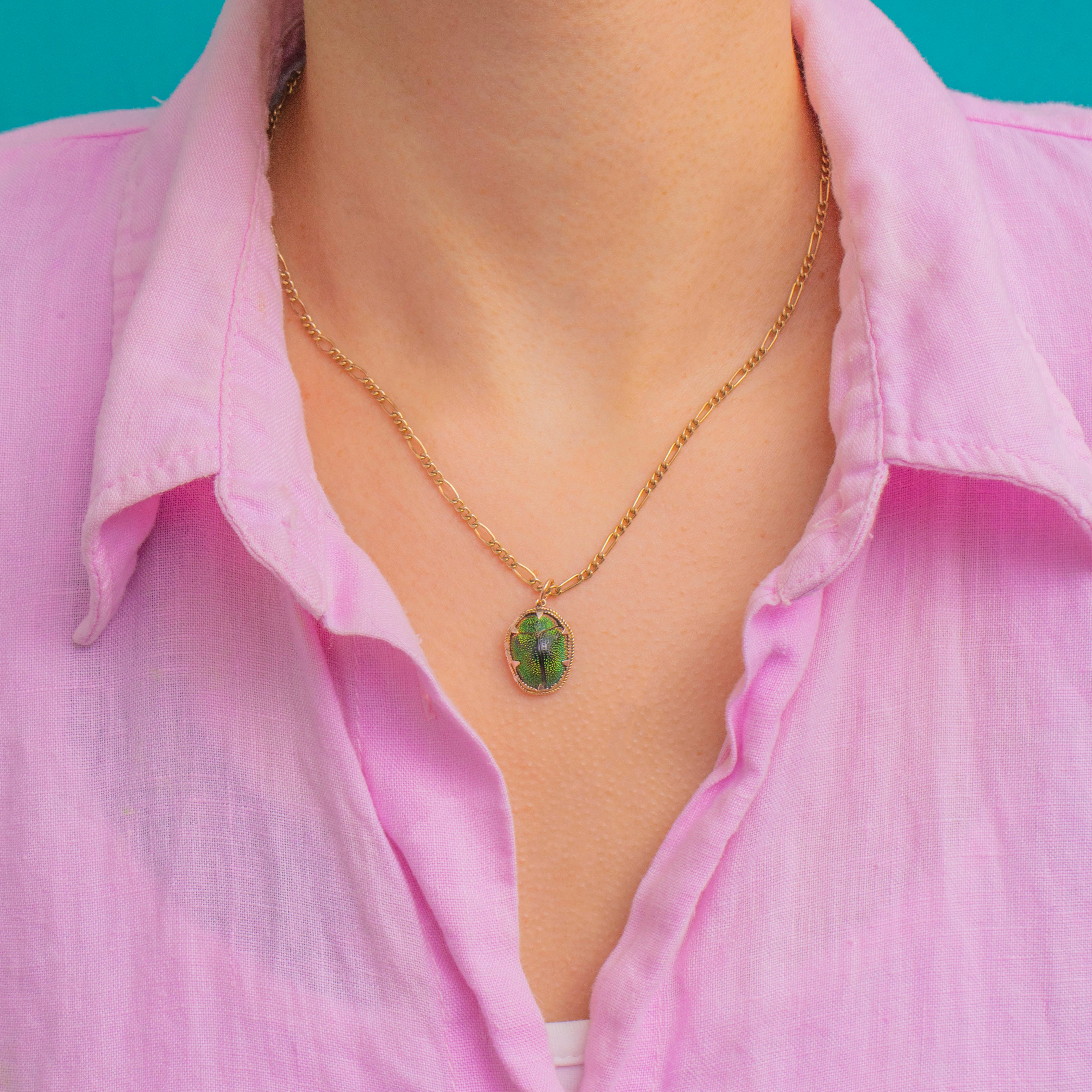 This Victorian 9ct Gold Scarab beetle charm captures nature’s iridescence in a petite, wearable jewel. An oval domed Scarab shimmers in vibrant green, framed by a twisted-rope border and held securely with neat claw prongs for a refined finish. A jump ring completes the design, ready to slip onto your favourite chain or charm bracelet.
