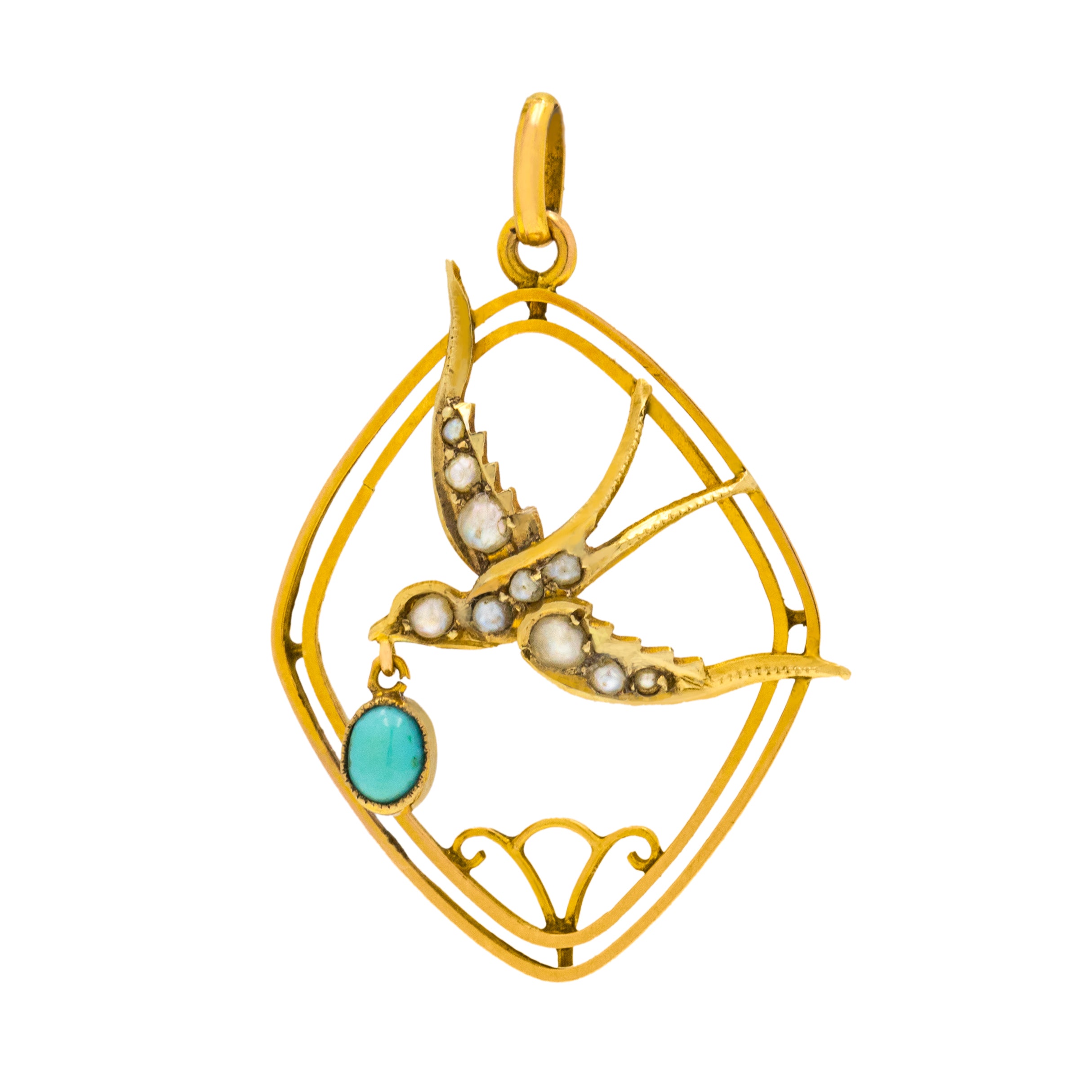 A sweet and emblematic treasure, this Victorian 9ct Gold swallow pendant features delicately curved lines crafted entirely from buttery 9ct Gold with a Pearl-encrusted swallow in flight carrying a vibrant Turquoise cabochon.