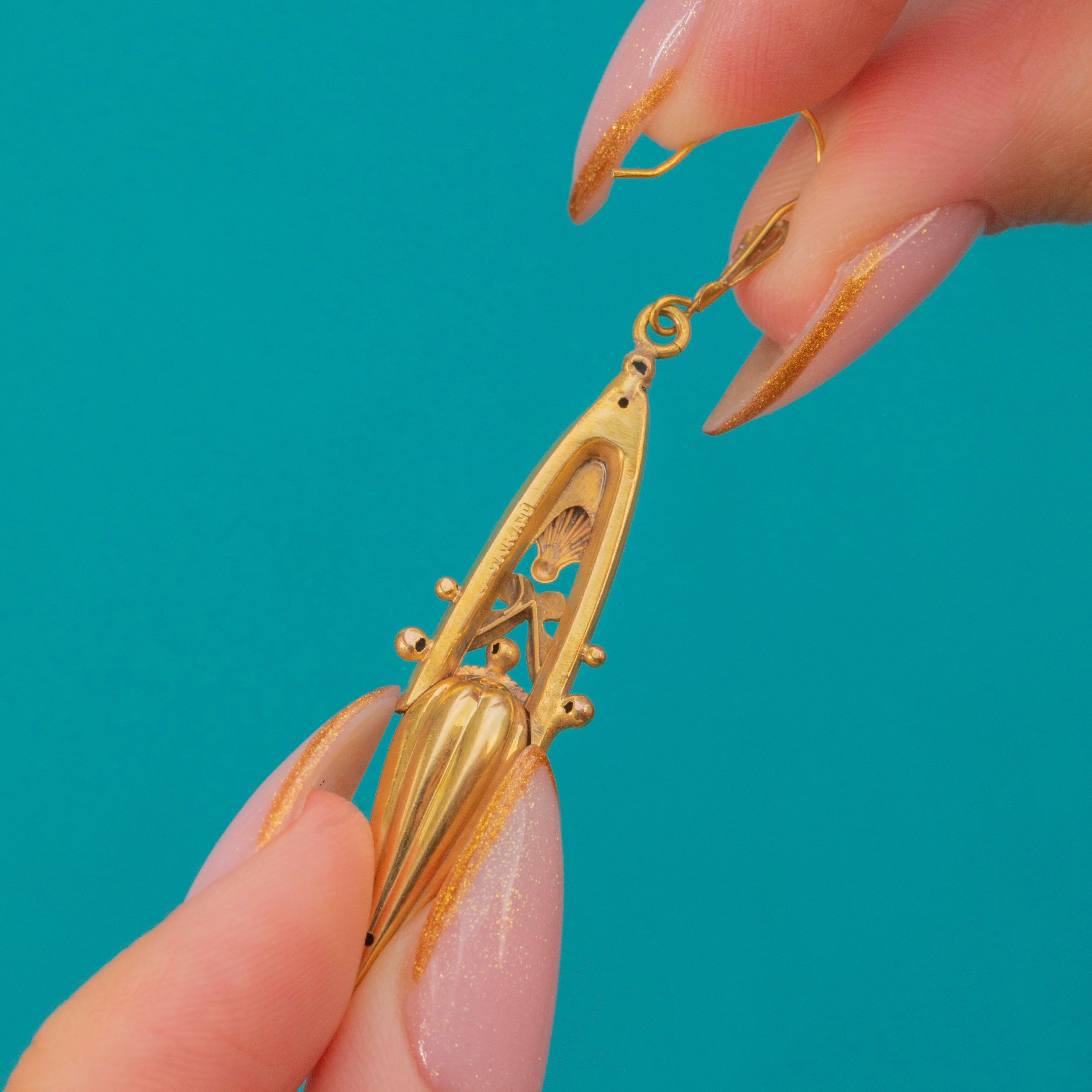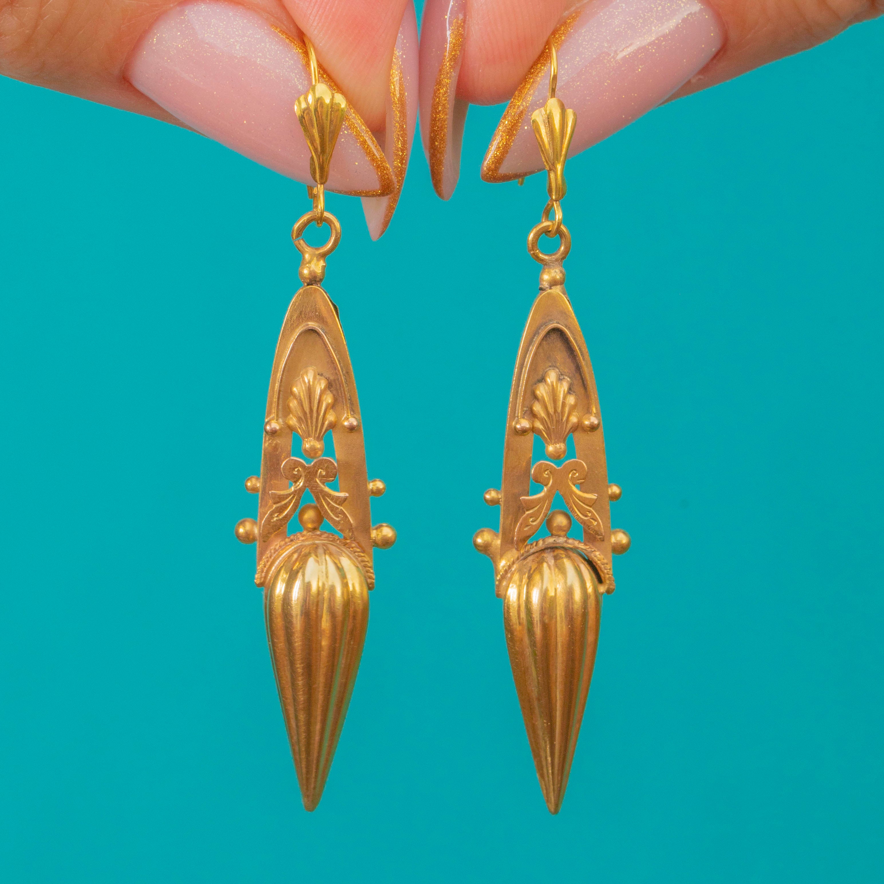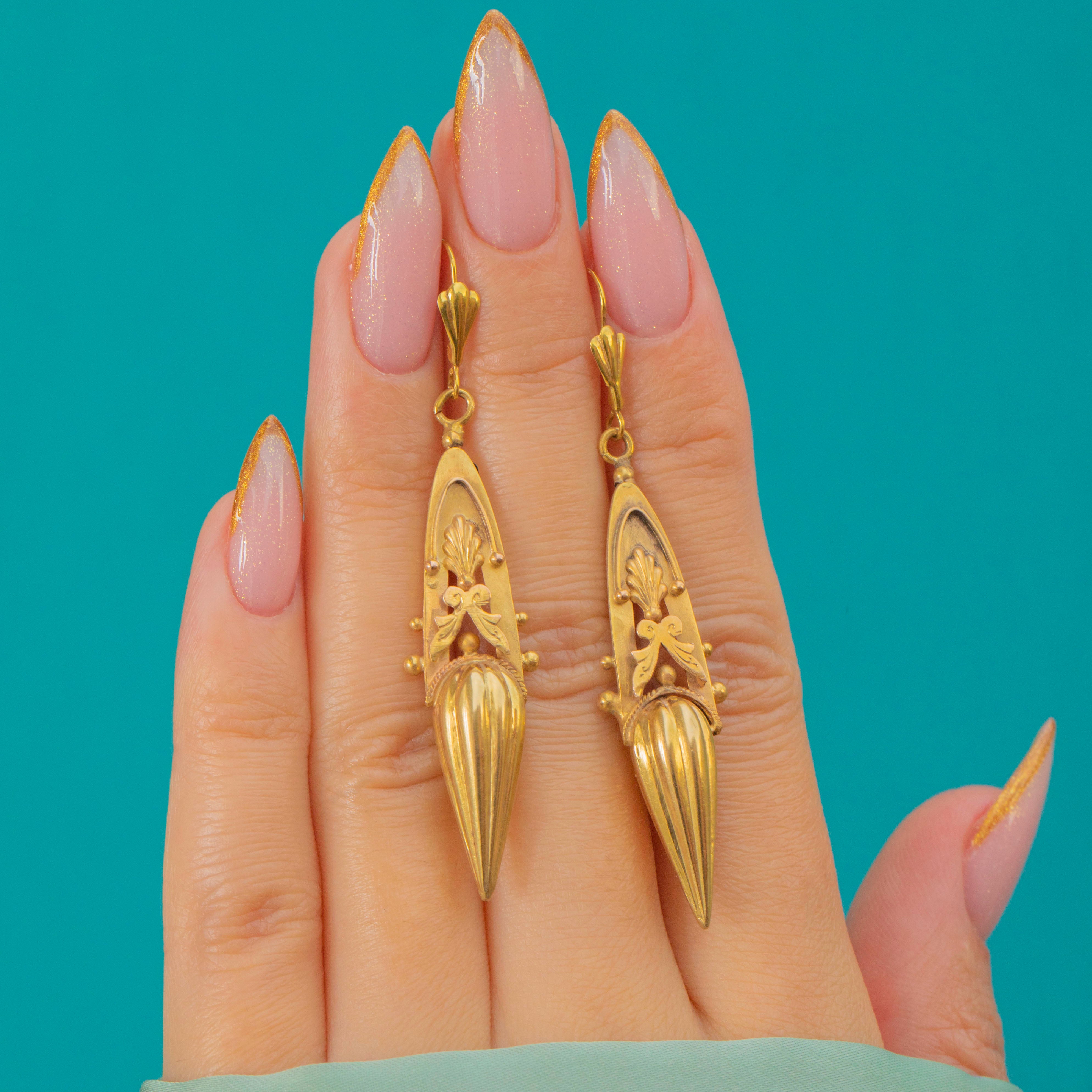 These striking Victorian torpedo earrings are a perfect example of the bold and sculptural style of the 19th century. Crafted entirely in rich 9ct Gold, their elongated drops feature classical motifs including shells, scrolls, and applied bead detailing, a true celebration of Victorian design.